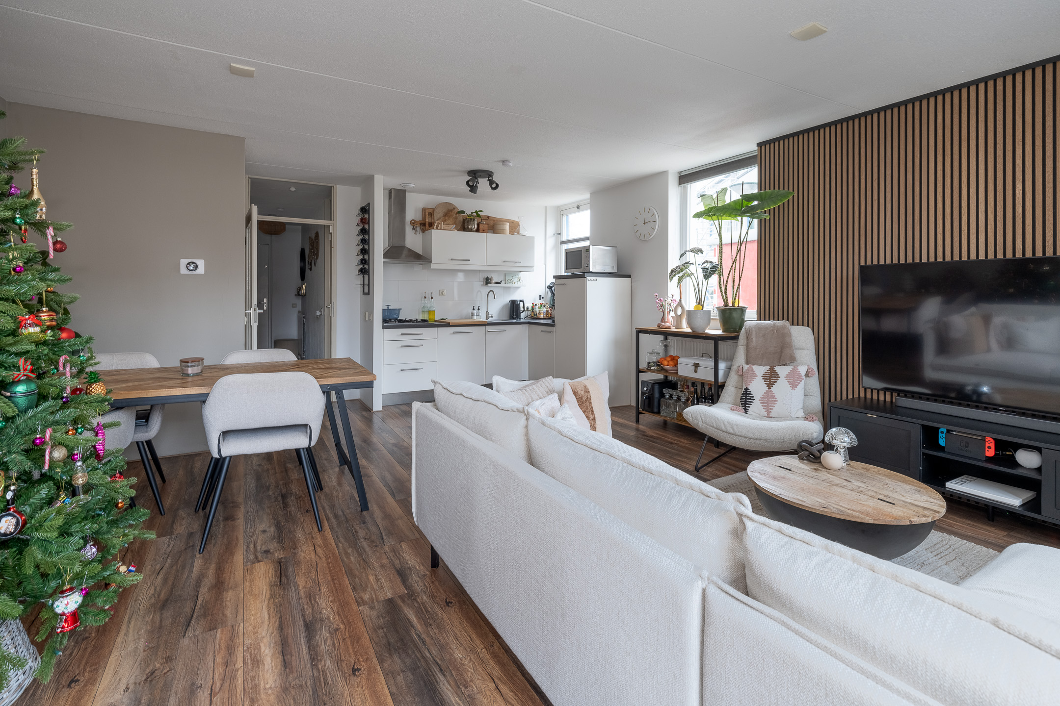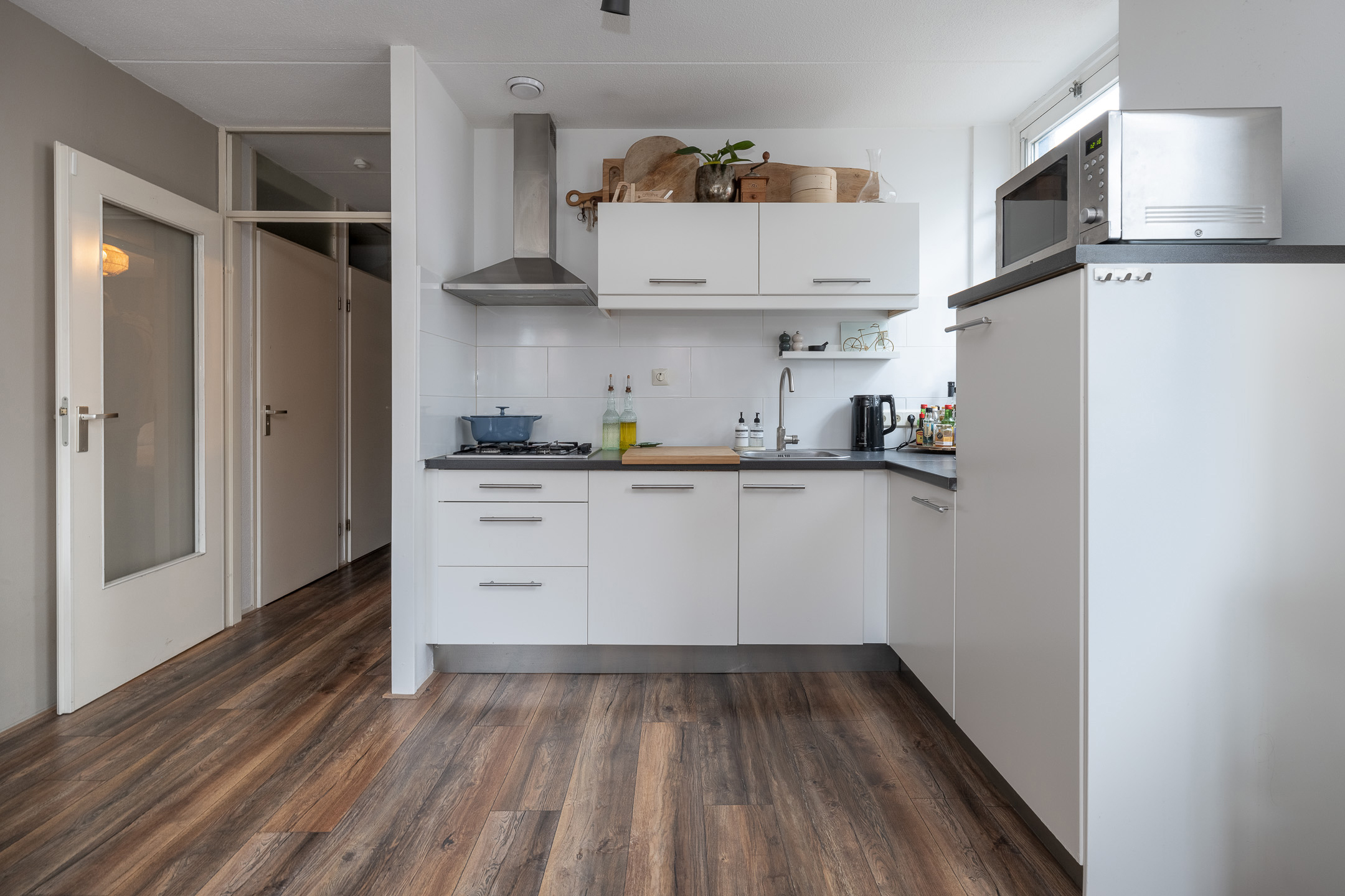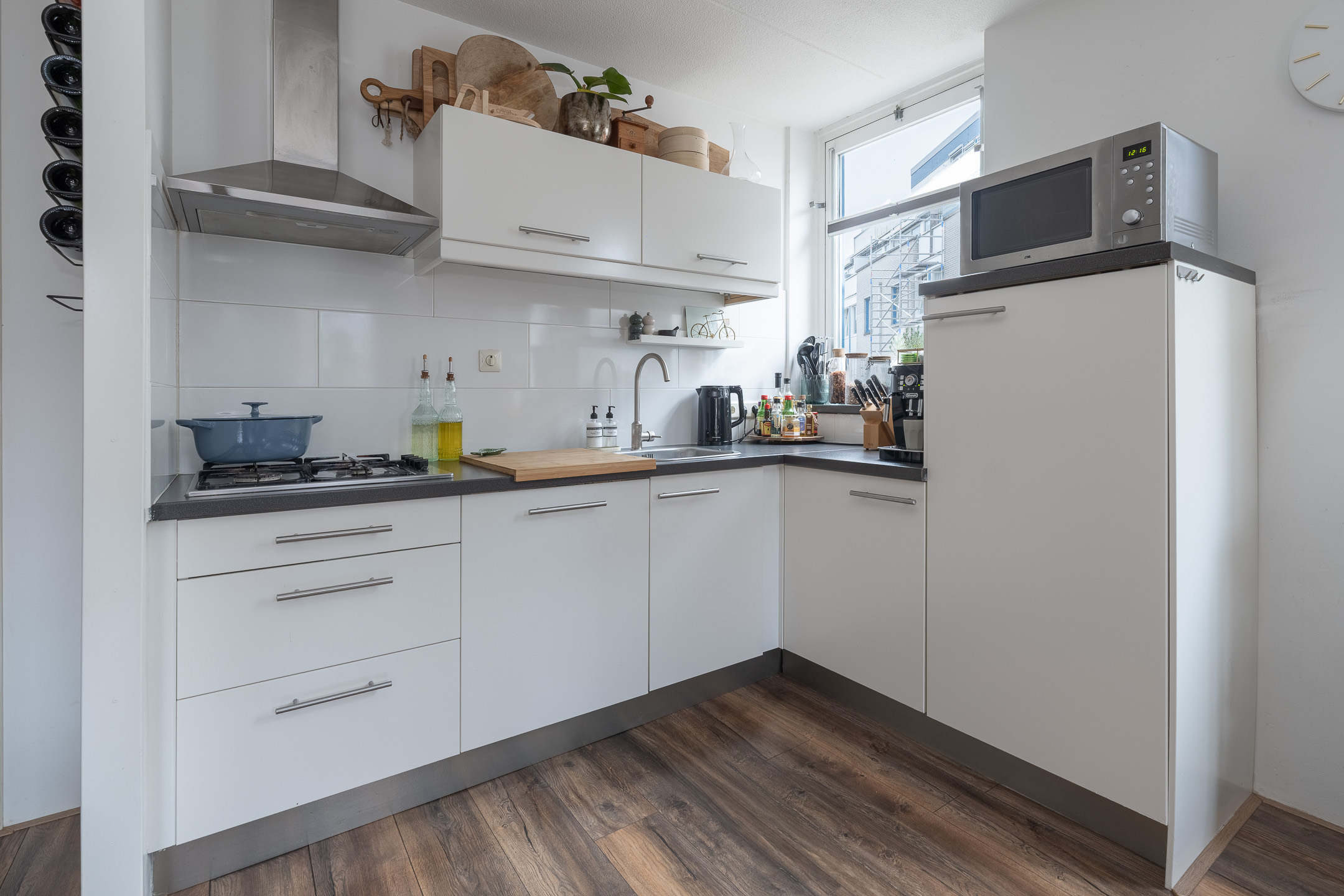 De open woonkamer is licht en uitnodigend, mede dankzij de grote raampartijen en de schuifpui naar buiten. De strakke, witte hoekkeuken met grijs aanrechtblad is uitgerust met diverse inbouwapparatuur, waaronder een 4-pits gasfornuis, vaatwasser en koelkast.