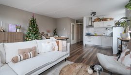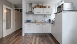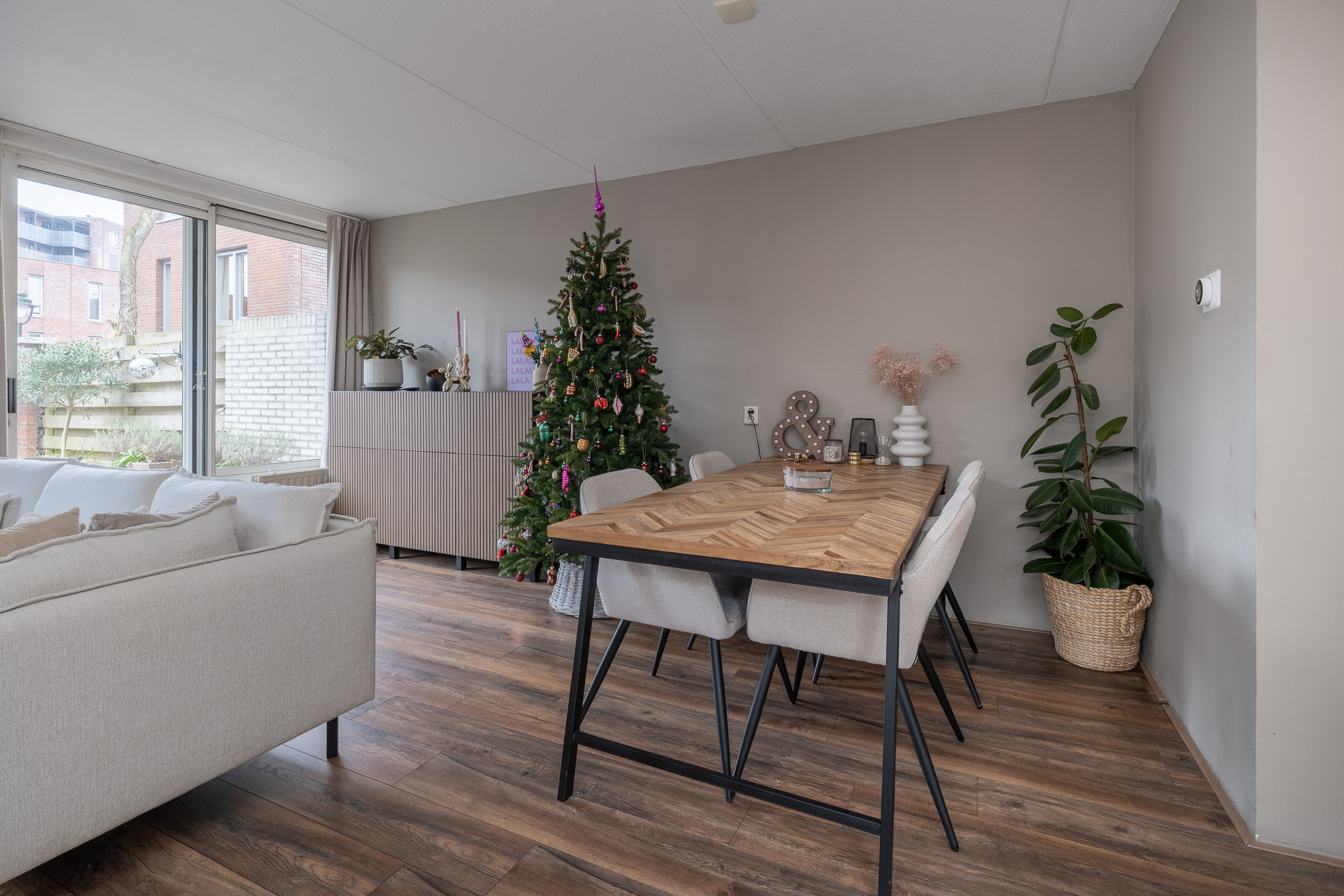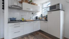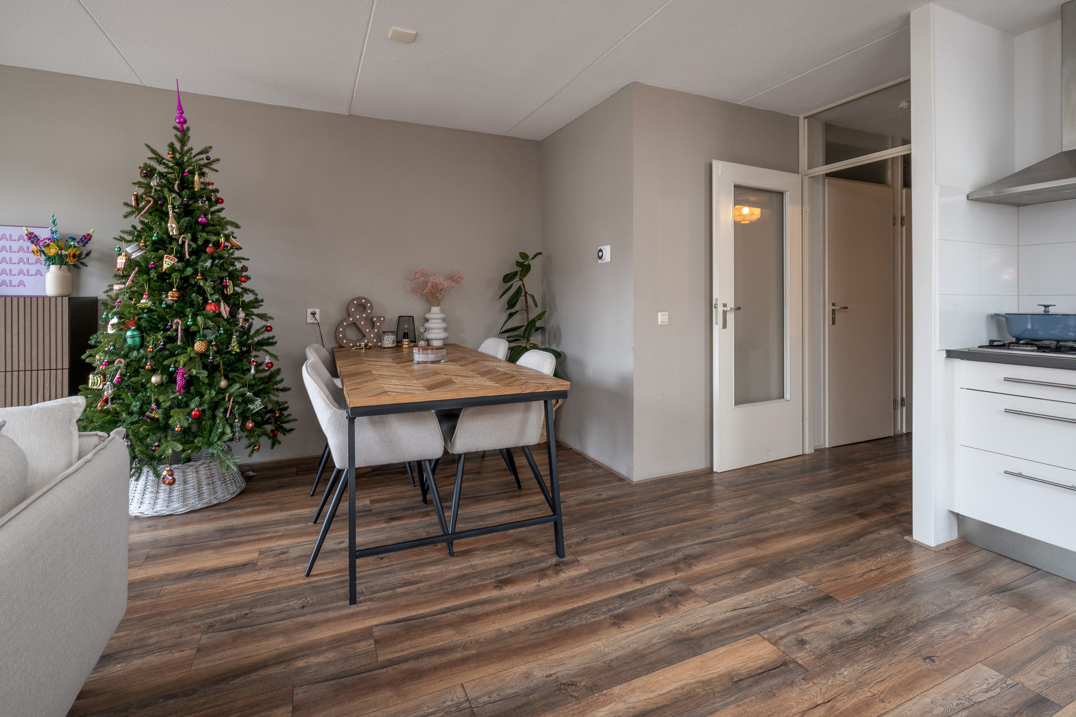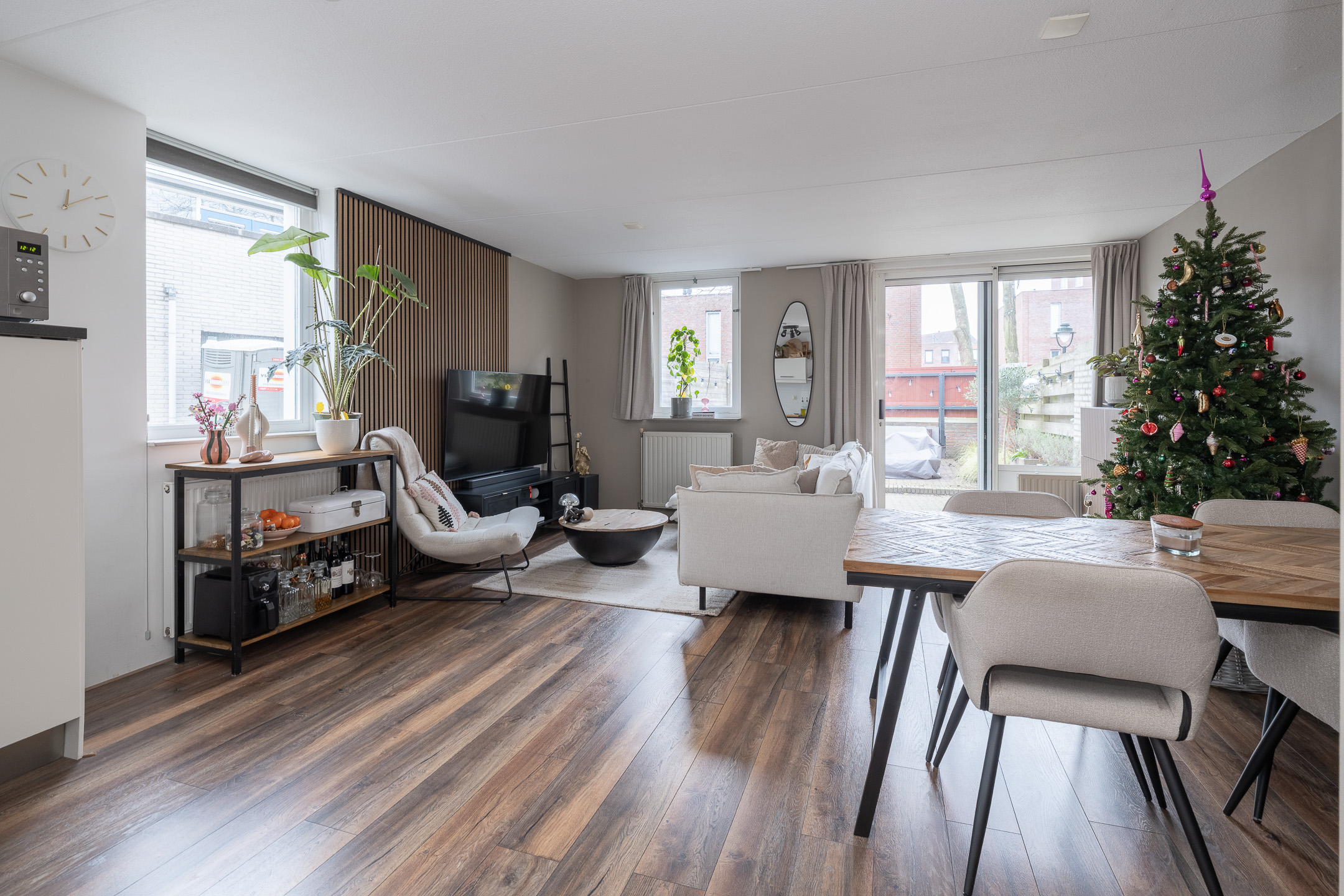 De open woonkamer is licht en uitnodigend, mede dankzij de grote raampartijen en de schuifpui naar buiten. De strakke, witte hoekkeuken met grijs aanrechtblad is uitgerust met diverse inbouwapparatuur, waaronder een 4-pits gasfornuis, vaatwasser en koelkast.