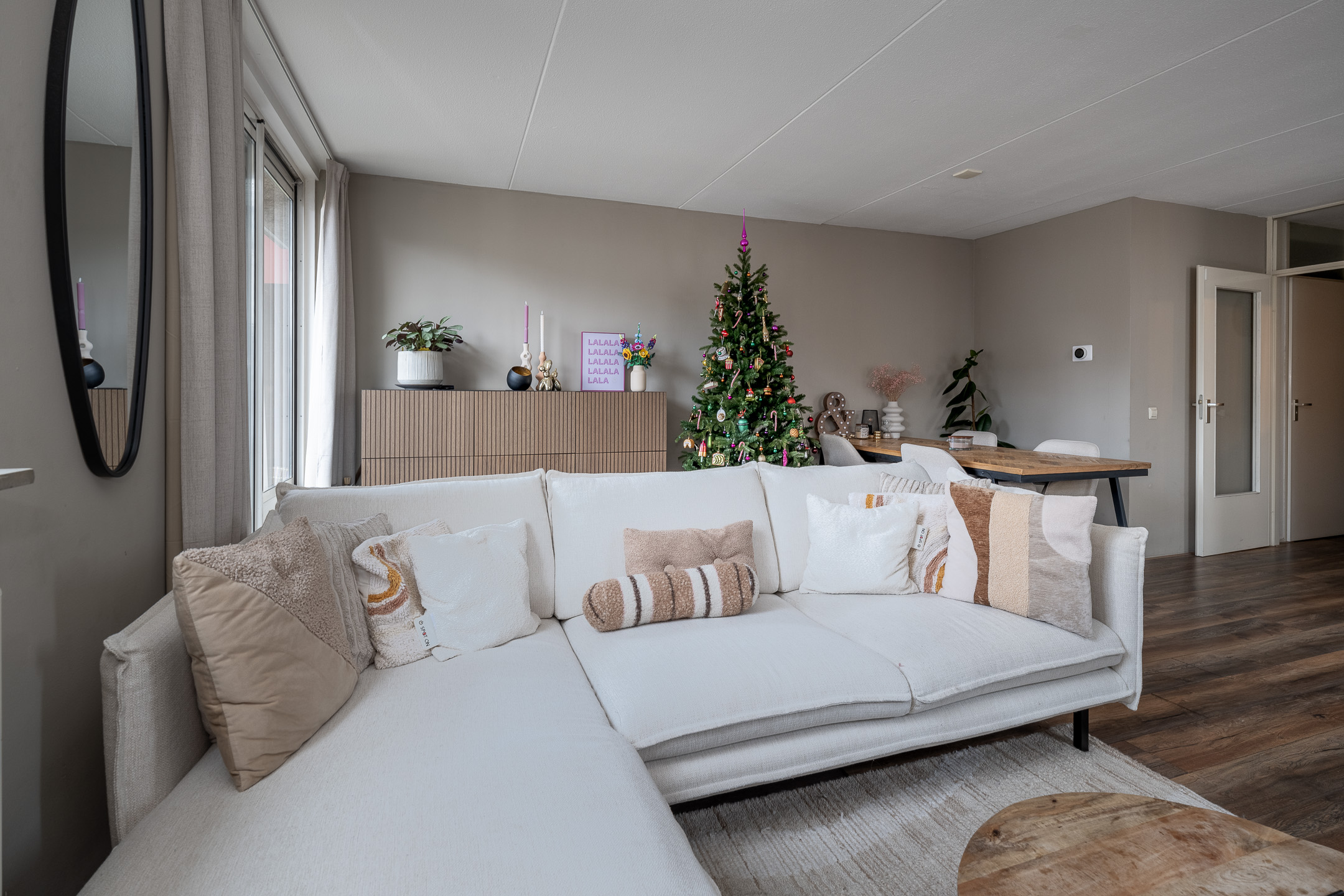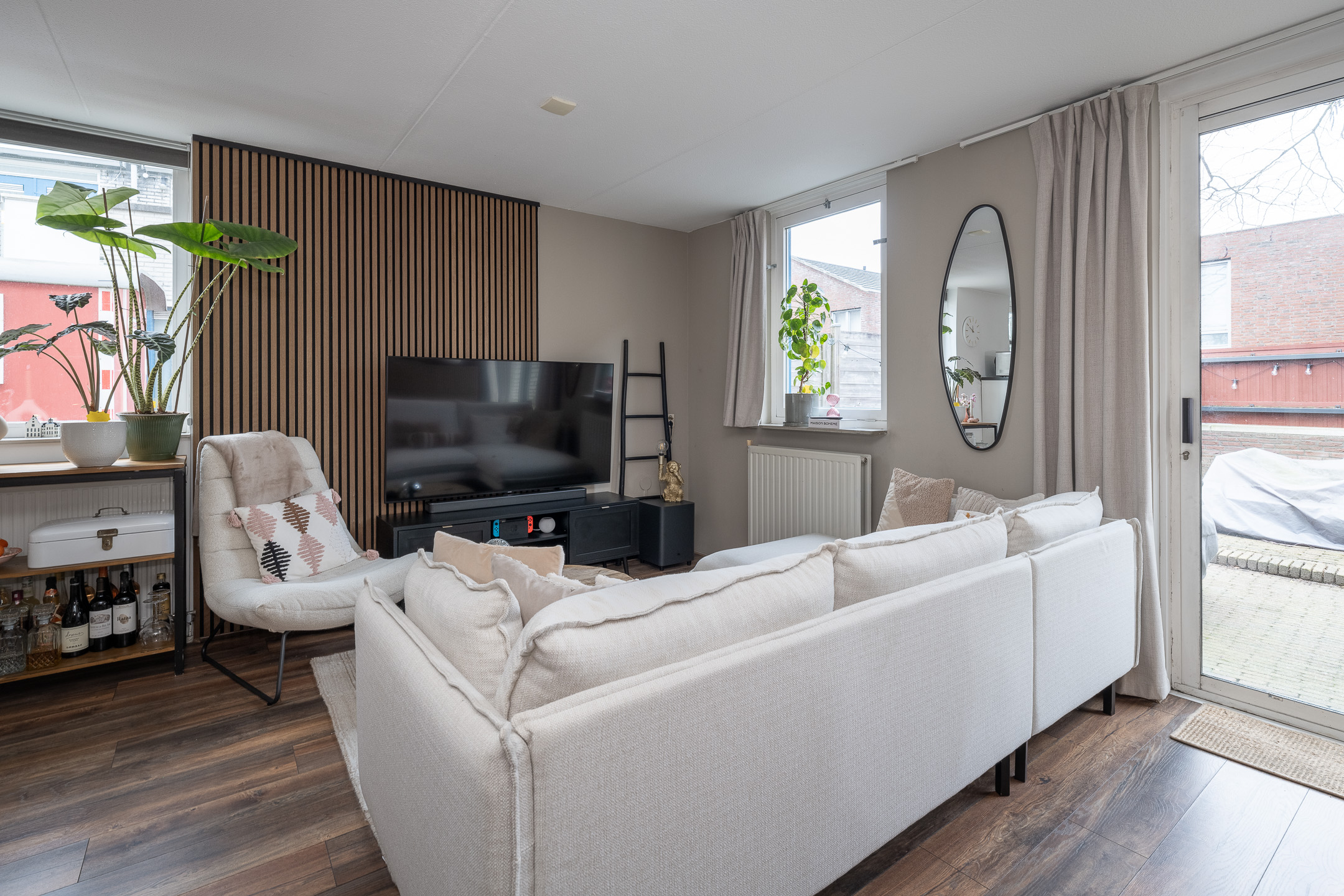 De woonkamer is netjes afgewerkt met glad gestucte wanden en plafonds, een keurige laminaatvloer en een hippe lattenwand die zorgt voor extra sfeer en warmte.