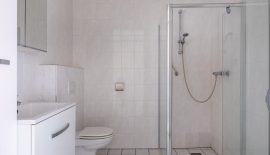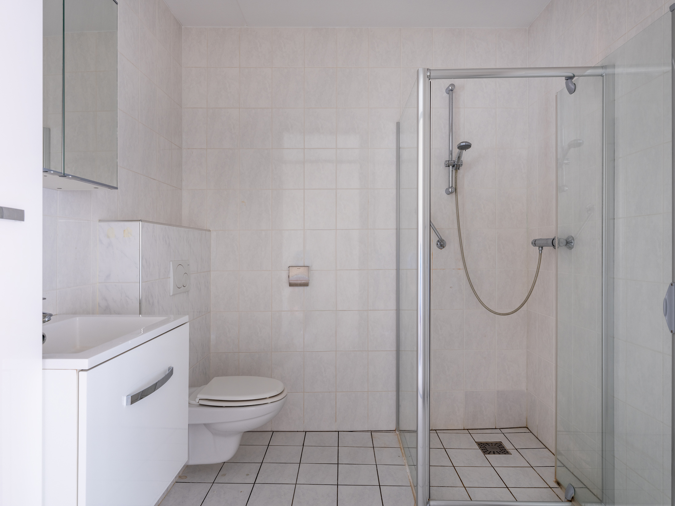 Ruime en nette badkamer met douche, wastafelmeubel en toilet.