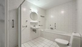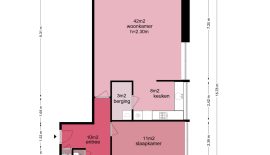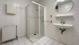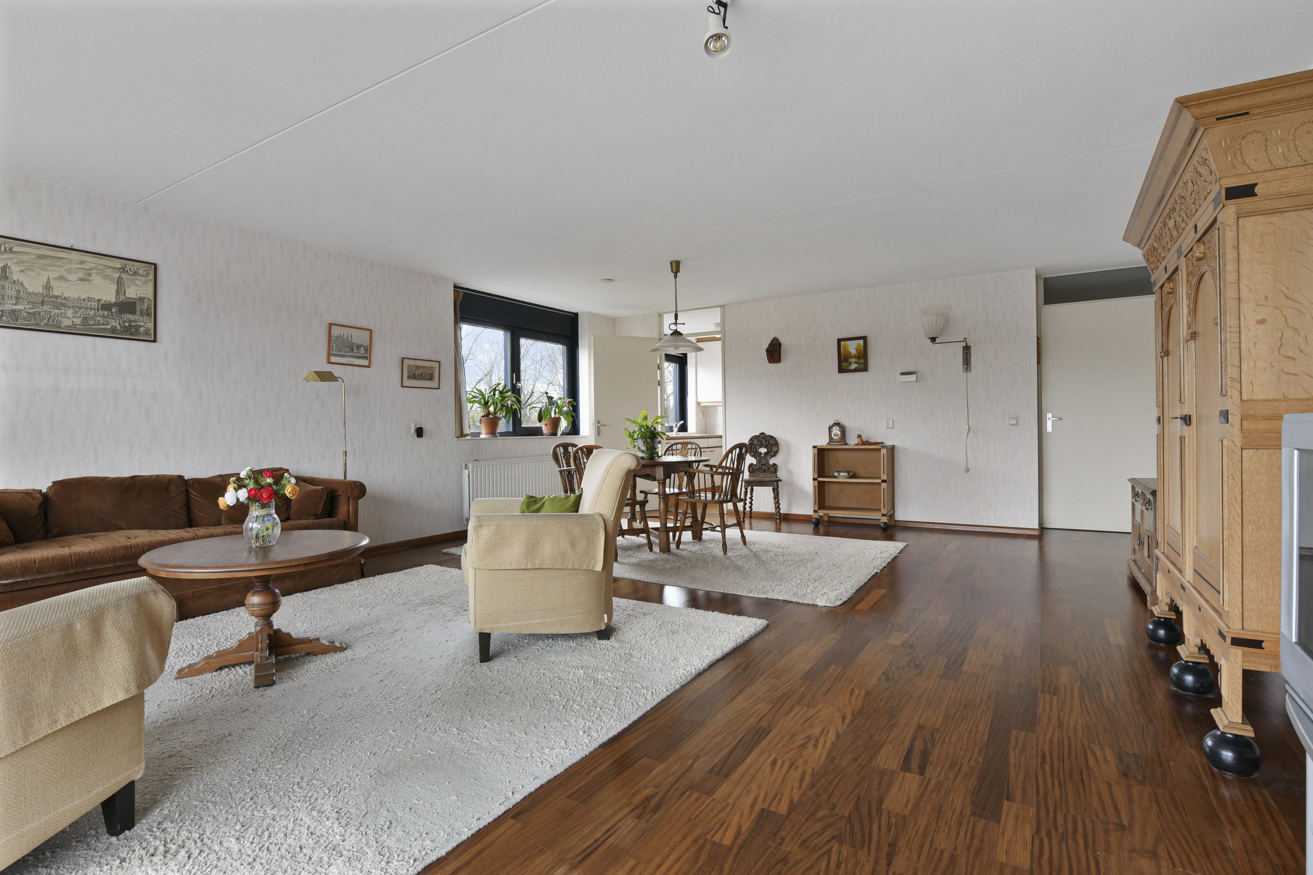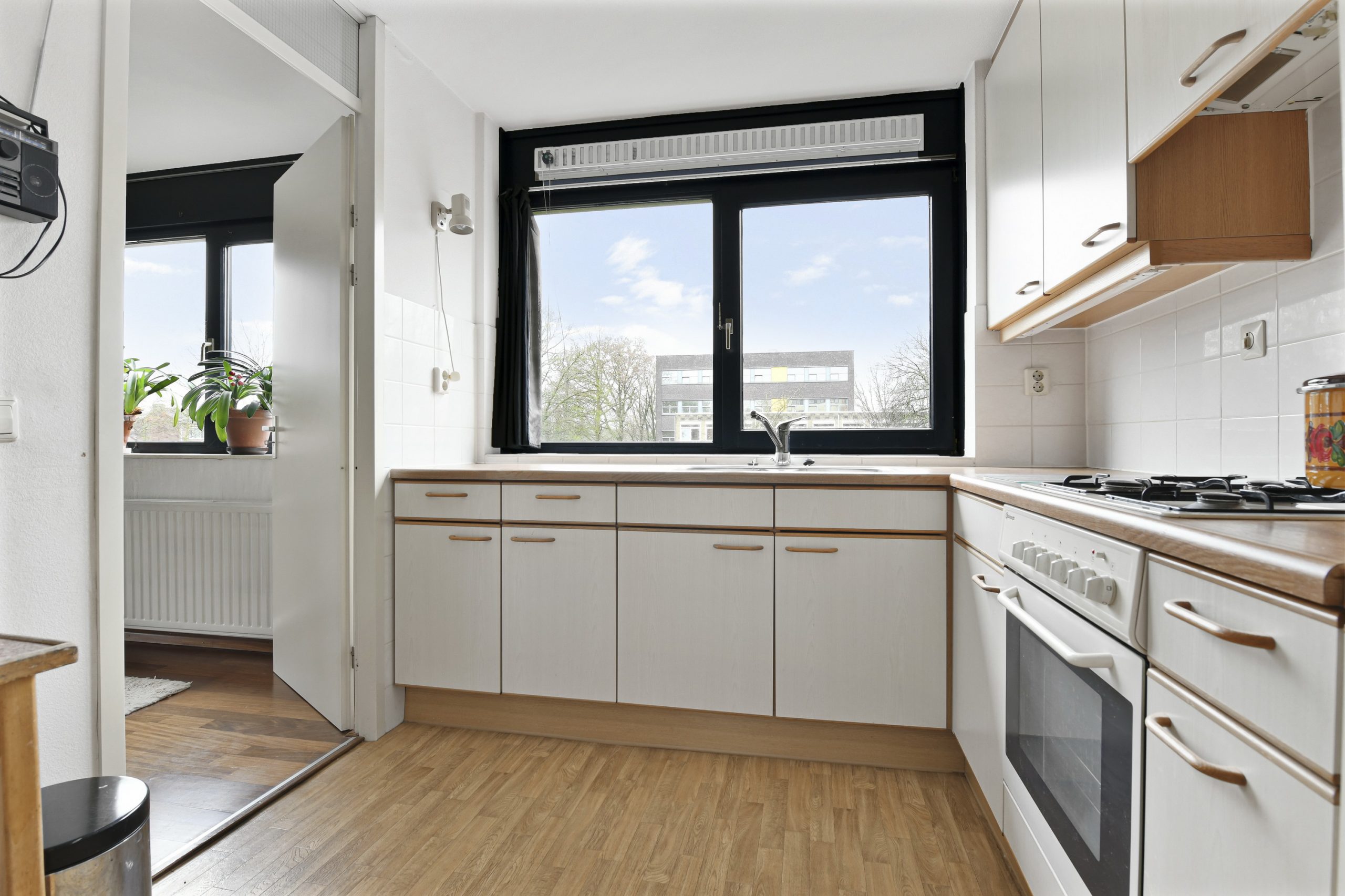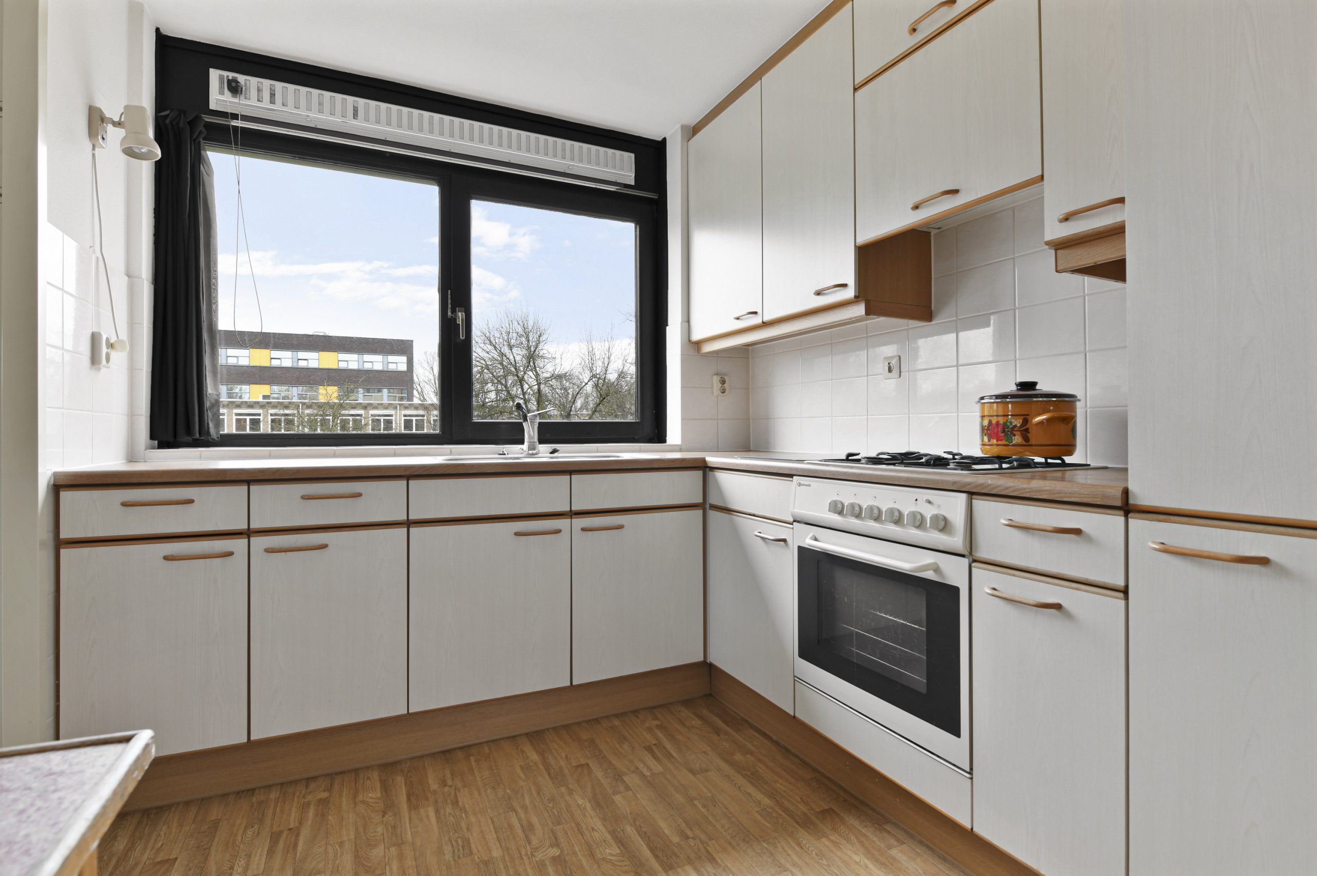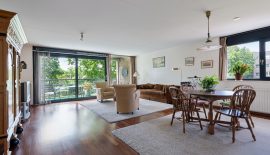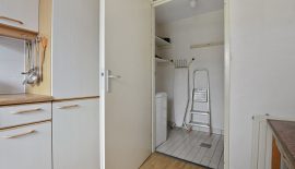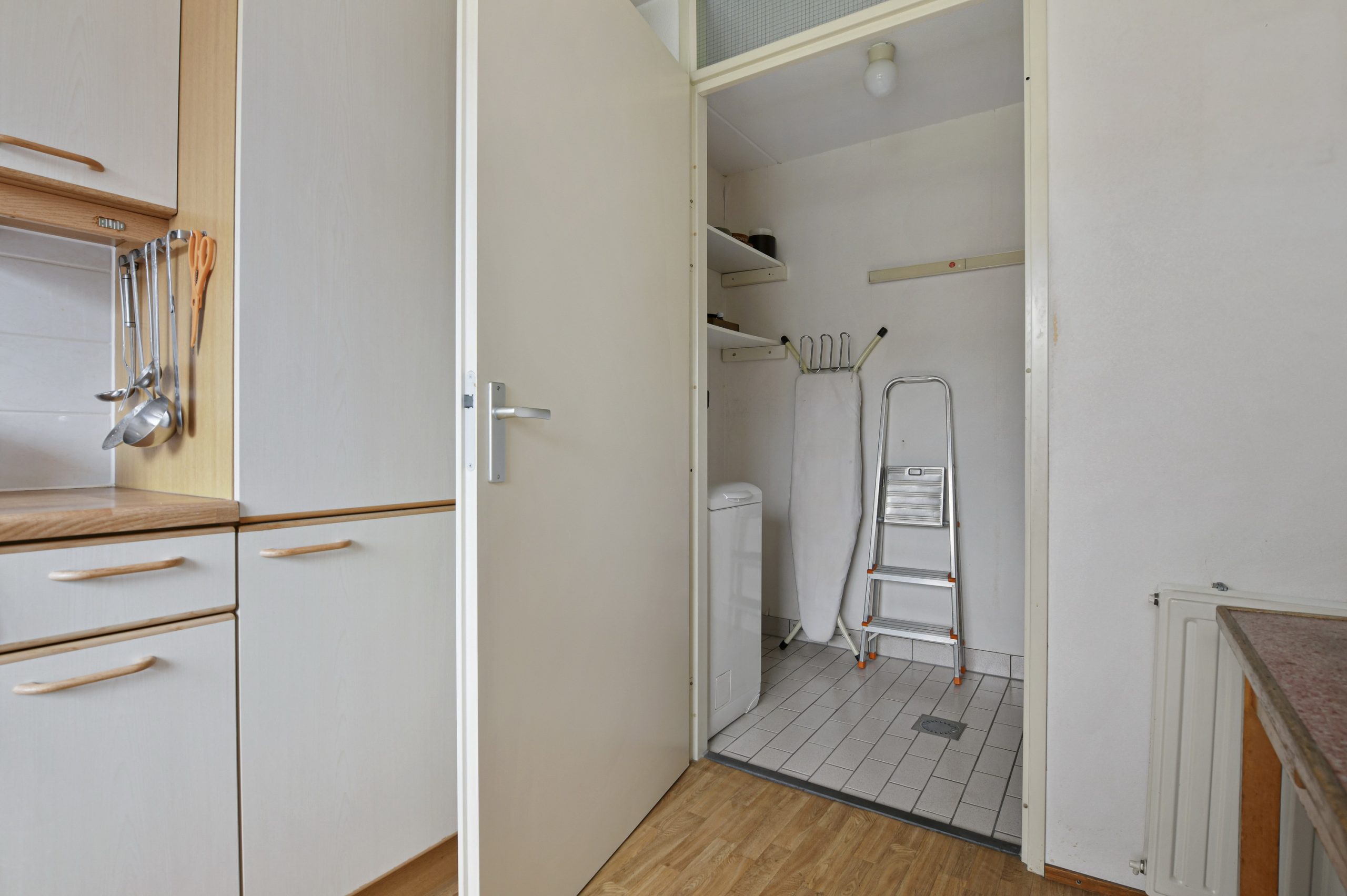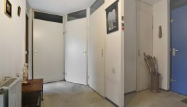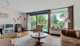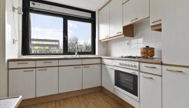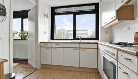Entree / hal, met nieuwe videofoon, toilet met wastafel, kastruimte met opstelling CV-HR-combiketel (Remeha, 2008), mechanische ventilatie en meterkast. Royale woonkamer van 42 m2 met laminaatvloer en een brede glaspui met toegang tot een ruim overdekt balkon (10 m2; met elektrisch zonnescherm). Dankzij de zijramen heb je ook na ’s middags 3 uur nog de zon in huis en is de woonkamer en de keuken heerlijk licht. De hoekkeuken beschikt eveneens over een groot zijraam en is voorzien van 2 spoelbakken onder het raam en enige inbouwapparatuur. Heel handig is de naastgelegen bijkeuken met betegelde vloer en aansluiting voor de wasmachine, hier kunt u bijvoorbeeld ook de voorraadkasten en prullenbakken neerzetten.