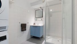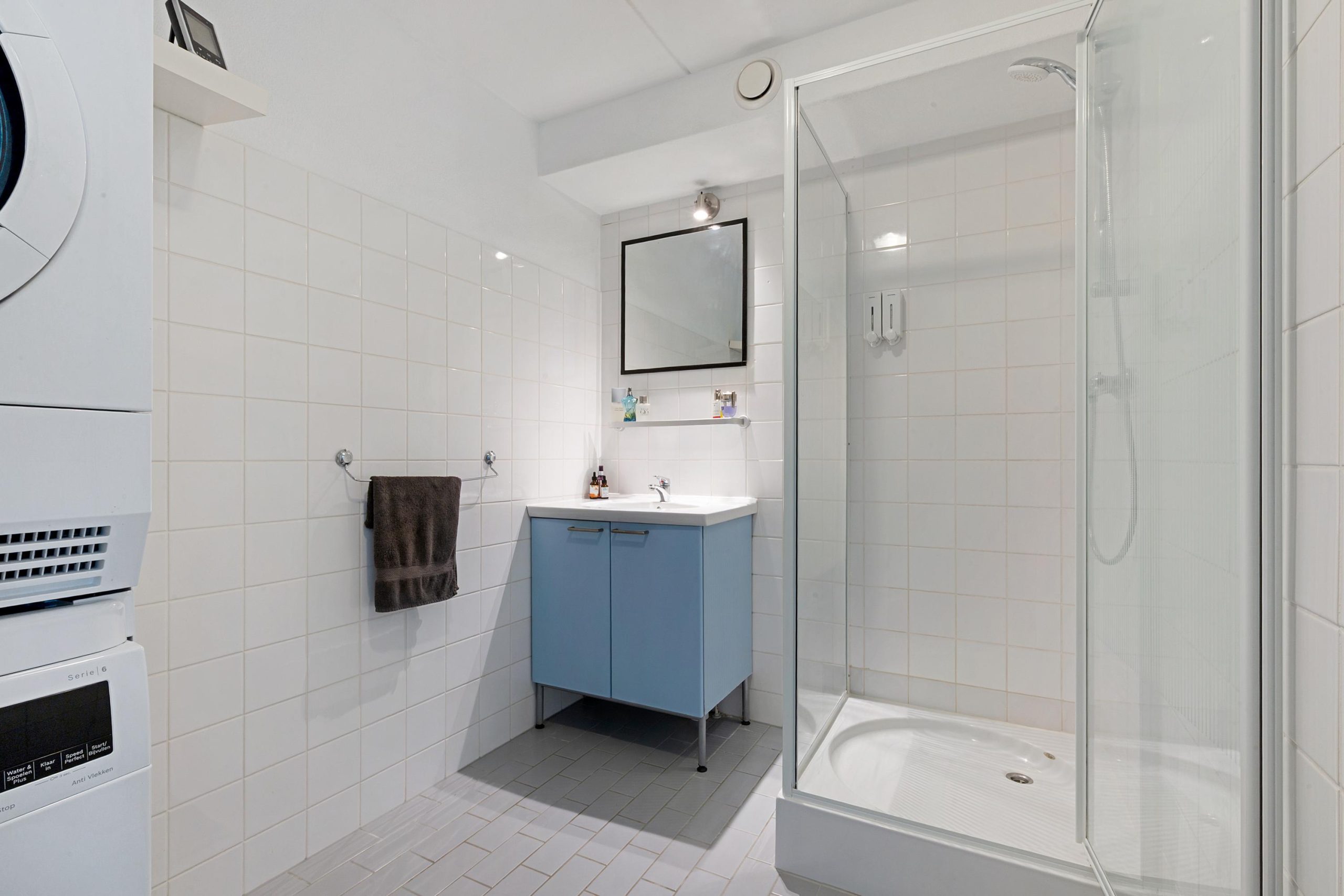 From the hallway, you have access to a large master bedroom (9 m²) with a three-door sliding wardrobe and a second bedroom/study with a built-in closet and central heating boiler (Remeha, 2024) plus mechanical ventilation. The original bathroom includes a walk-in shower, vanity unit, and washing machine connection. There is also a separate toilet with a small sink.