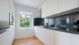 Entrance/hallway with oak engineered parquet flooring, a very spacious and bright L-shaped living room featuring a beautiful oak parquet floor with V-groove and access to a well-positioned balcony (northwest-facing) with afternoon and evening sun and stunning open views. The luxurious open-plan kitchen is set up in a double layout with a playful plastic side bay window, high-gloss cabinet fronts, granite countertops, full built-in appliances (including a new combination oven), and plenty of storage space.