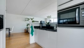 Entree / hal met eiken lamelparket, zeer ruime en lichte L-vormige woonkamer met een fraaie eiken lamelparketvloer met V-groef en toegang tot vrij liggend balkon (noord-west) op de middag- en avondzon met een prachtig vrij uitzicht. Luxe open keuken in dubbele opstelling met grappige kunststof zij-erker, hoogglans fronten, granieten aanrechtbladen, complete inbouwapparatuur (o.a. nieuwe combi-oven) en veel bergruimte.