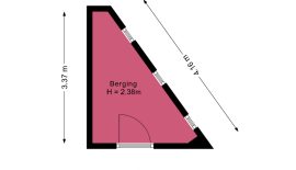 – Driehoekige berging op de begane grond met drie kleine gevelraampjes en elektra-aansluiting
