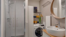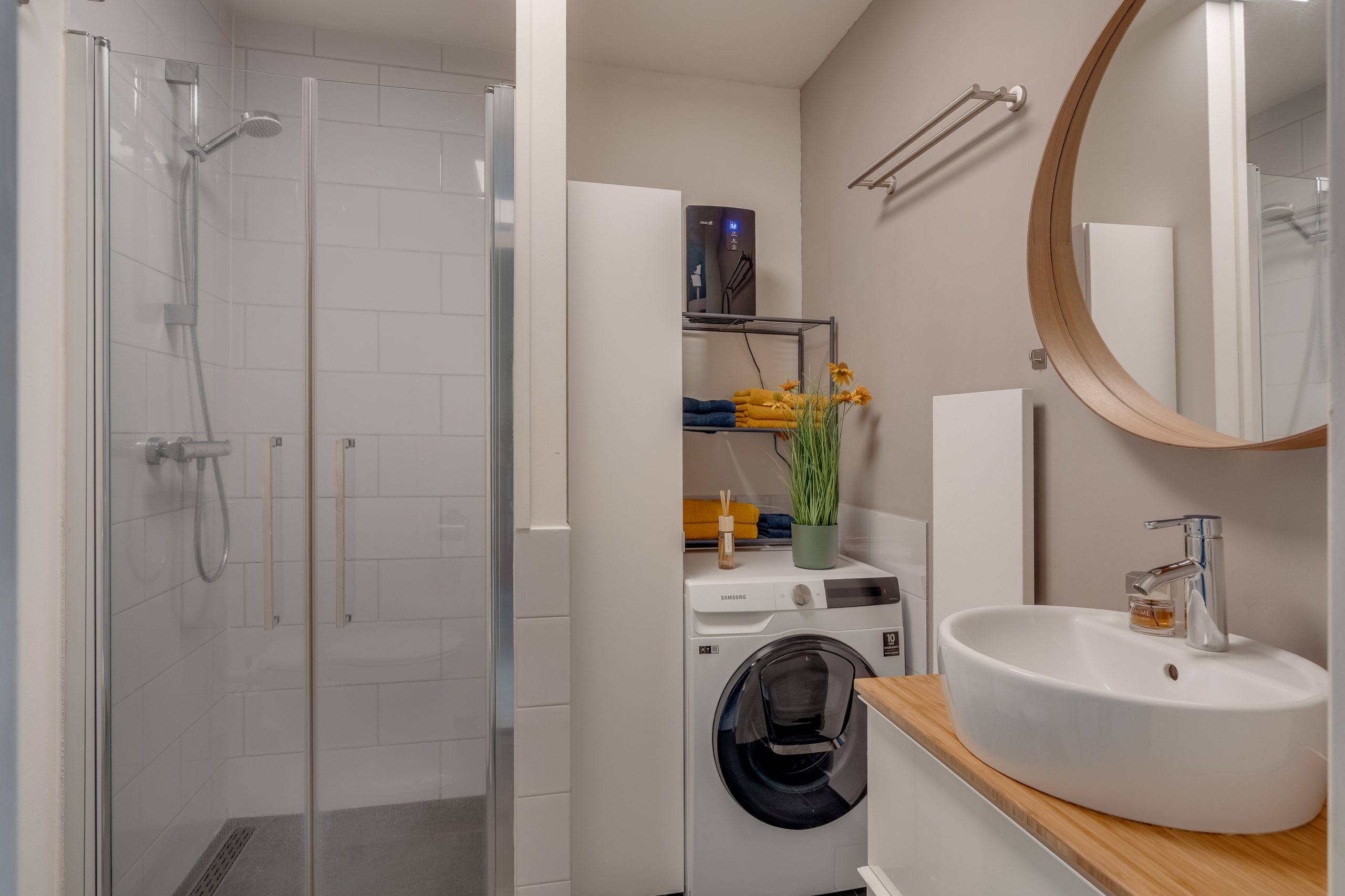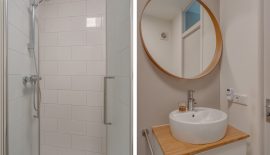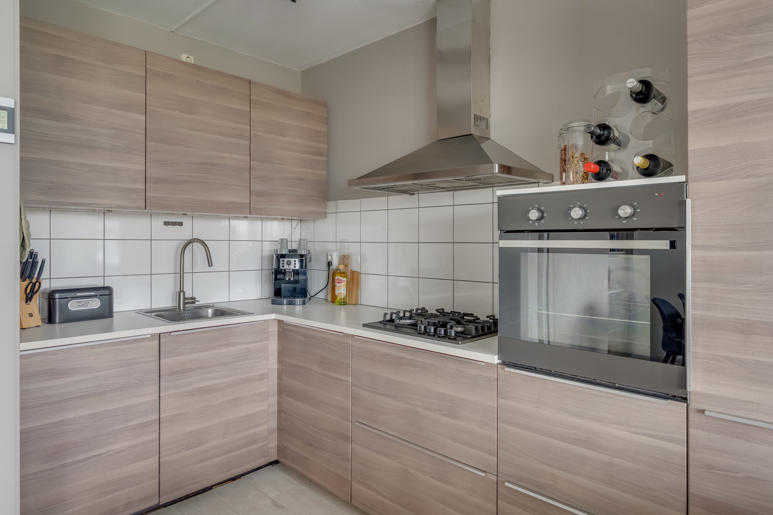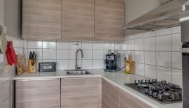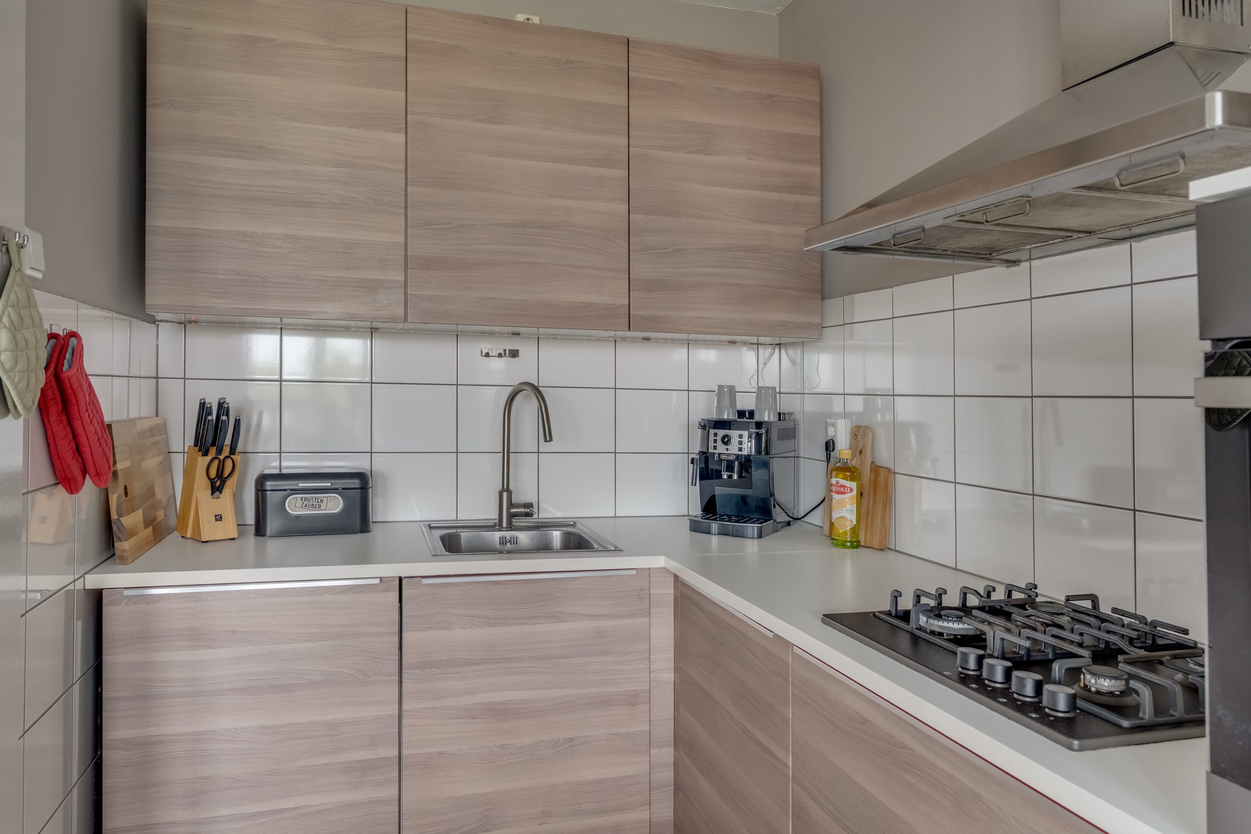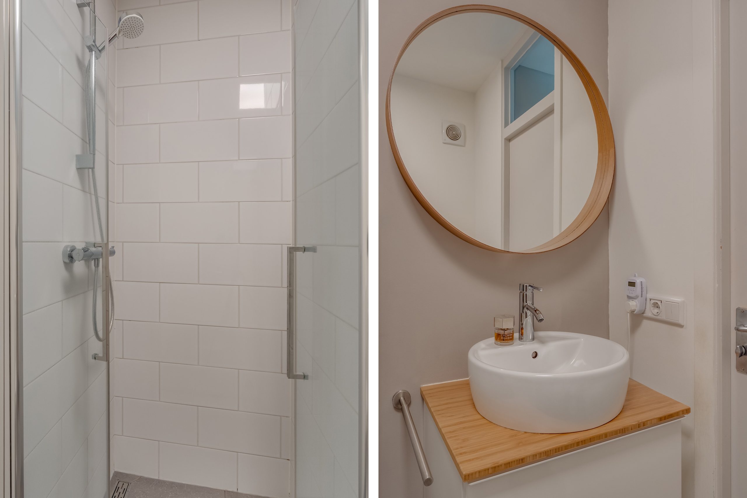 De open hoekkeuken beschikt over veel kastruimte en de volgende inbouwapparatuur: 4-pits gasfornuis, afzuigkap, vaatwasser, oven en -koel/vriescombinatie. Aan de andere zijde van de hal bevindt zich de ruime slaapkamer met wederom twee inbouwkasten. De badkamer is in 2017 vernieuwd en beschikt over een inloopdouche, toilet en wastafel met bamboeblad. Daar bovenop staat een stijlvolle waskom en er is ook een ronde spiegel in bamboe stijl. In de badkamer bevindt zich ook de aansluiting voor de wasmachine.