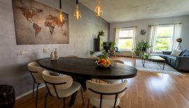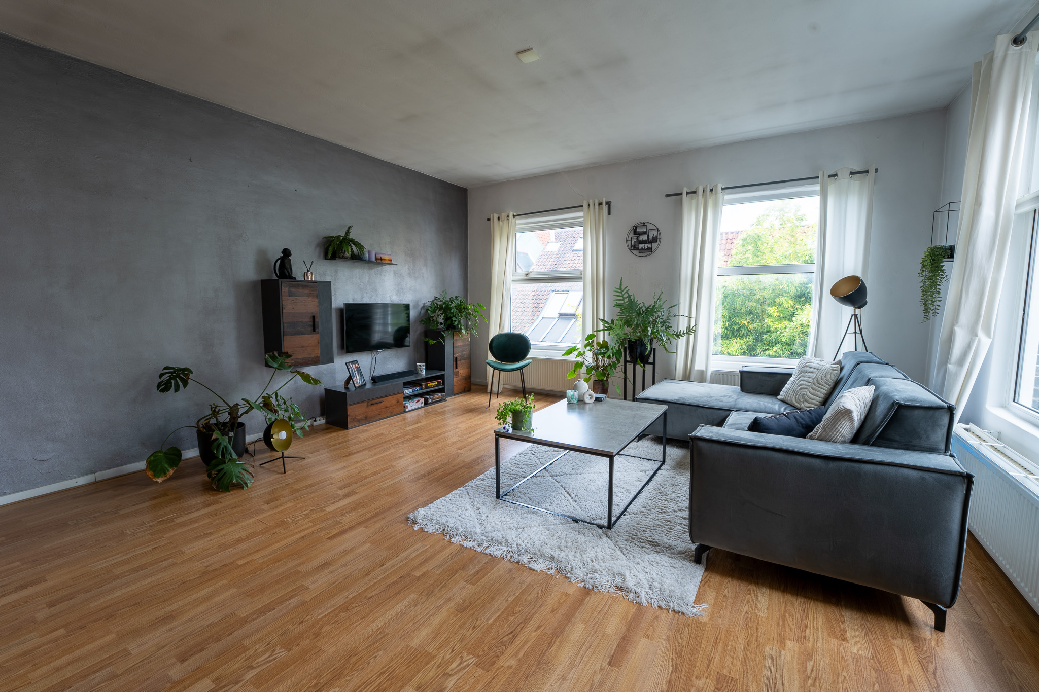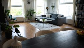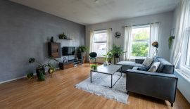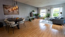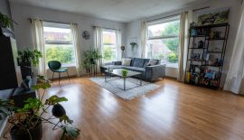 Dan de enorme woonkamer van 30 m2, met recht een ‘balzaal’ te noemen in vergelijking met de andere ruimtes. In deze heerlijke lichte woonkamer is ruimte genoeg voor alle meubels die je kunt verzinnen. Keuken en woonkamer zijn voorzien van een laminaatvloer.