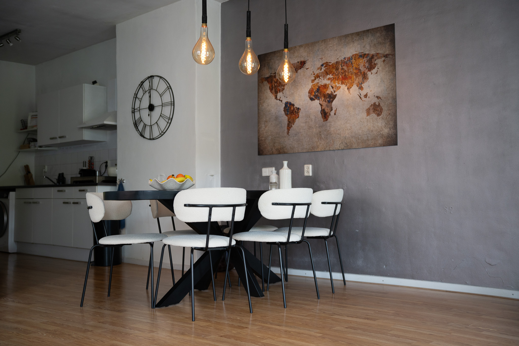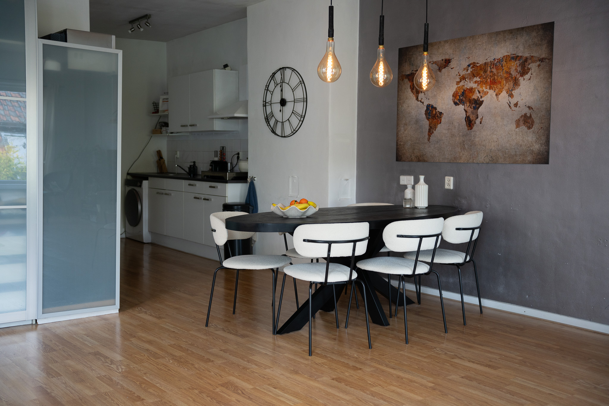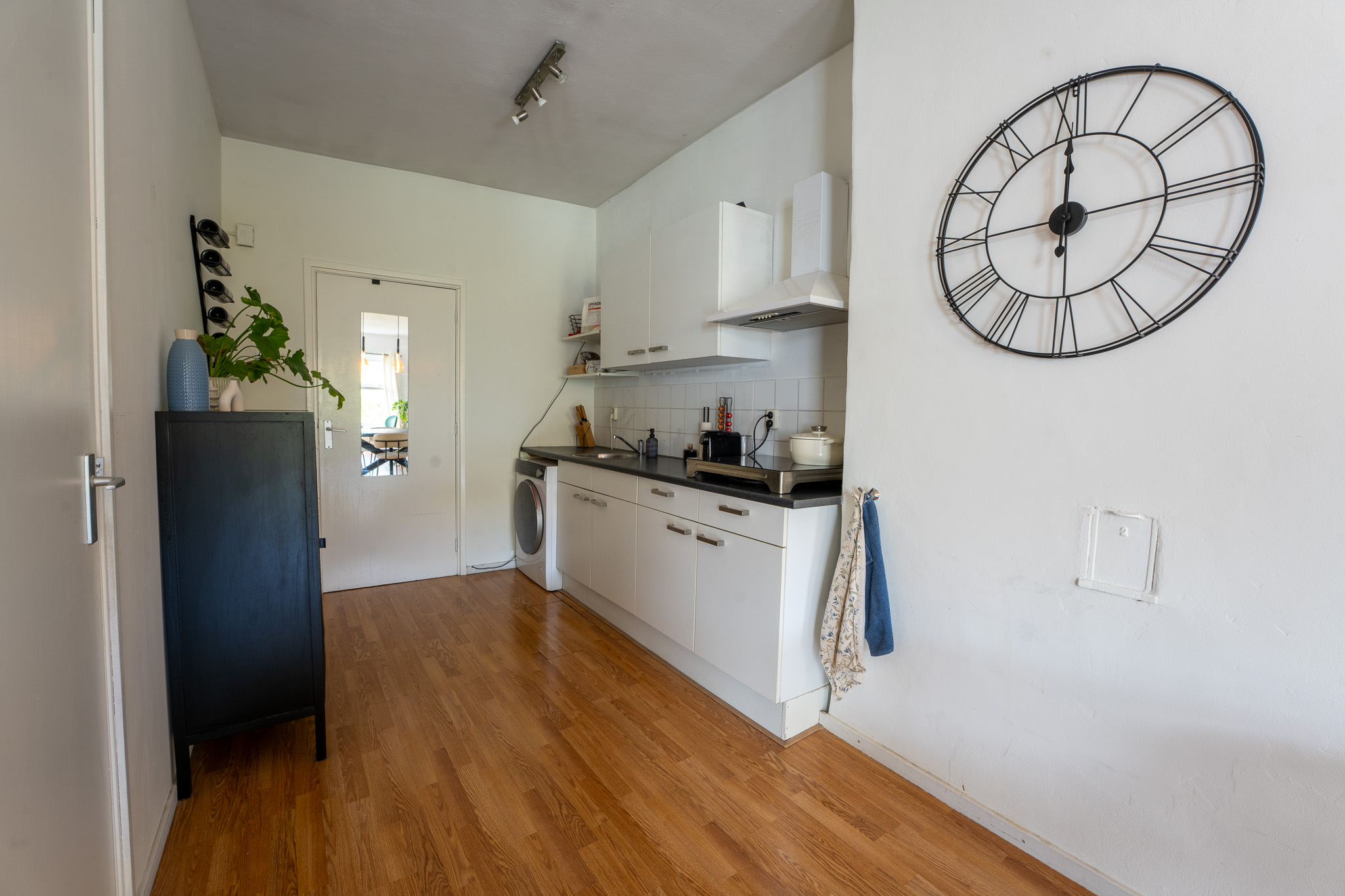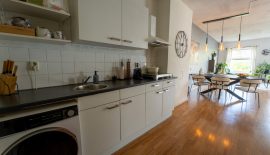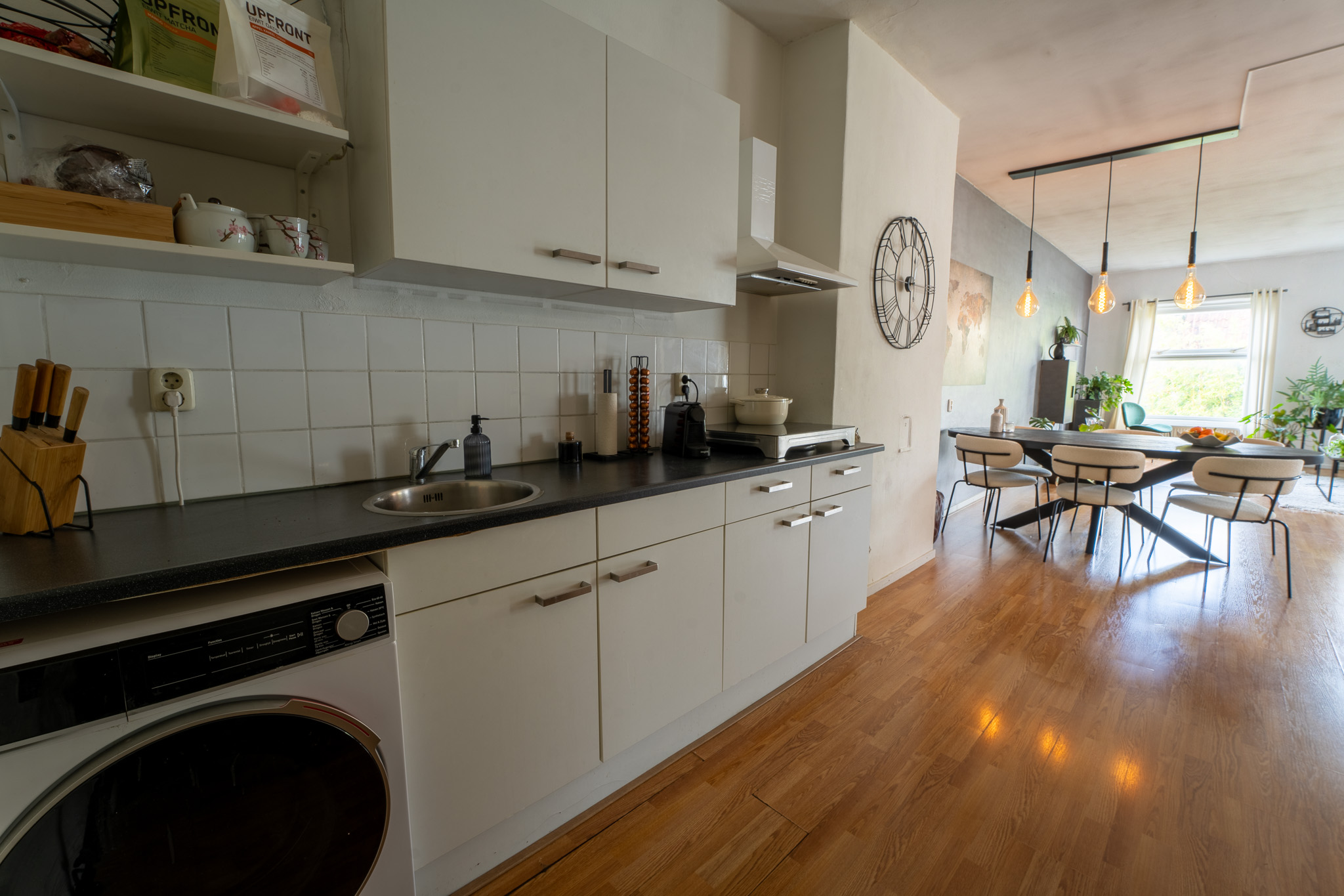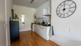 Als je uit de gang kom je via een klein trapje in de prachtige open ruimte met allereerst de witte keuken, die je verder de woonkamer in brengt. In de keuken is de wasmachine aansluiting, een losse inductiekookplaat (2019) en veel praktische kastruimte. Tegenover het keukenblok is nog de losse -koel/vriescombinatie (2024) en de combi-oven/magnetron (2023).