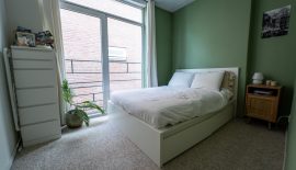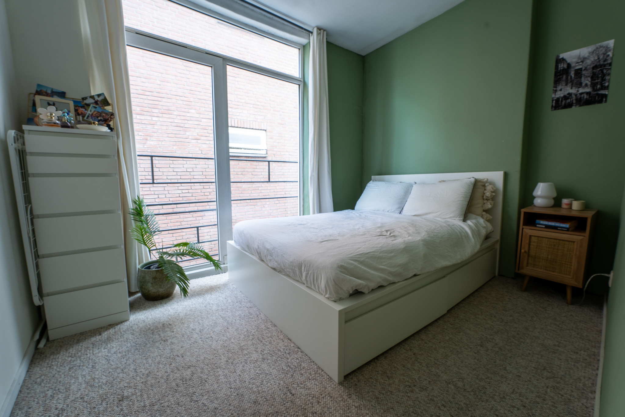 Last but not least is er nog de ruime slaapkamer, met twee muren die voorzien zijn van een trendy kleur. De slaapkamer beschikt over vloerbedekking en heeft een frans balkon van kunststof welke open te schuiven is voor extra frisse lucht.