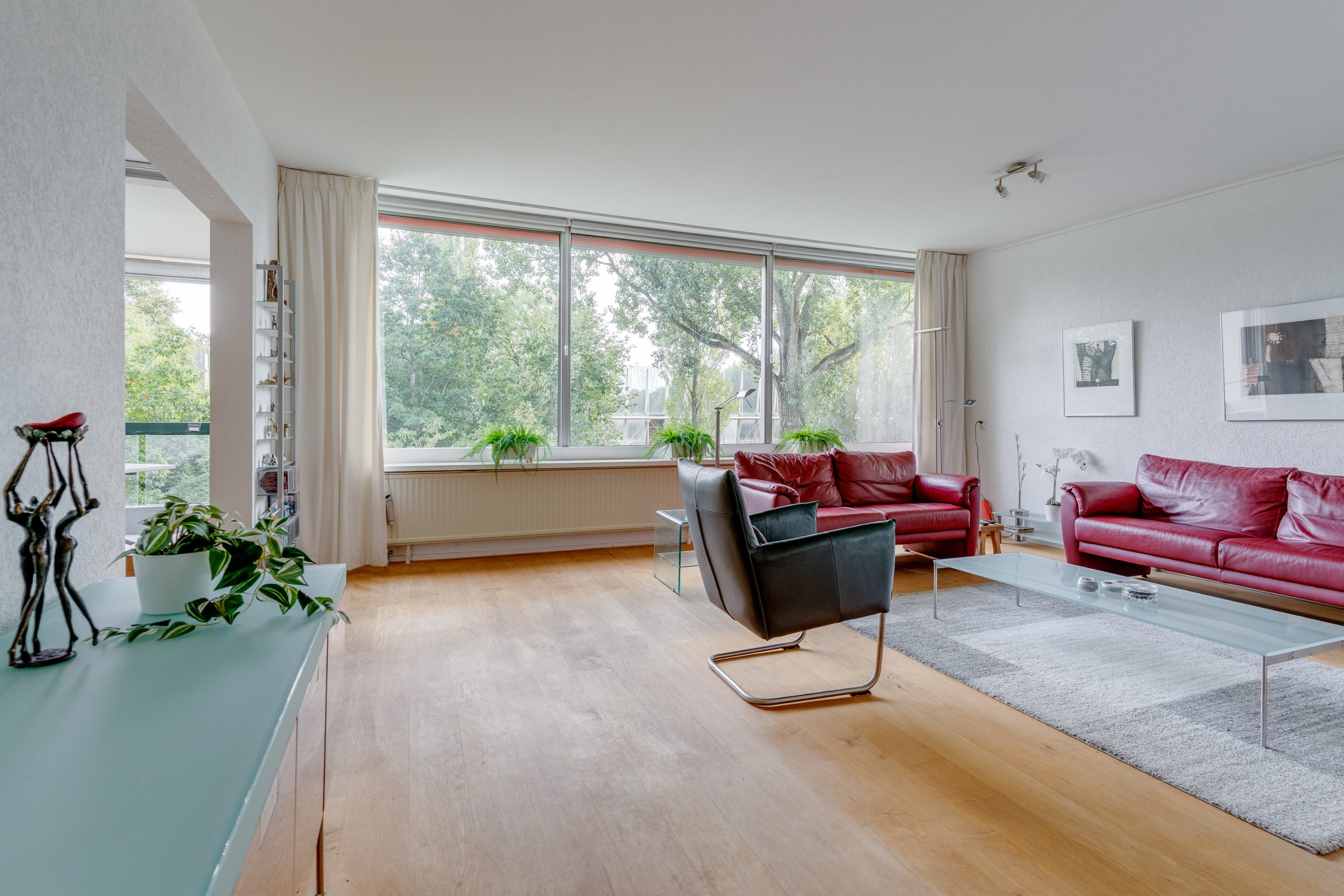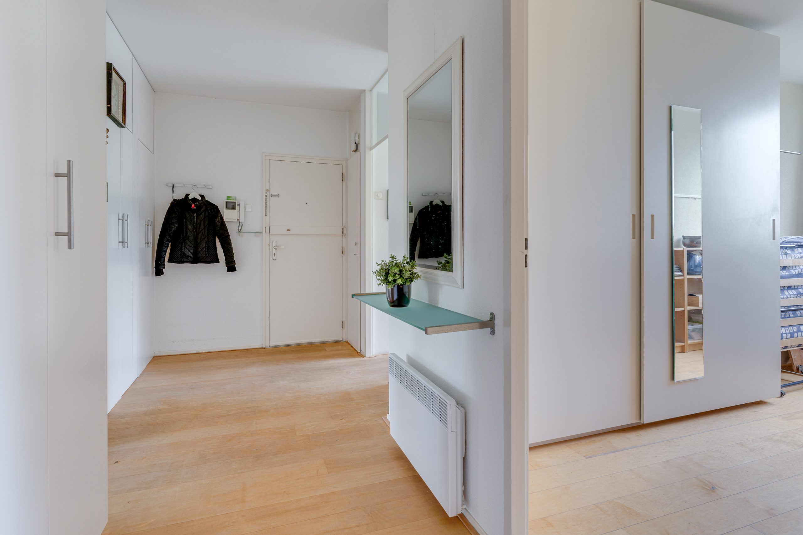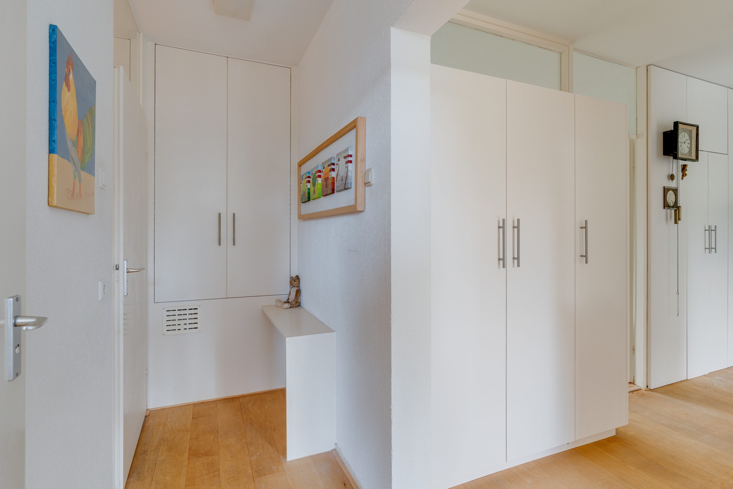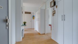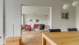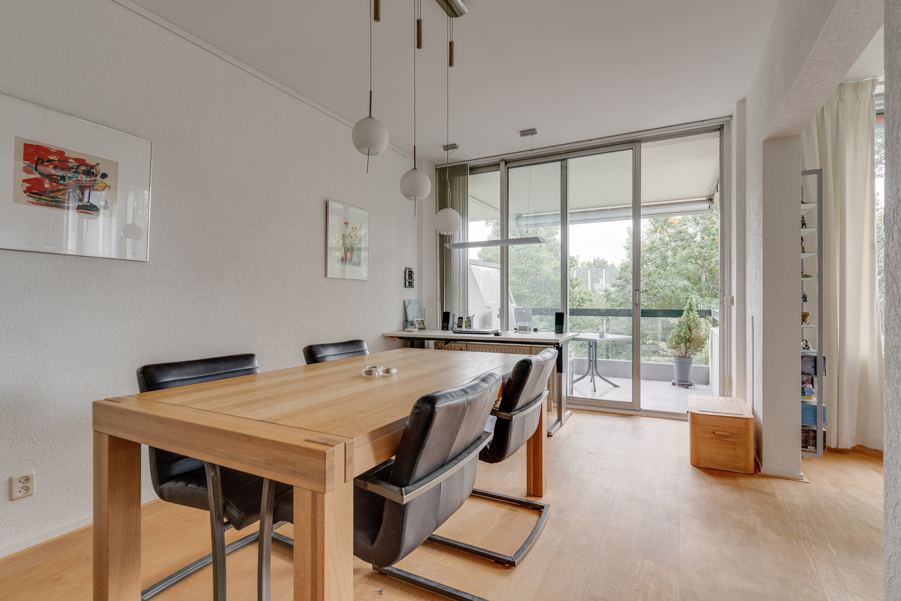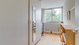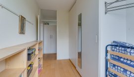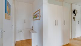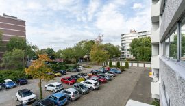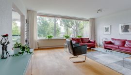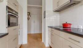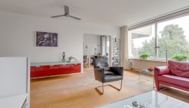 Entree / ruime hal met videofoon, meerdere maatwerk kasten, meterkast, provisiekast en kastruimte met CV-HR-combiketel (Intergas, 2023). Royale en zonnige woonkamer met vaste boekenkast en 3 grote ramen met een prachtig vrij uitzicht op het groen. Via een rechte toog staat deze in verbinding met naastgelegen werk- / eetkamer van 14 m2, eveneens met vaste boekenkast. Beide kamers zijn voorzien van lamelparket. Een schuifpui geeft toegang tot het ruime balkon dat op het zuid-oosten is gelegen en uitkijkt op het wandelpark wat onderlangs loopt.