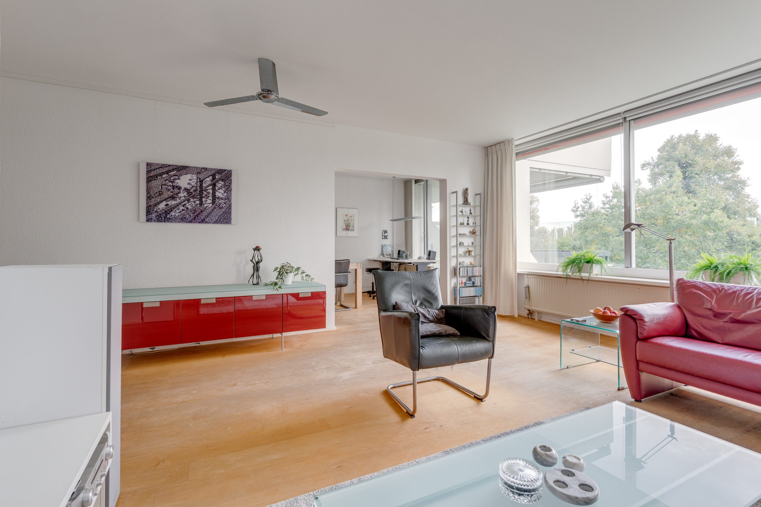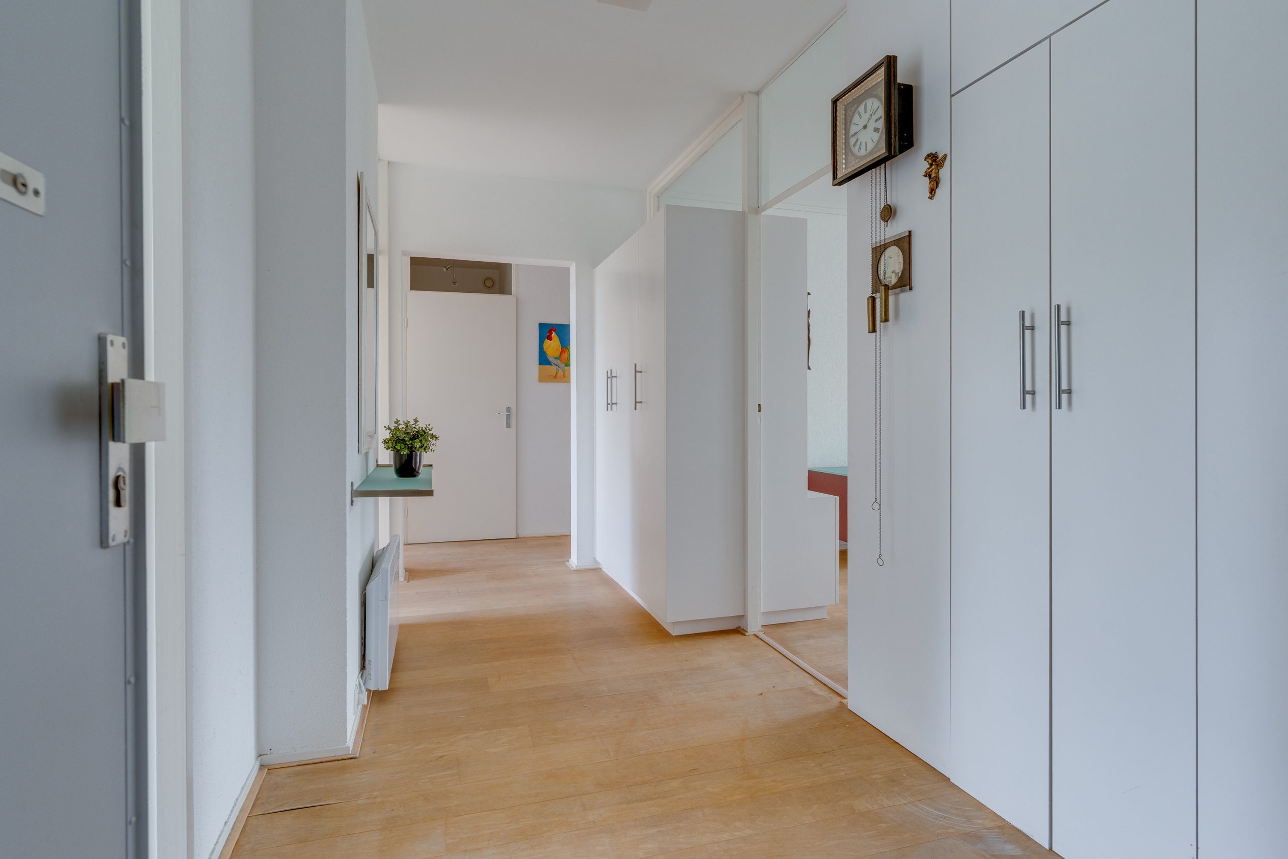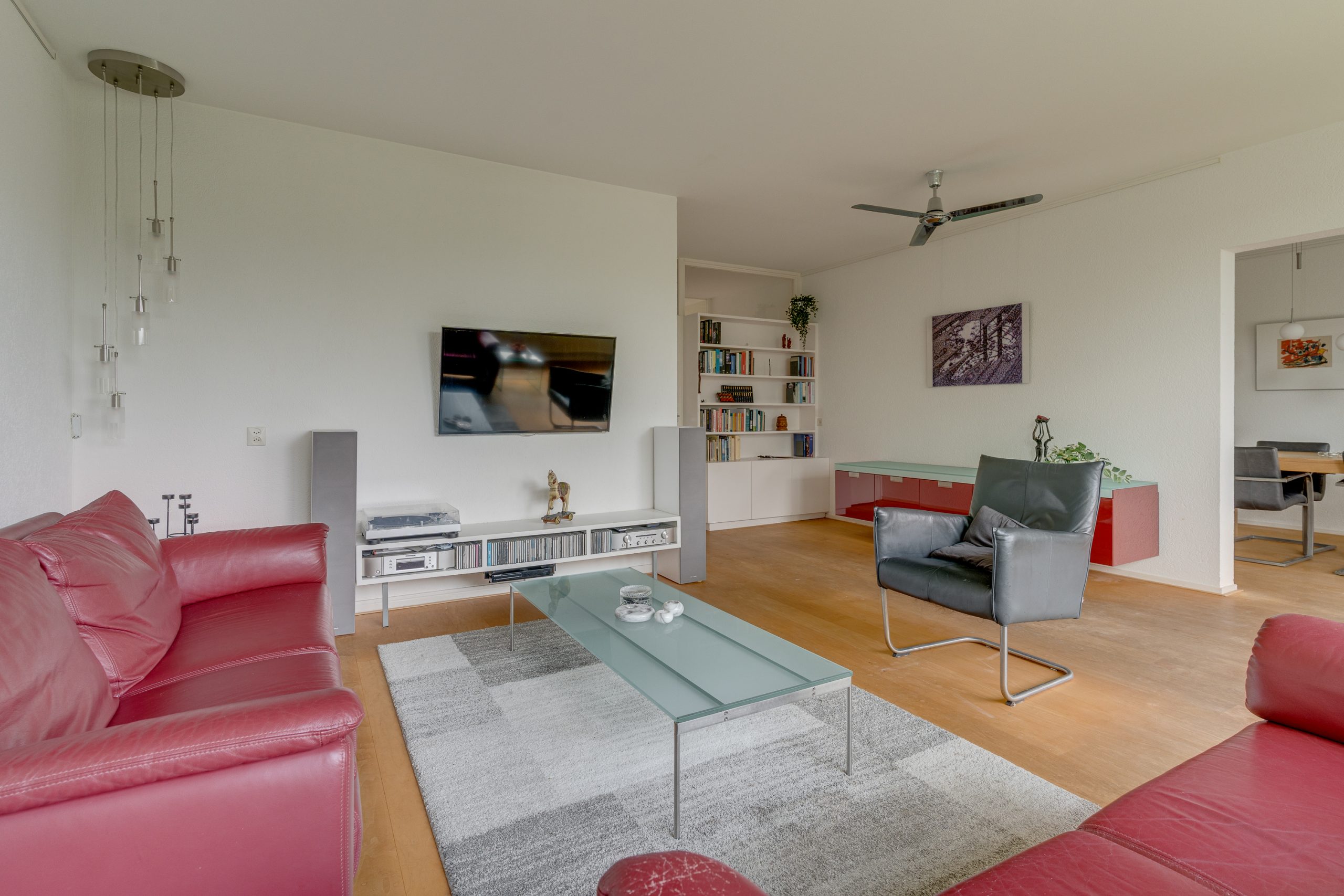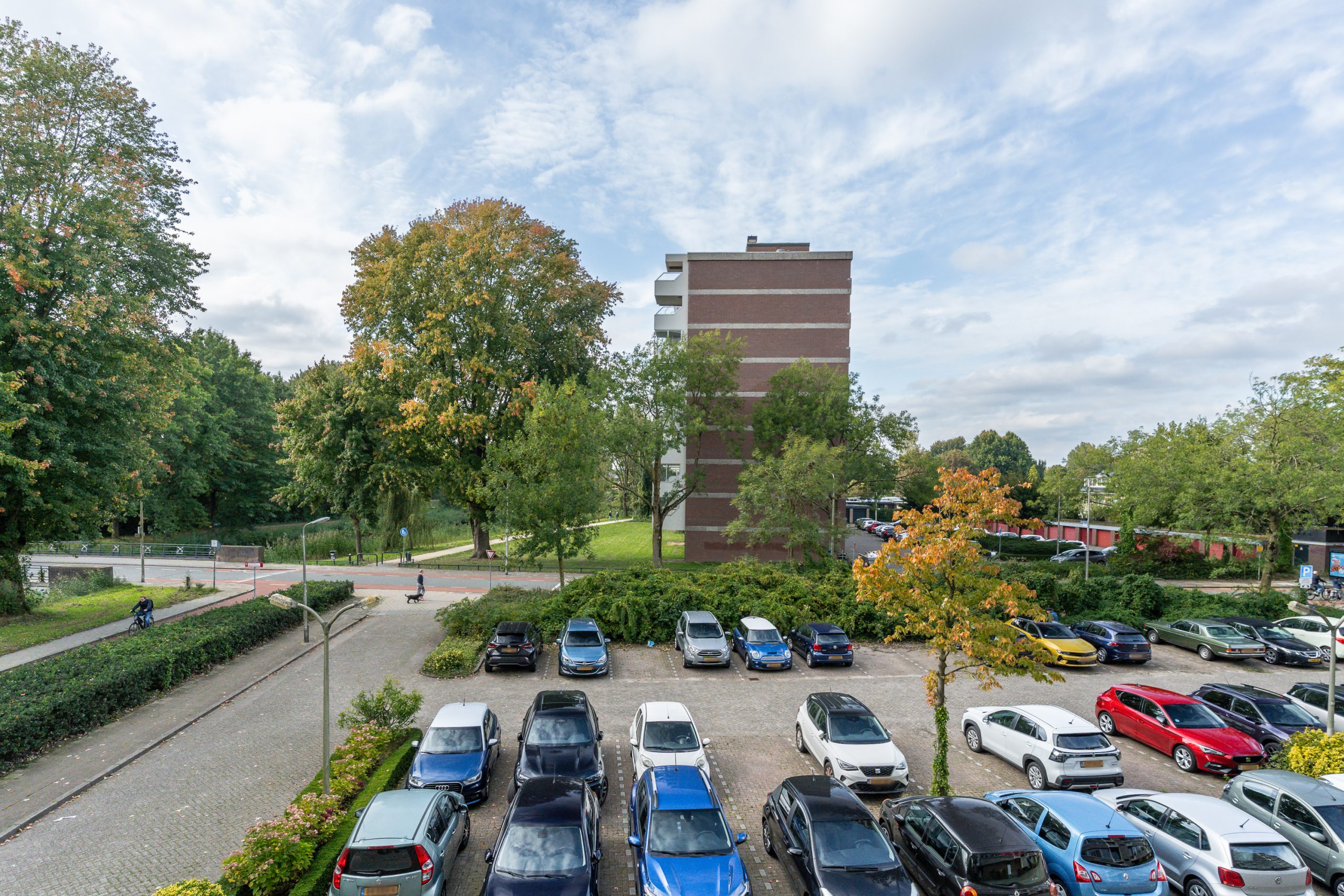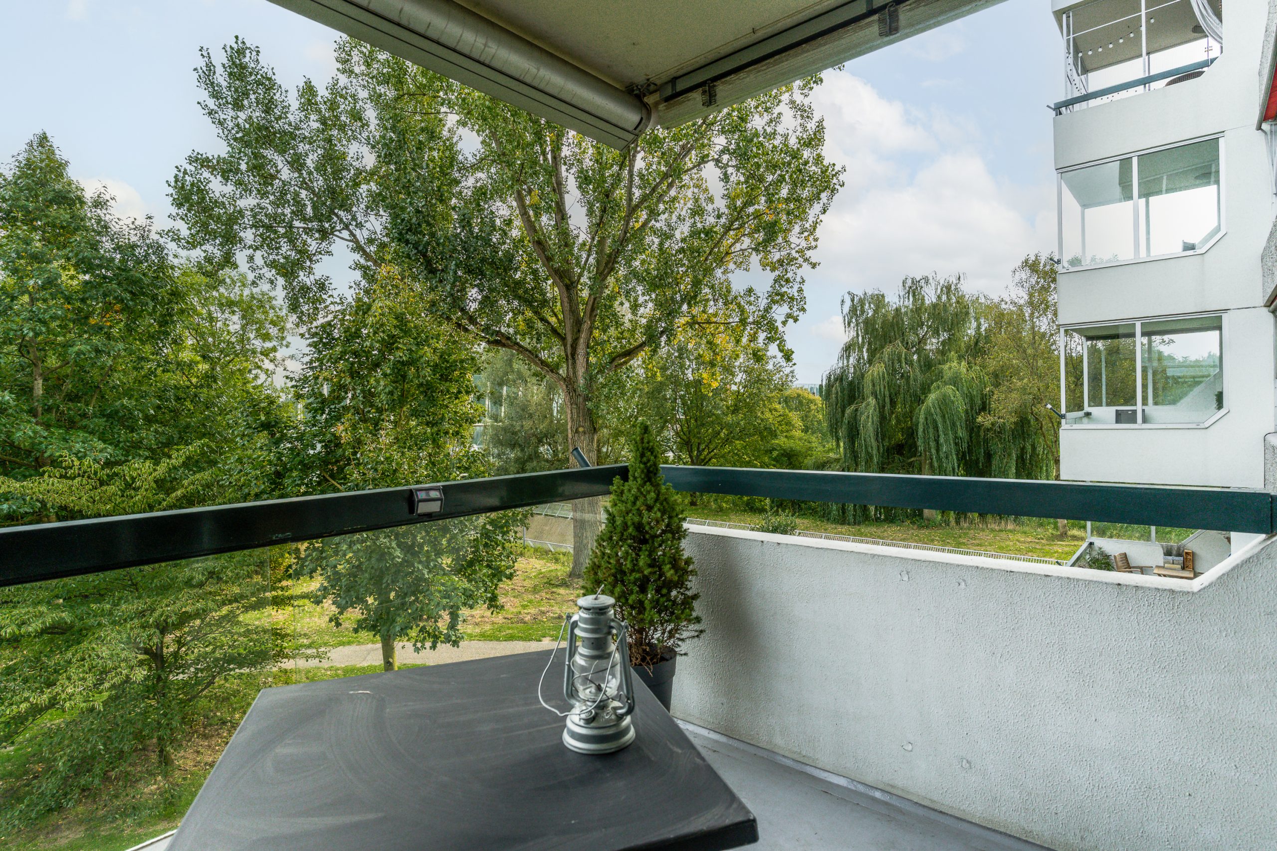 Entree / ruime hal met videofoon, meerdere maatwerk kasten, meterkast, provisiekast en kastruimte met CV-HR-combiketel (Intergas, 2023). Royale en zonnige woonkamer met vaste boekenkast en 3 grote ramen met een prachtig vrij uitzicht op het groen. Via een rechte toog staat deze in verbinding met naastgelegen werk- / eetkamer van 14 m2, eveneens met vaste boekenkast. Beide kamers zijn voorzien van lamelparket. Een schuifpui geeft toegang tot het ruime balkon dat op het zuid-oosten is gelegen en uitkijkt op het wandelpark wat onderlangs loopt.