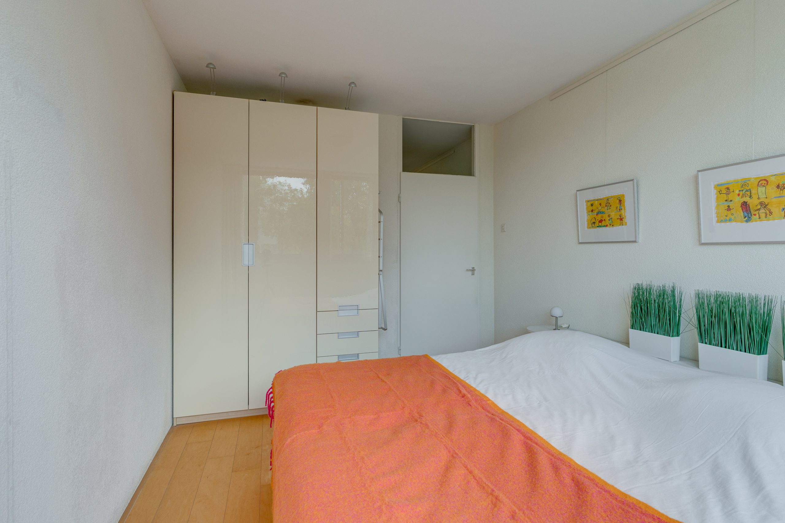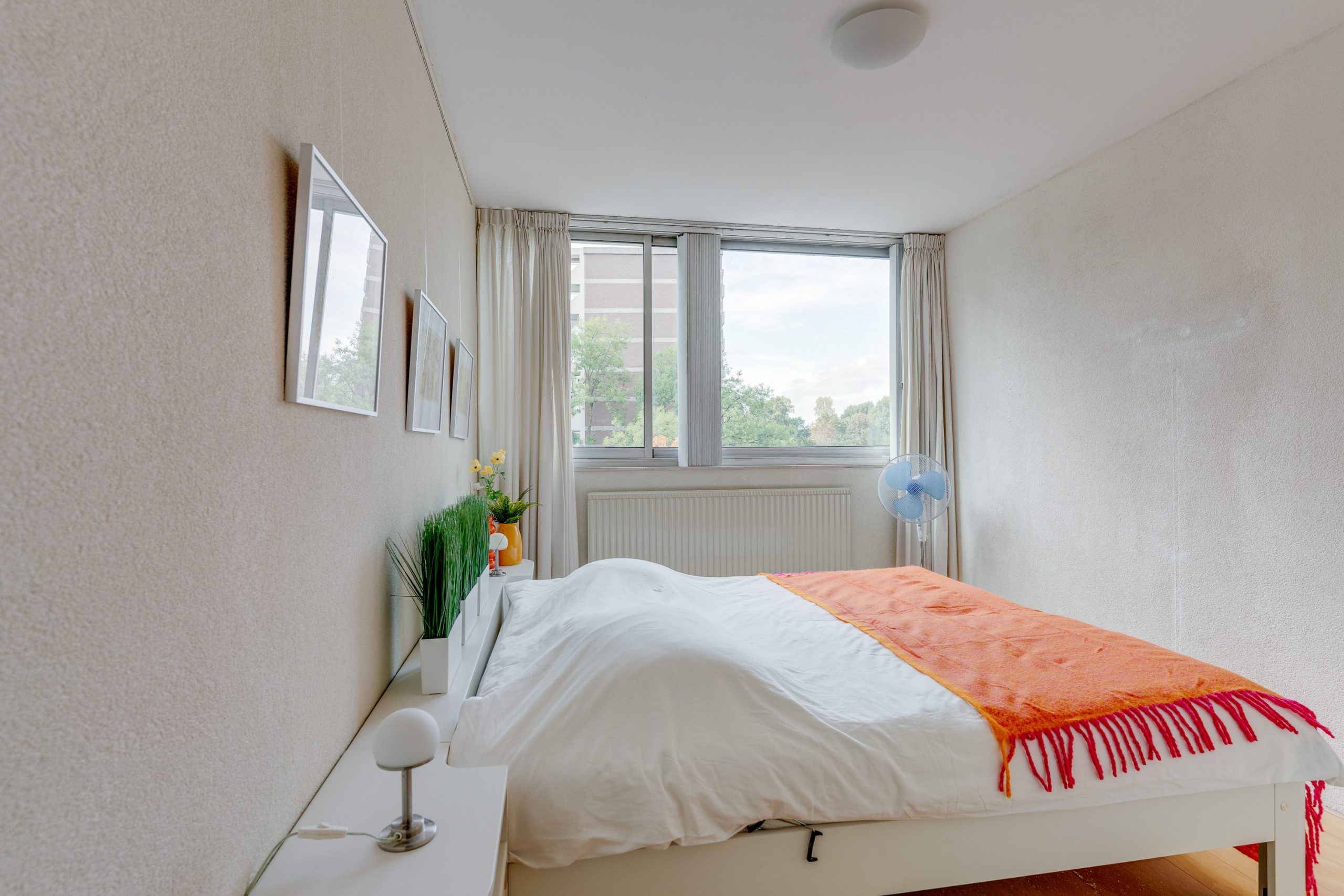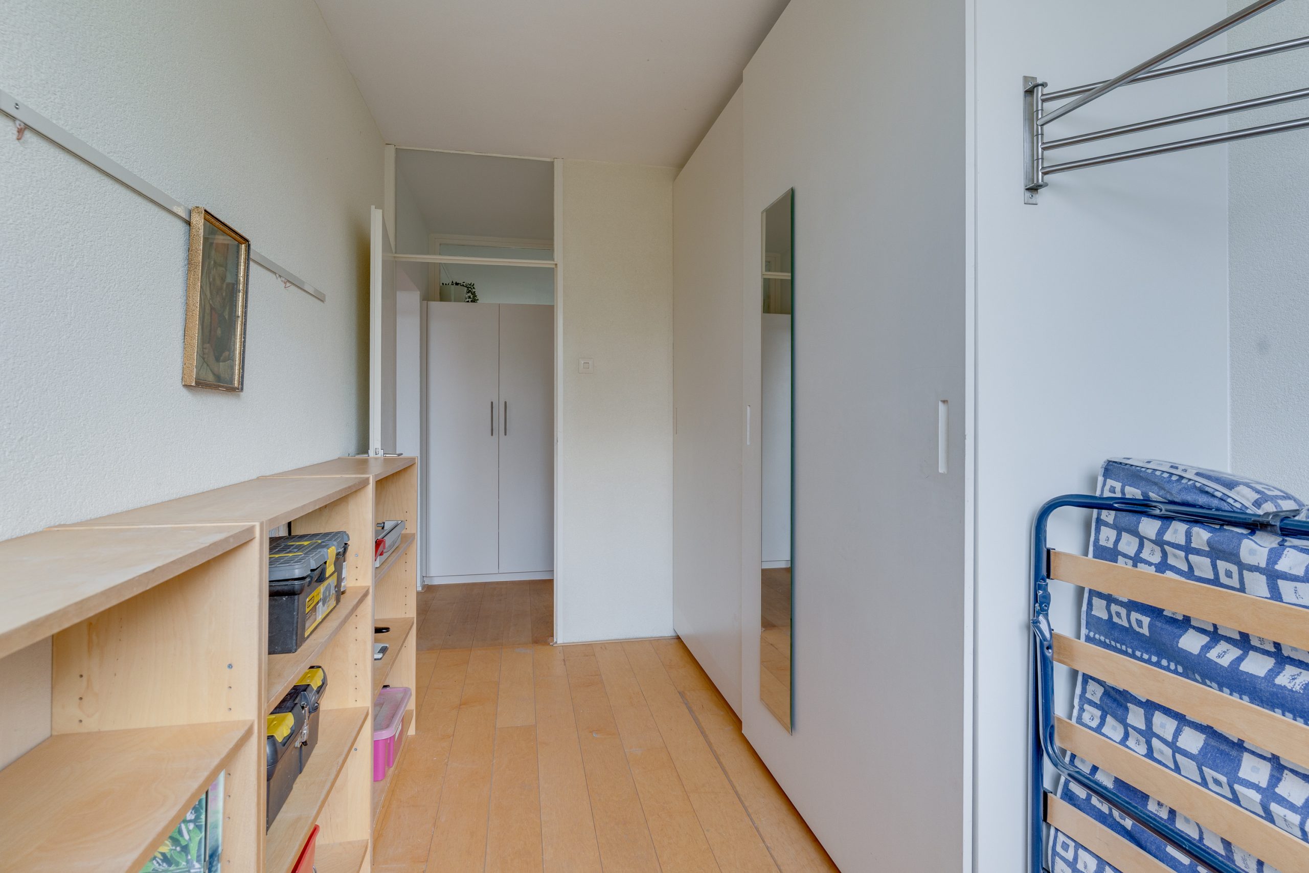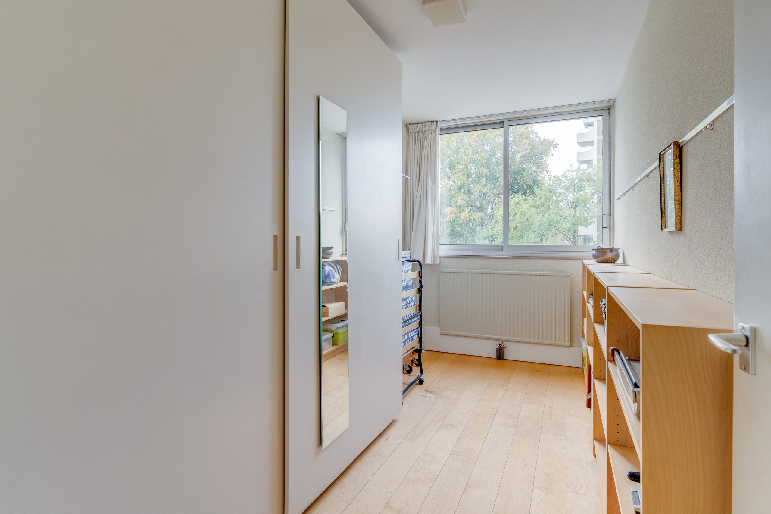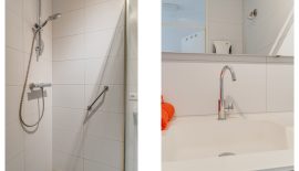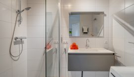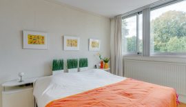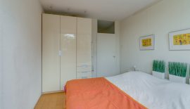 De 2 slaapkamers, beide met lamelparket, zijn 9 m2 en 13 m2 groot. Ook deze zijn aan de voorzijde gelegen zodat deze kamers in de zomer redelijk koel blijven. De nette badkamer is voorzien een grote inloopdouche, wastafelmeubel, opstelplaats voor de wasmachine, mechanische ventilatie en een elektrische verwarming. Naast de badkamer is nog een modern hangend toilet met fonteintje aanwezig.