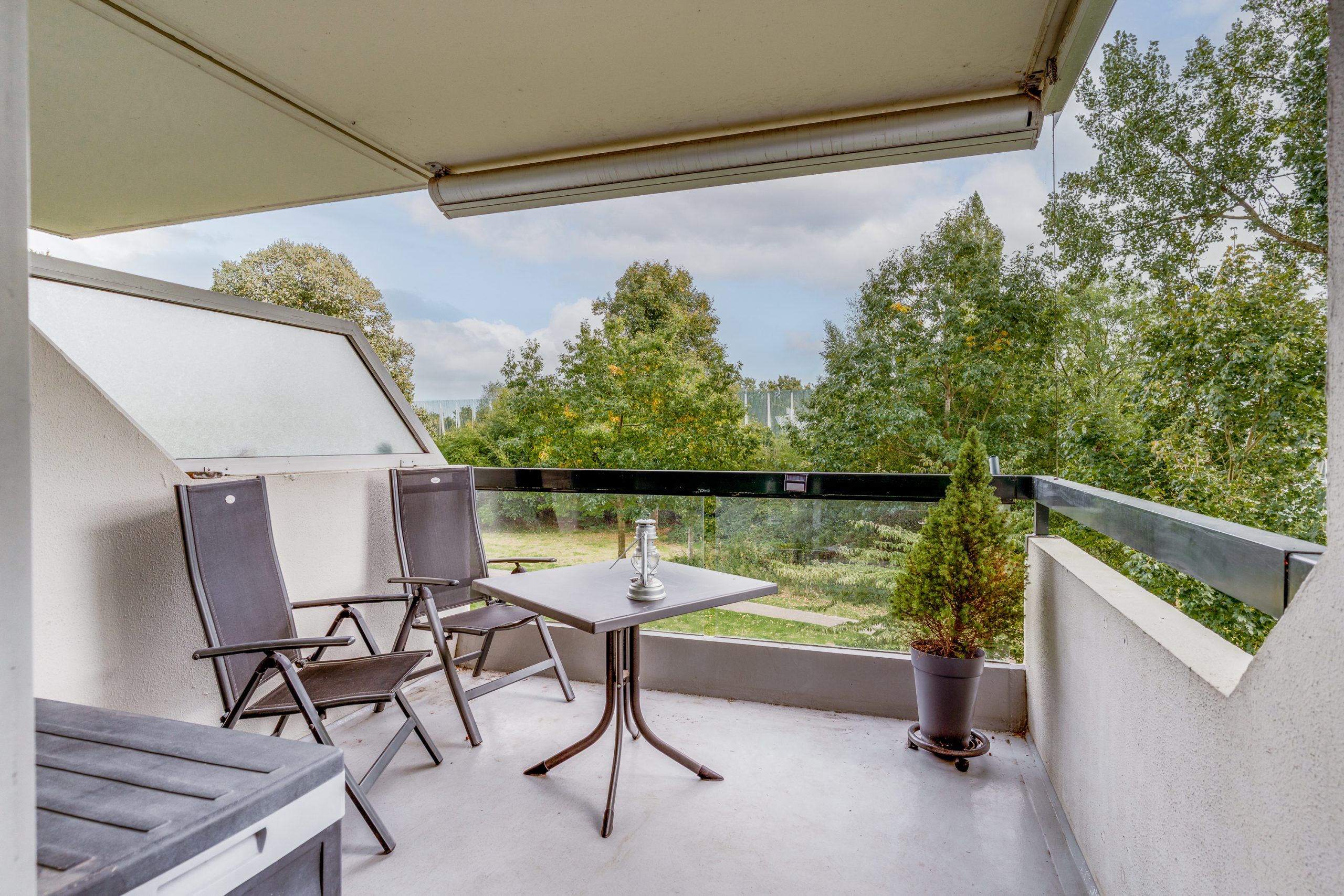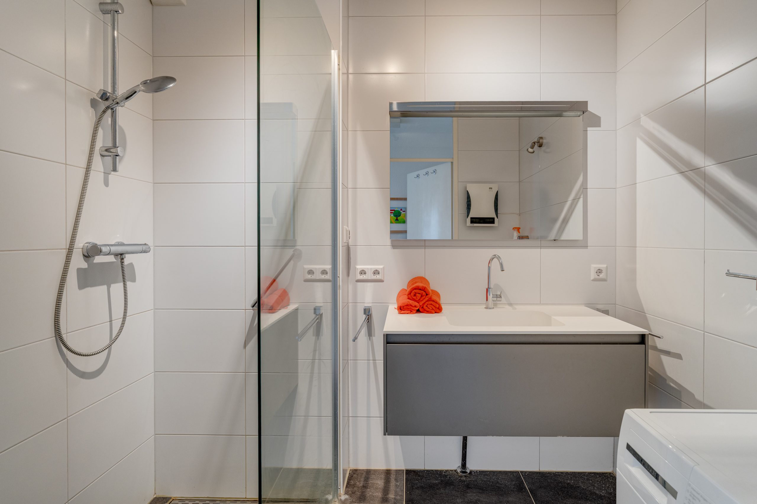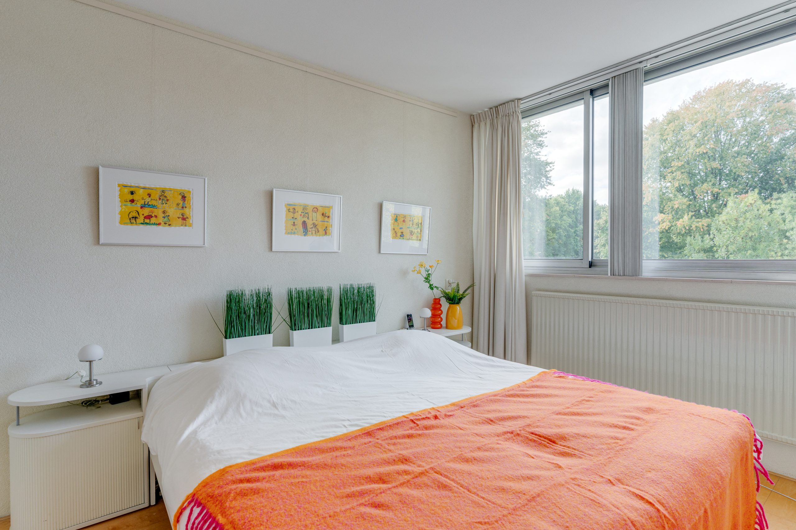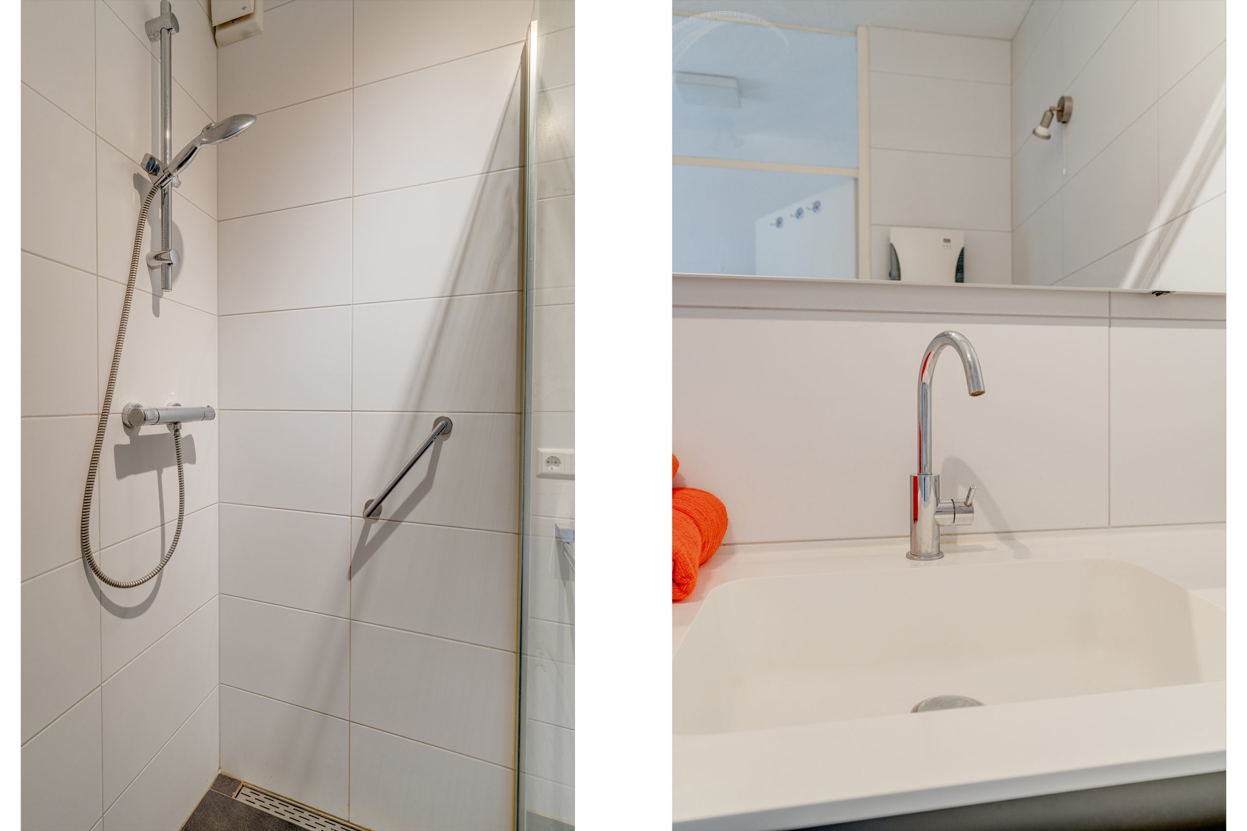De 2 slaapkamers, beide met lamelparket, zijn 9 m2 en 13 m2 groot. Ook deze zijn aan de voorzijde gelegen zodat deze kamers in de zomer redelijk koel blijven. De nette badkamer is voorzien een grote inloopdouche, wastafelmeubel, opstelplaats voor de wasmachine, mechanische ventilatie en een elektrische verwarming. Naast de badkamer is nog een modern hangend toilet met fonteintje aanwezig.