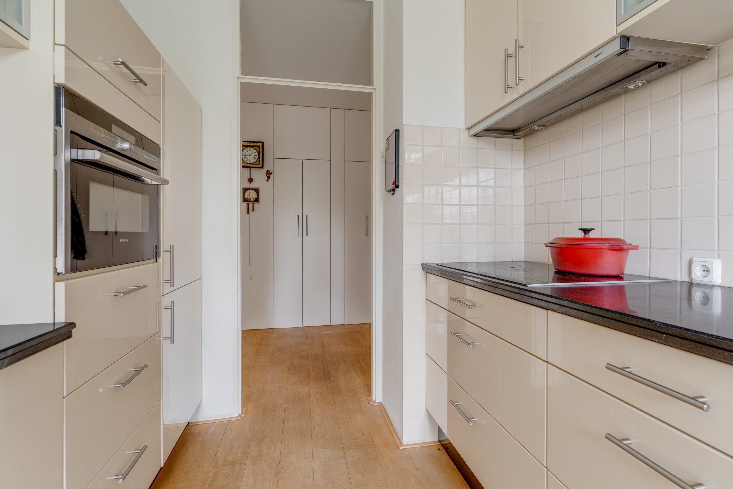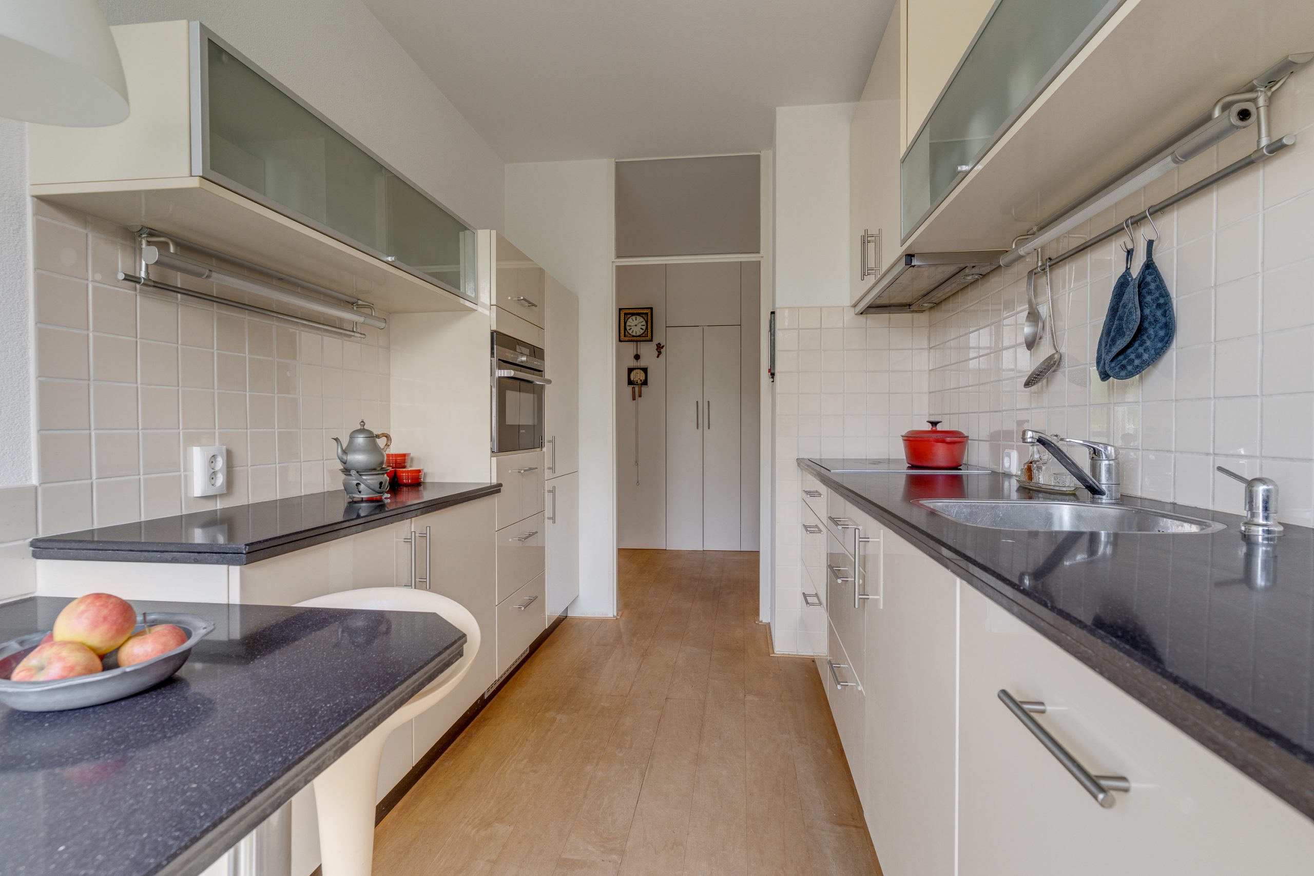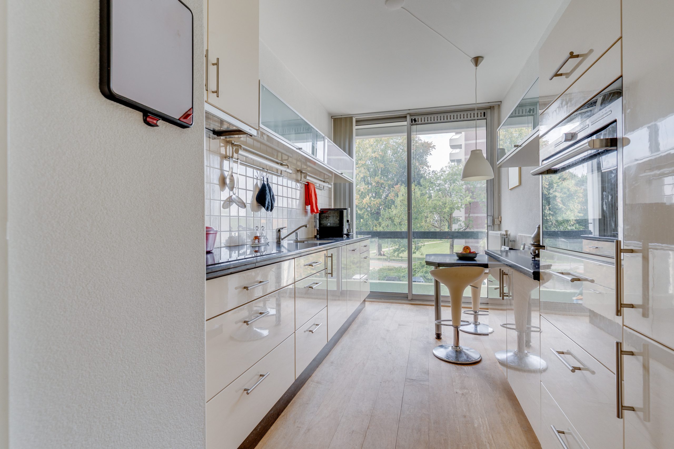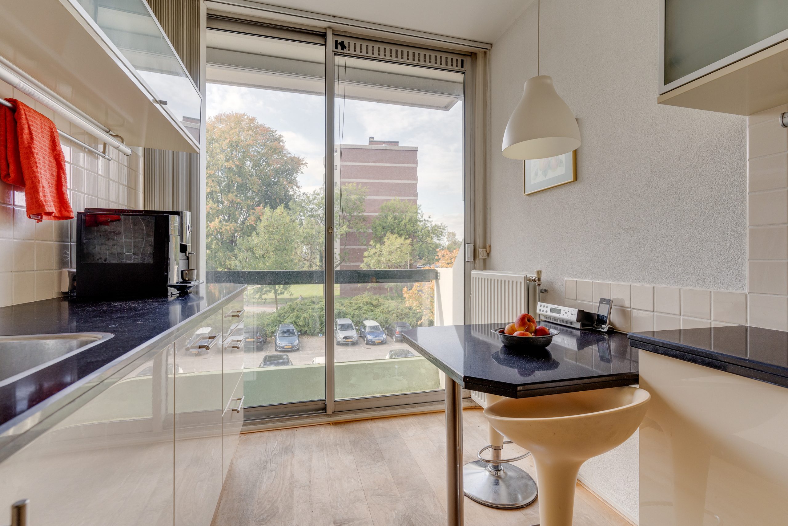 De keurige keuken is voorzien van een composiet blad, inclusief coffee-corner en ontbijttafeltje. Daarnaast is de nodige apparatuur zoals een inductiekookplaat, recirculatiekap, oven, koelkast en een vaatwasser (defect) aanwezig. Vanuit de keuken bereikt u het 2e balkon aan de voorzijde, gelegen op de middag- en avondzon en met uitzicht op de Barneveldse Beek.