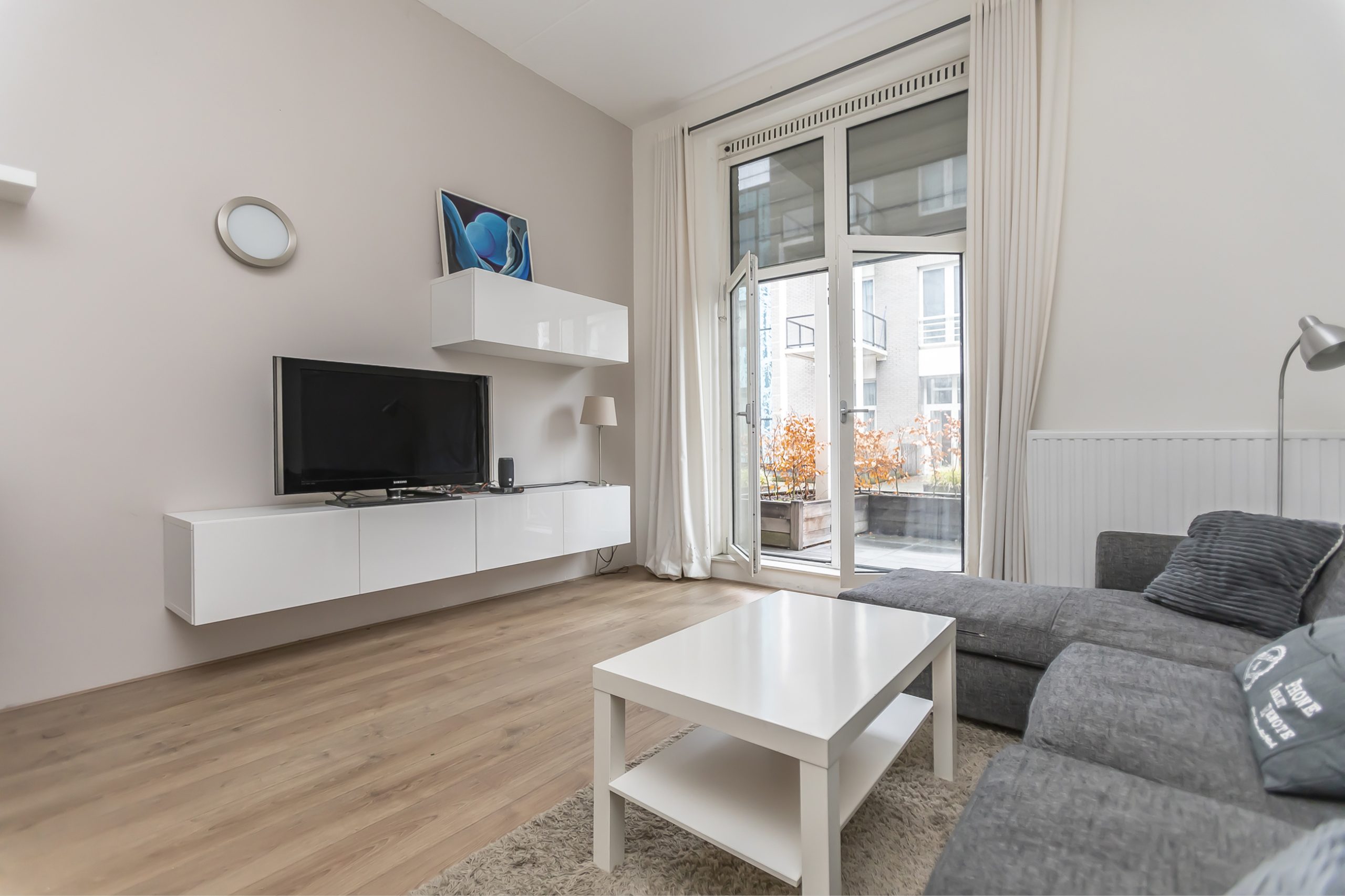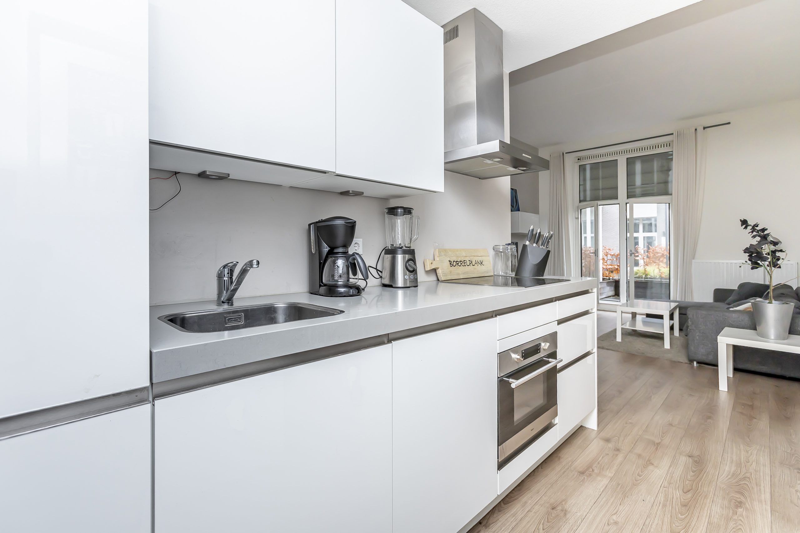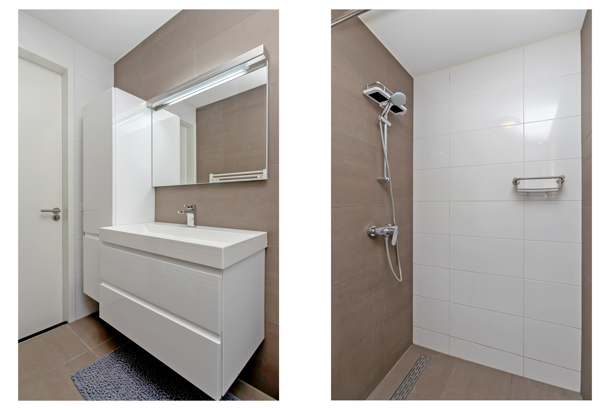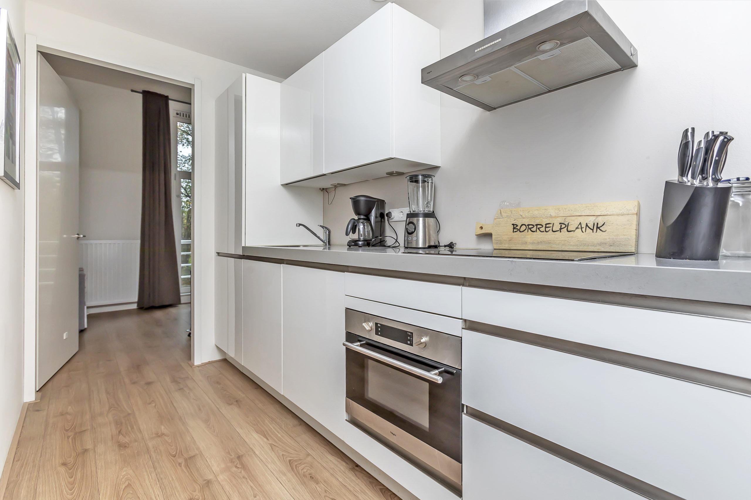 Via entree met intercominstallatie naar centrale hal, entree appartement. Hal. Moderne toiletruimte met fontein. Bergruimte met aansluitingen wasmachine en droger. Woonkamer met toegang tot het terras. Moderne keuken met inbouwapparatuur zoals een combi-oven, inductiekookplaat met afzuigkap, koel-vriescombinatie en vaatwasser. Slaapkamer. Hal. Slaap-/werkkamer. Moderne badkamer met een ruime inloopdouche en wastafelmeubel.