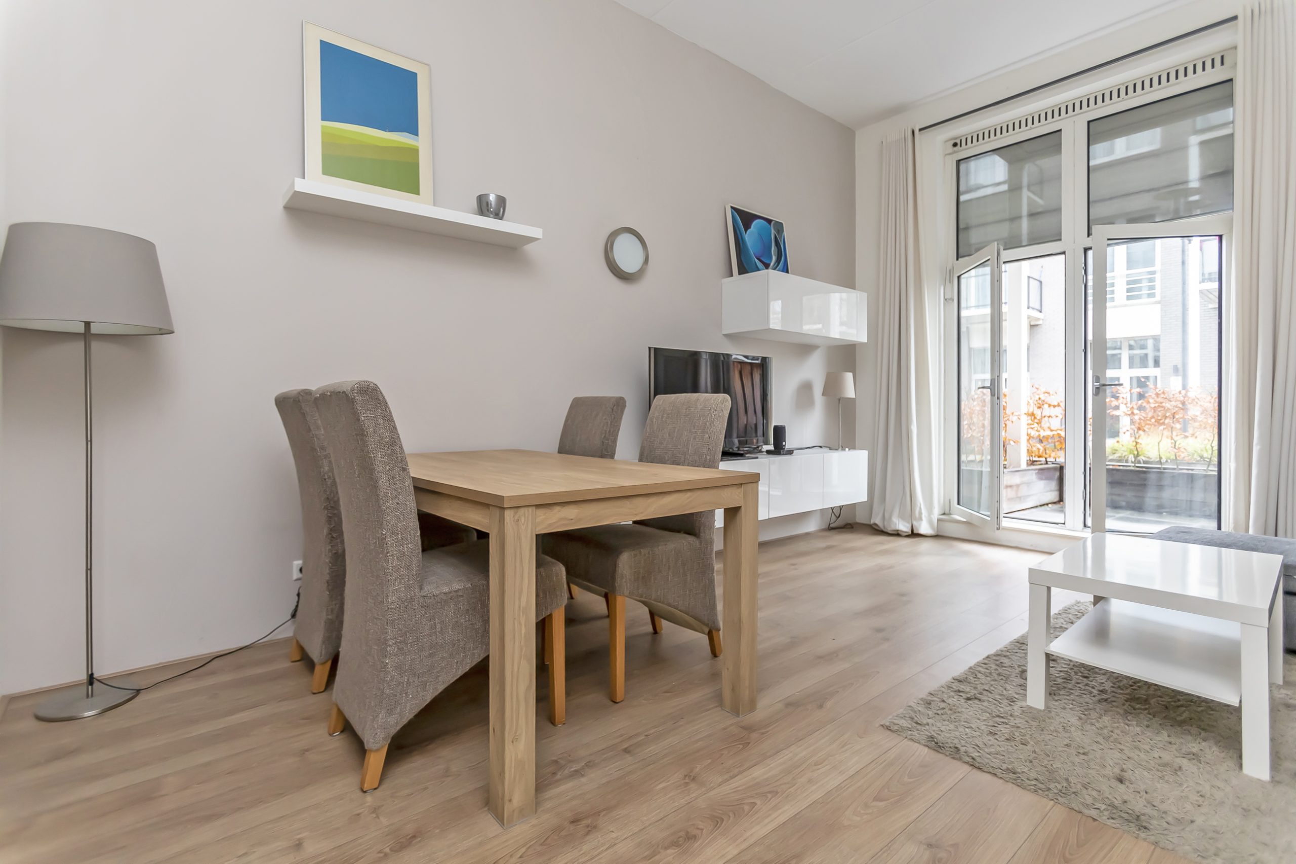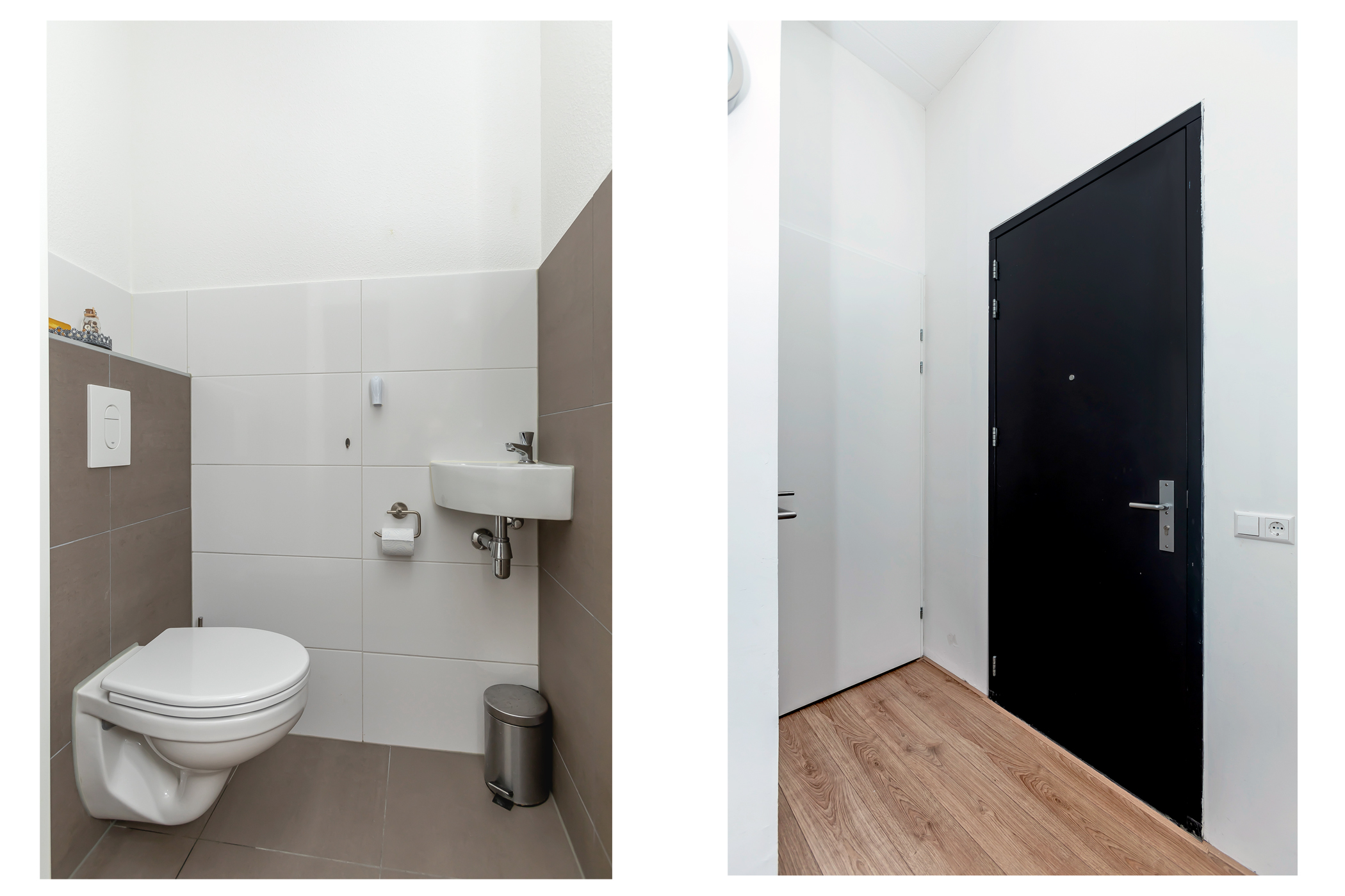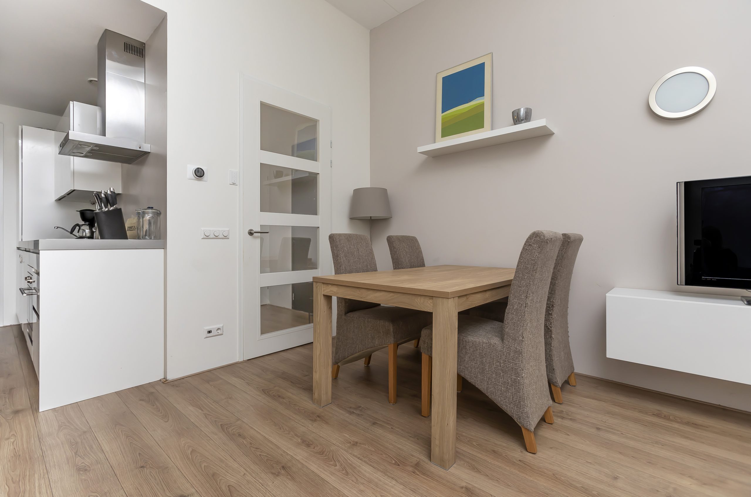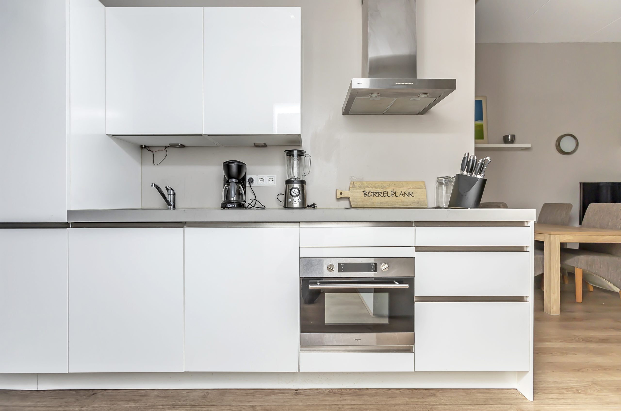 Via entree met intercominstallatie naar centrale hal, entree appartement. Hal. Moderne toiletruimte met fontein. Bergruimte met aansluitingen wasmachine en droger. Woonkamer met toegang tot het terras. Moderne keuken met inbouwapparatuur zoals een combi-oven, inductiekookplaat met afzuigkap, koel-vriescombinatie en vaatwasser. Slaapkamer. Hal. Slaap-/werkkamer. Moderne badkamer met een ruime inloopdouche en wastafelmeubel.