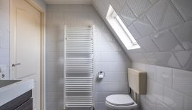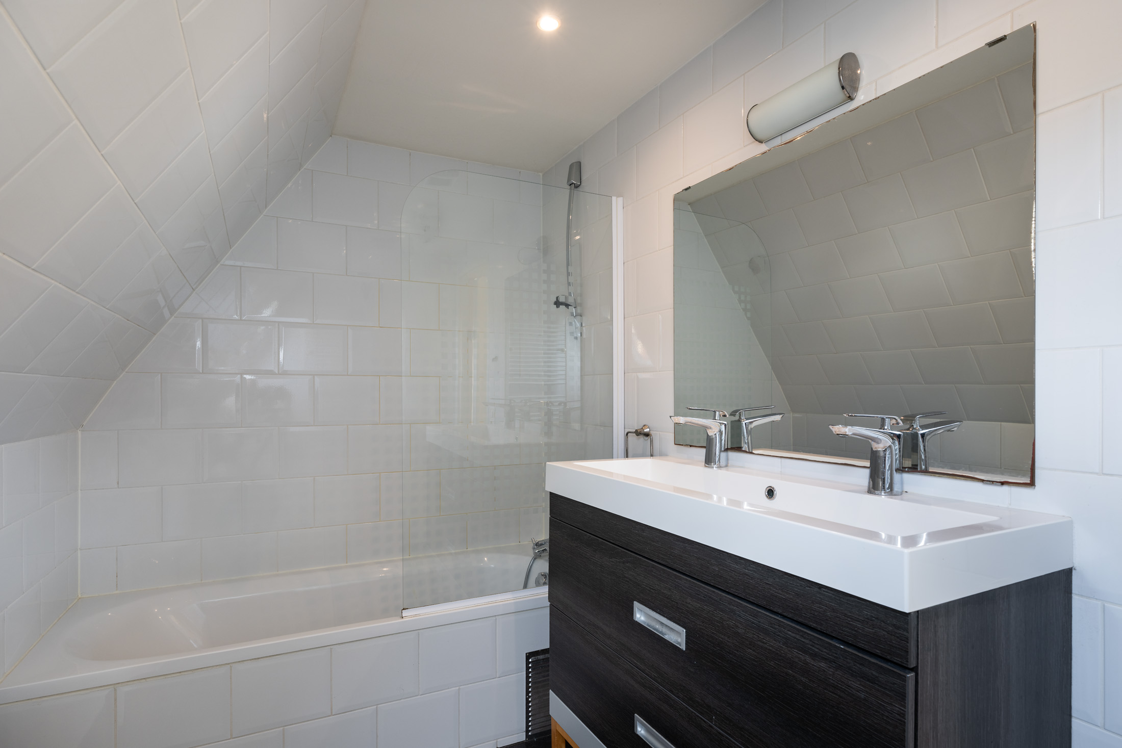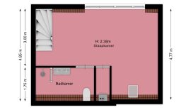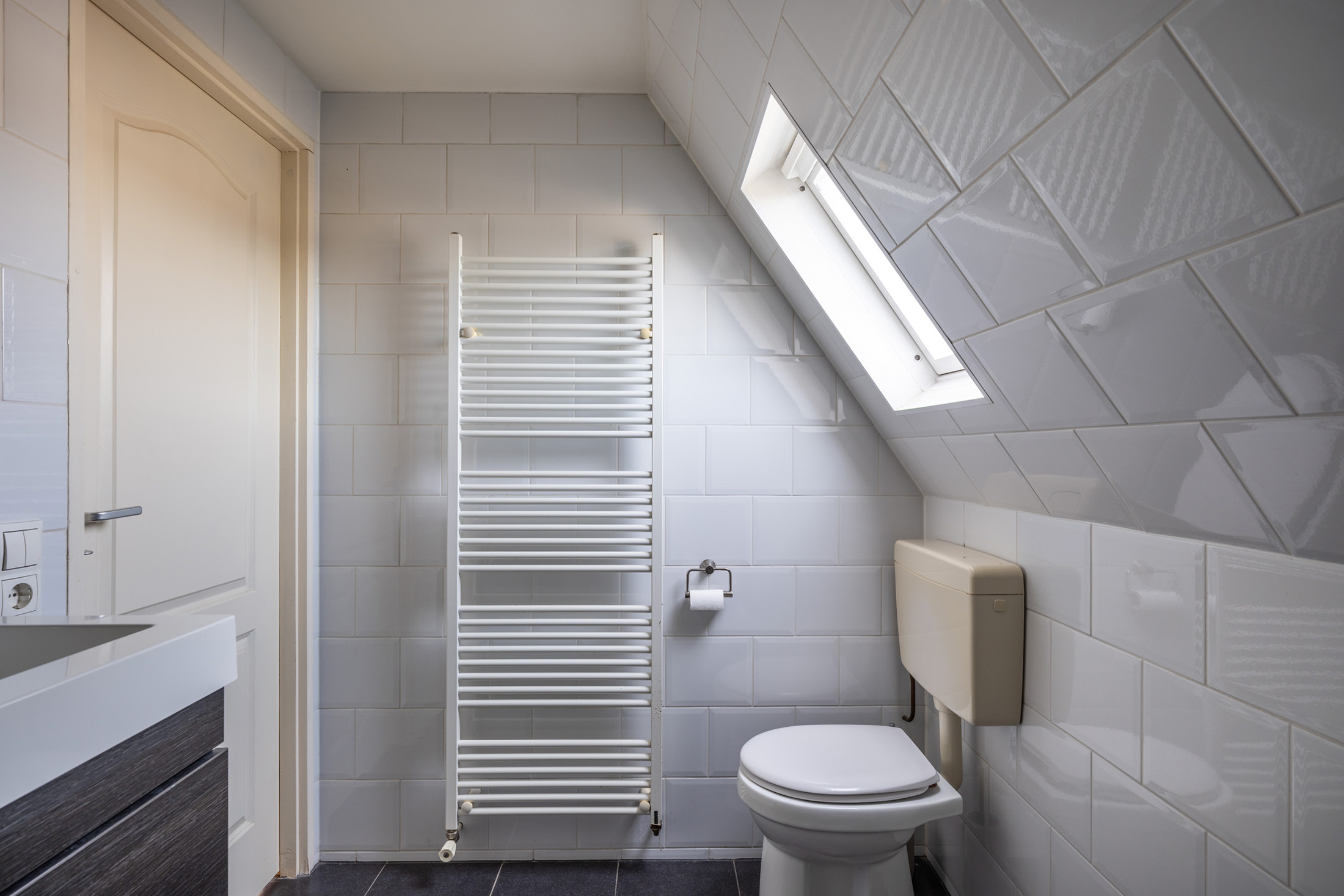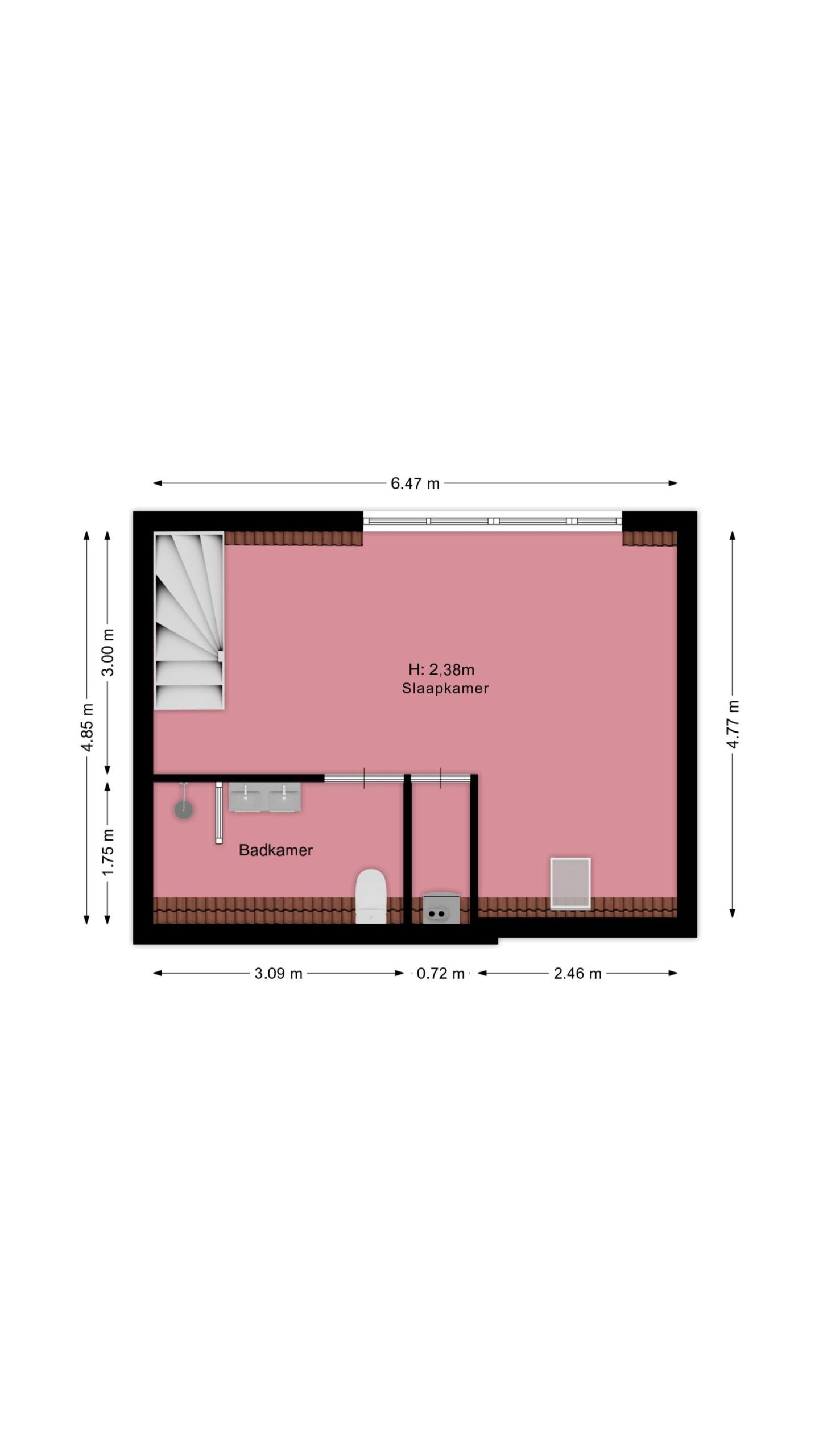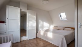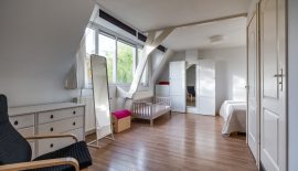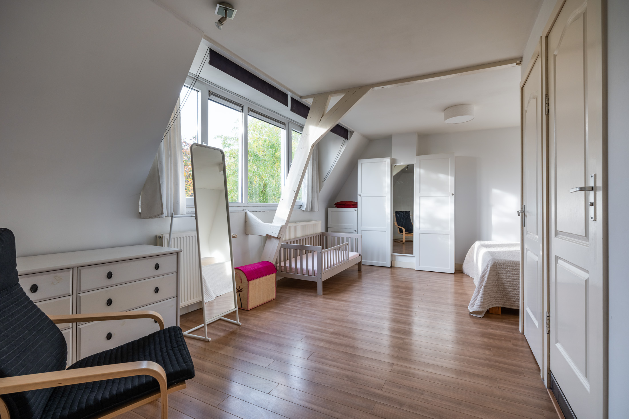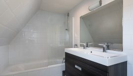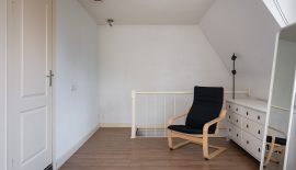 Zeer grote slaapkamer met dakkapel aan de voorzijde. Deze kamer is zo groot dat hij eenvoudig in tweeën te splitsen is, waardoor je een tweede slaapkamer kunt creëren. Aan de achterzijde vind je de, eveneens ruime, badkamer, die voorzien is van een bad met douche, dubbele wastafel met opbergmeubel en een toilet.