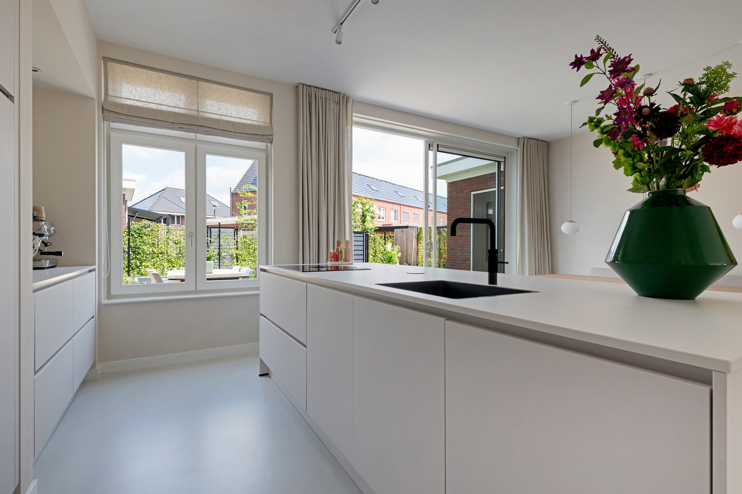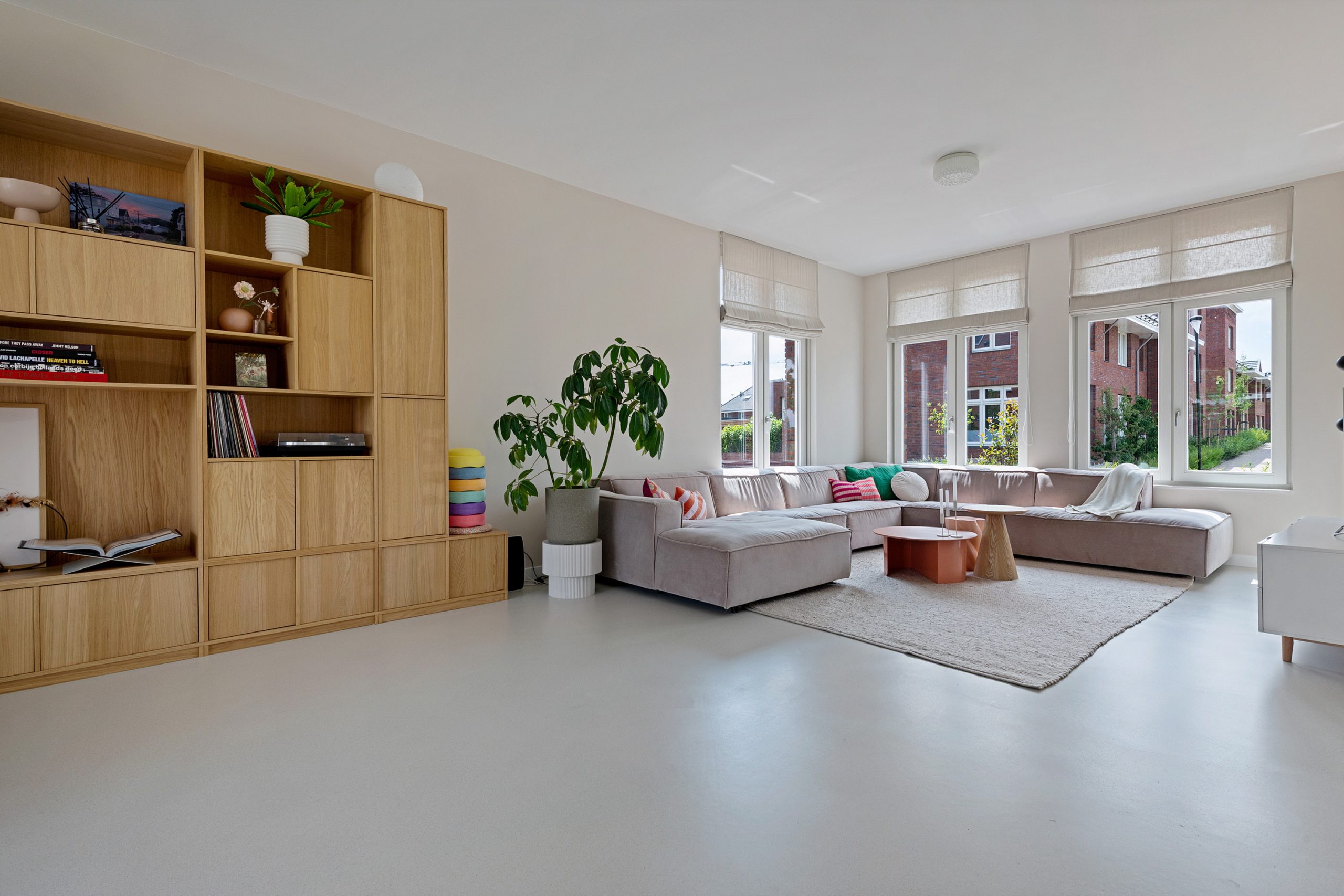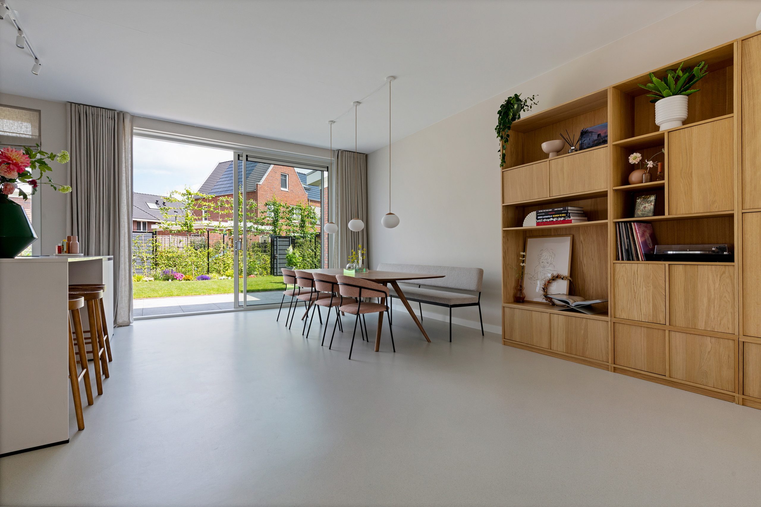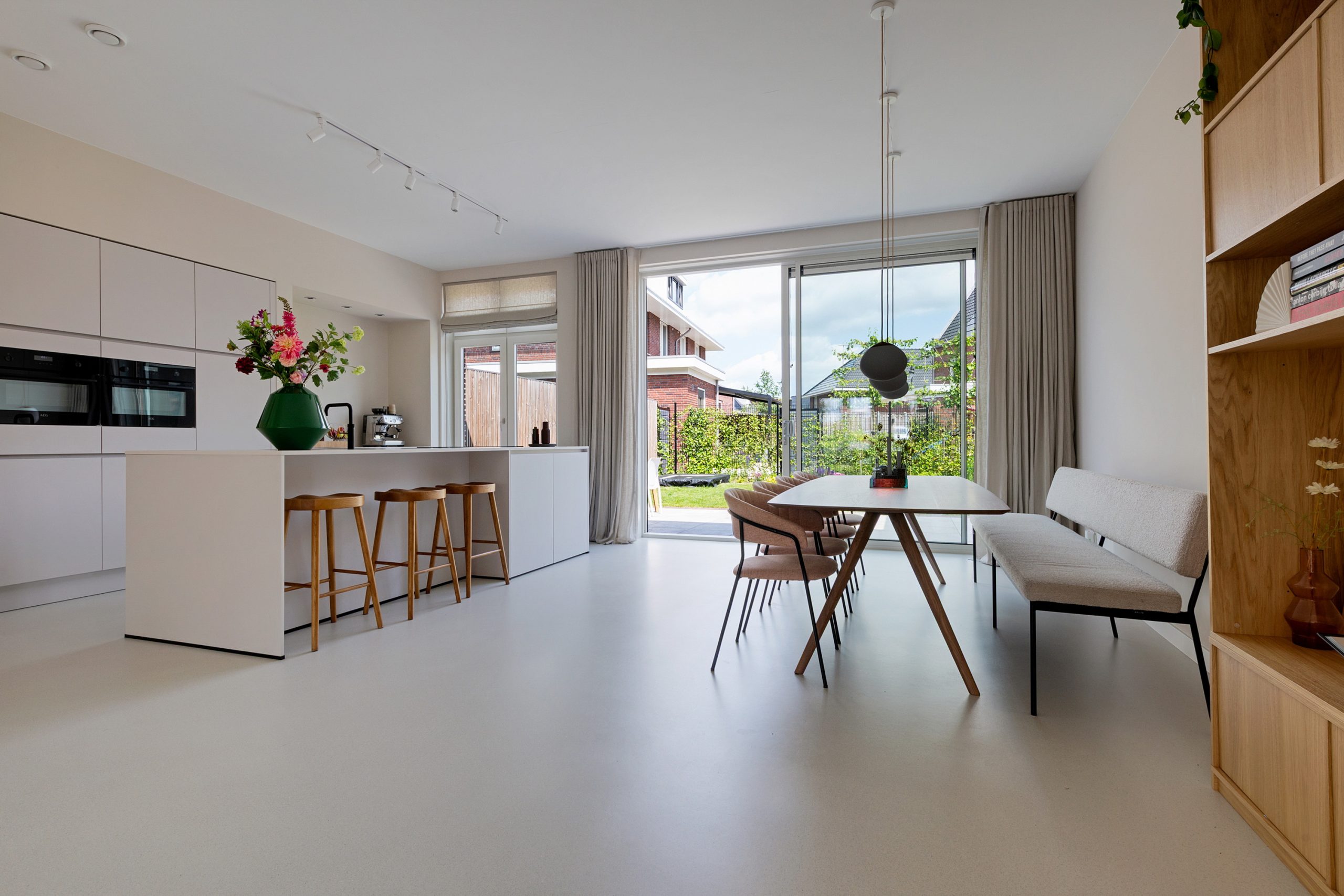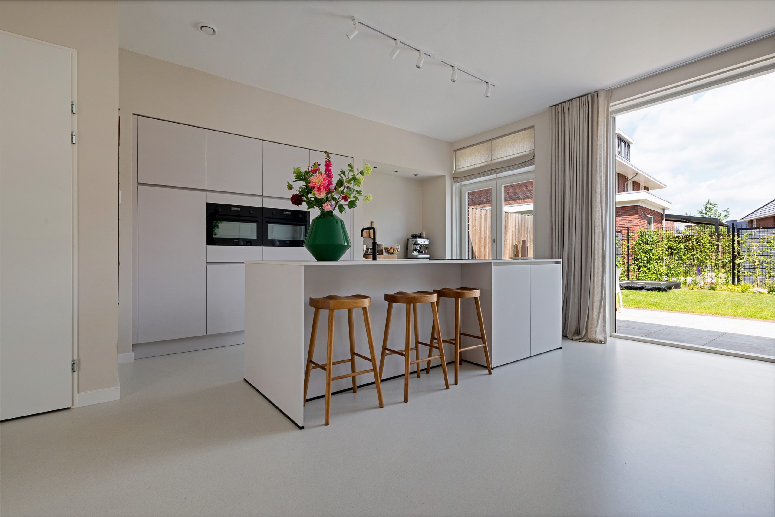 Entree, hal met garderobehoek, meterkast met waterontharder, luxe hangend toilet met fonteintje en trapopgang. Toegang tot de zeer royale woonkamer met lichtinval aan drie zijden, trapkast en opstelling van de warmtepomp i.c.m. boiler. De fraaie gietvloer zorgt ervoor dat het licht zich overal verspreidt. Vanuit de zithoek kijk je in de lengterichting uit op het grote nieuwe park. Aan de tuinzijde ligt de woonkeuken over de volle breedte en is extra diep dankzij de uitbouw van 2,4 meter; hierdoor is er naast het keukeneiland ook plaats voor een grote familietafel.