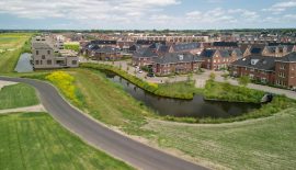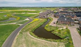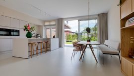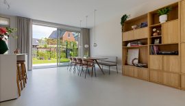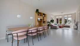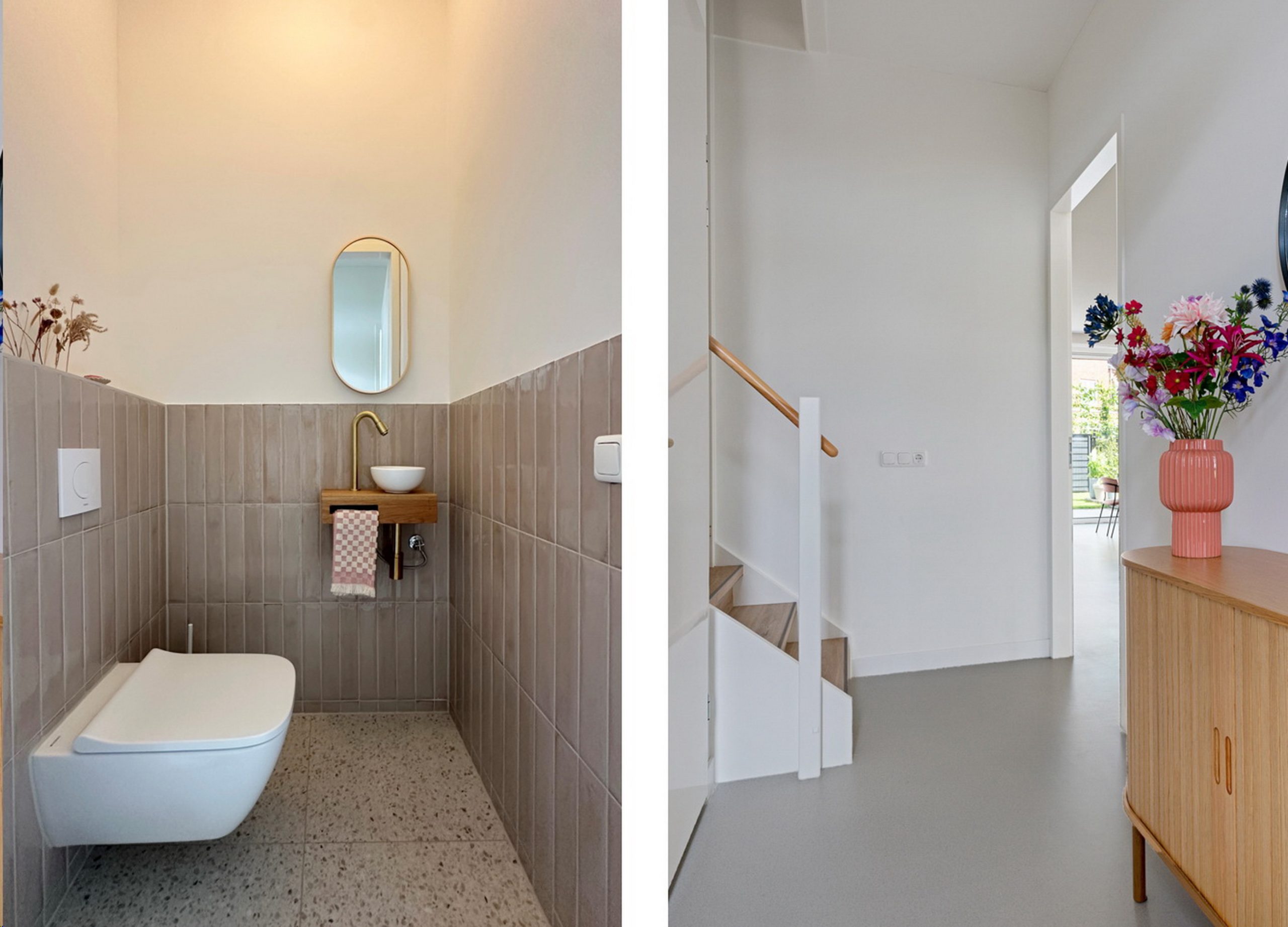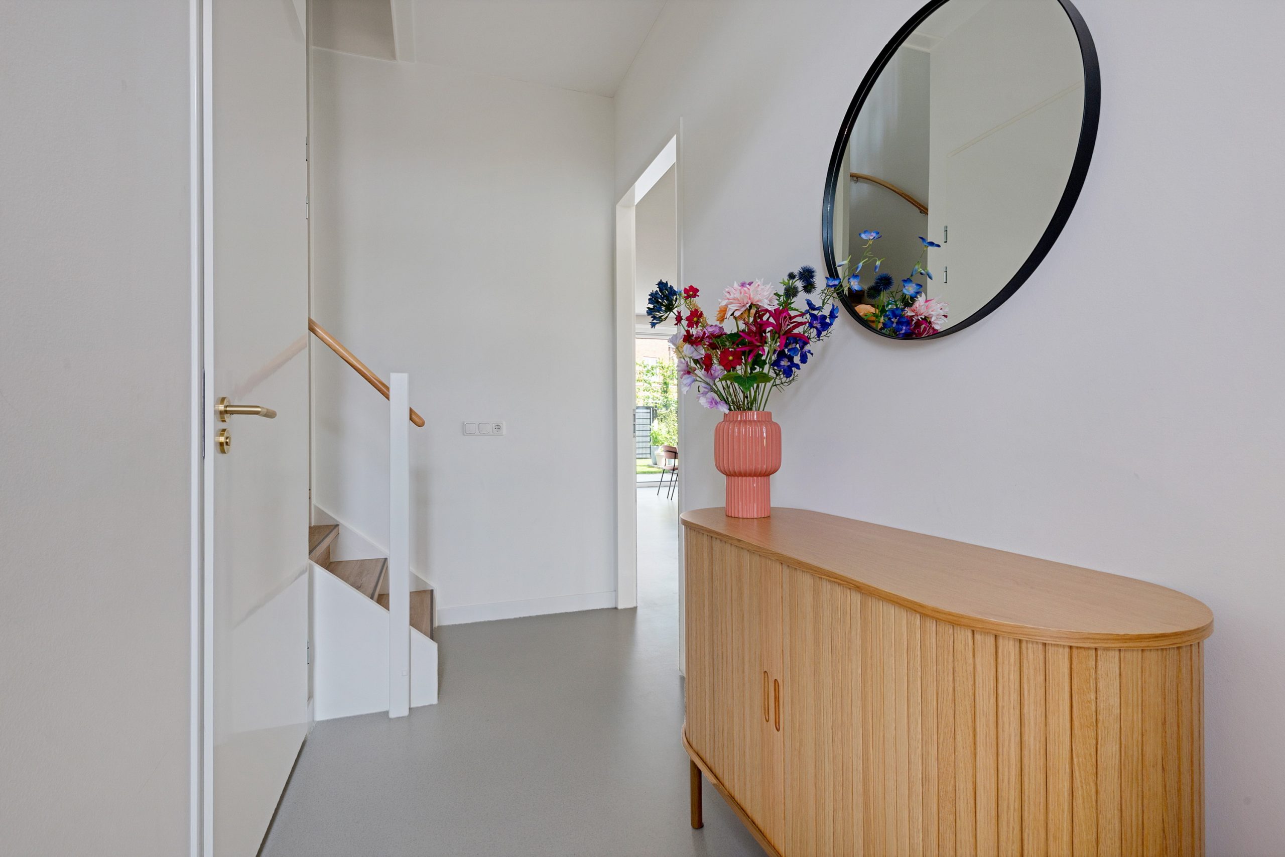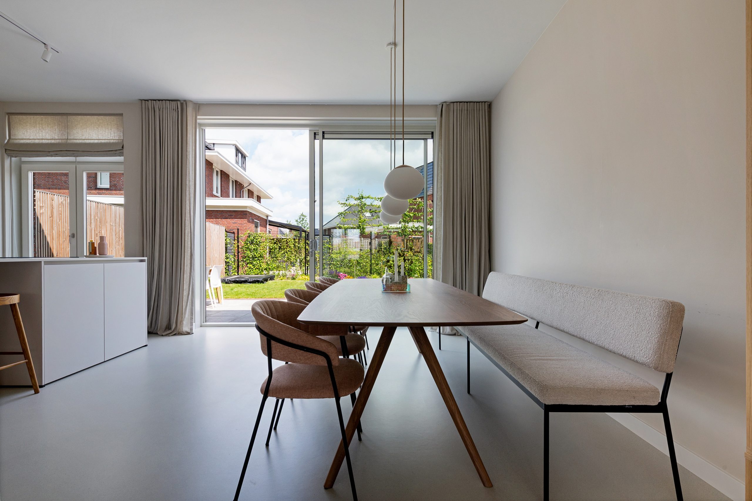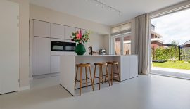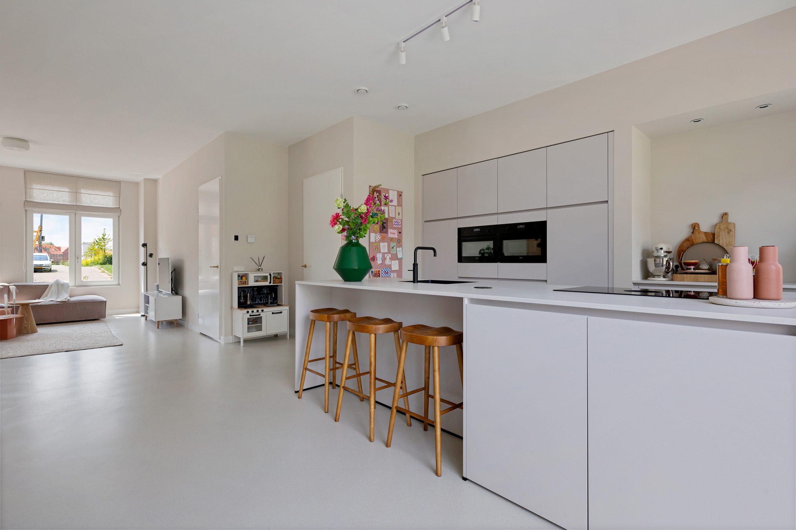 Entree, hal met garderobehoek, meterkast met waterontharder, luxe hangend toilet met fonteintje en trapopgang. Toegang tot de zeer royale woonkamer met lichtinval aan drie zijden, trapkast en opstelling van de warmtepomp i.c.m. boiler. De fraaie gietvloer zorgt ervoor dat het licht zich overal verspreidt. Vanuit de zithoek kijk je in de lengterichting uit op het grote nieuwe park. Aan de tuinzijde ligt de woonkeuken over de volle breedte en is extra diep dankzij de uitbouw van 2,4 meter; hierdoor is er naast het keukeneiland ook plaats voor een grote familietafel.