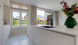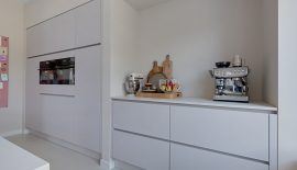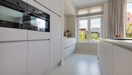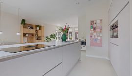 De strakke, tijdloze keuken omvat een kastenwand met inbouwapparatuur alsmede een mooie grote coffee-corner. Het kook- en spoeleiland mag er ook zijn: heerlijk ruim bemeten en voorzien van een eetbar. Uiteraard is alle denkbare apparatuur aanwezig zoals o.a. een Bora, Quooker, 2 ovens, etc.