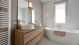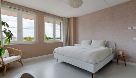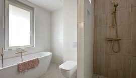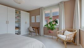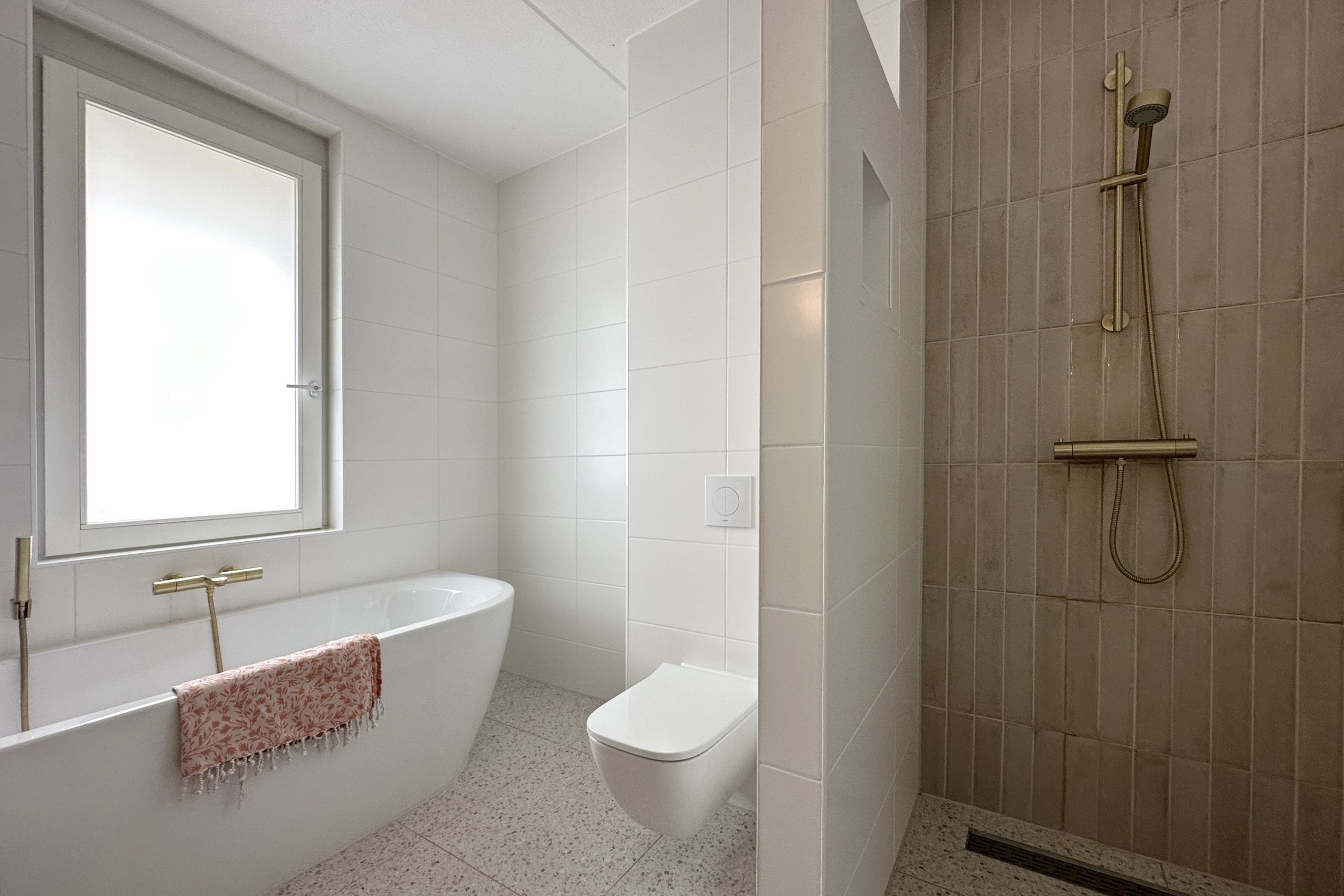 Overloop, drie ruime slaapkamers, waarvan de slaapkamer aan de voorzijde maar liefst drie gevelramen heeft met zicht op het park. Uiteraard biedt de luxe badkamer met messing accenten alle comfort die je wenst: een ligbad, inloopdouche, hangend toilet, meubel met 2 waskommen en een designradiator. De gehele etage is strak afgewerkt met een gietvloer en vloerverwarming.
