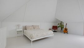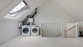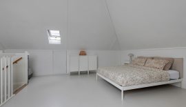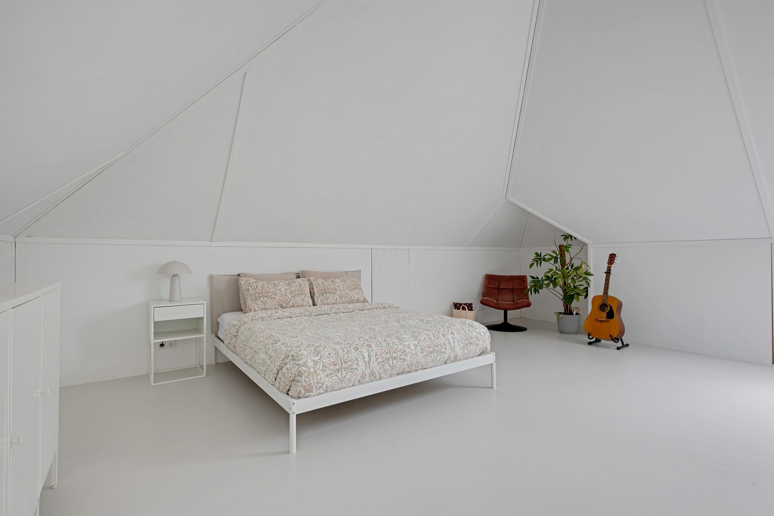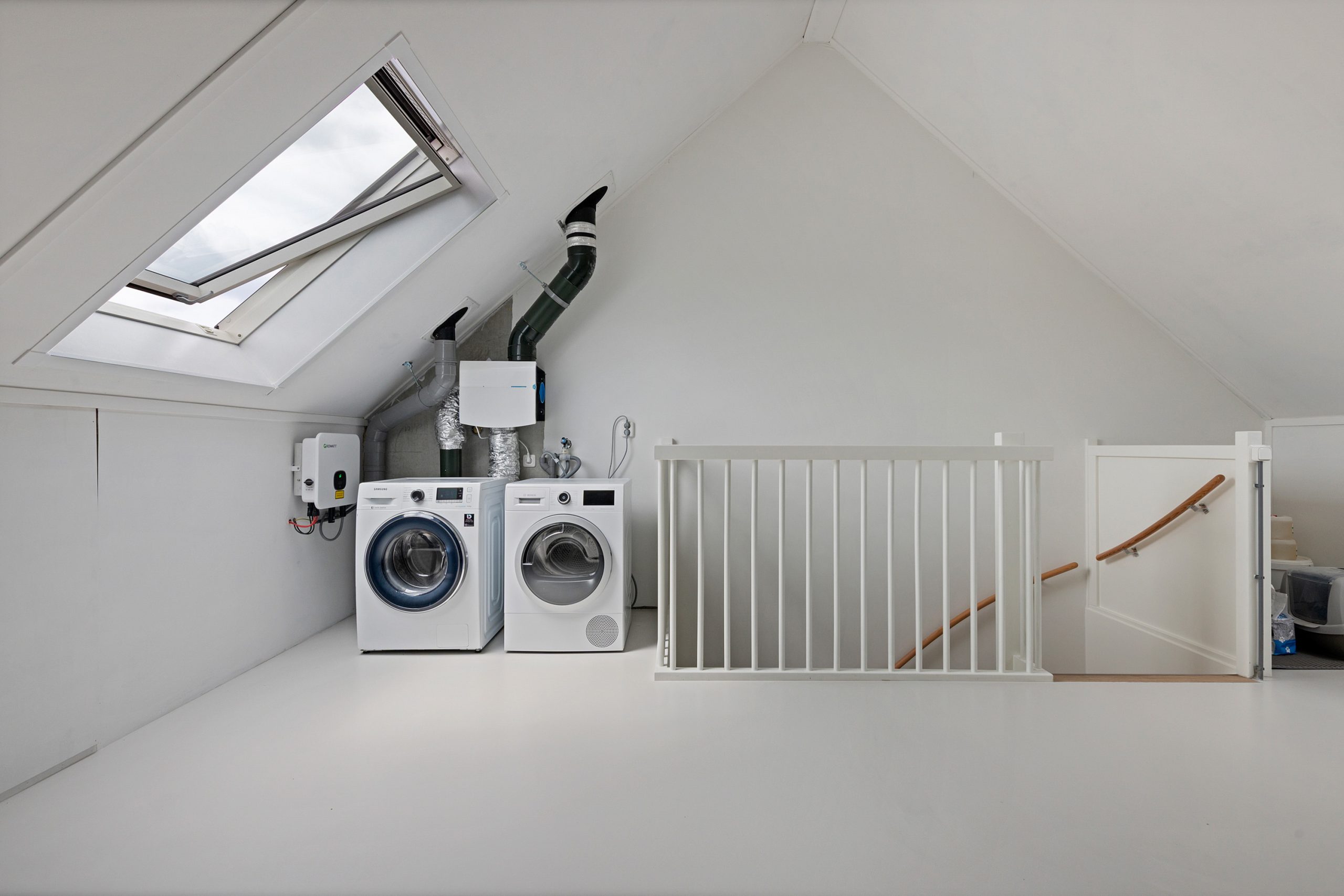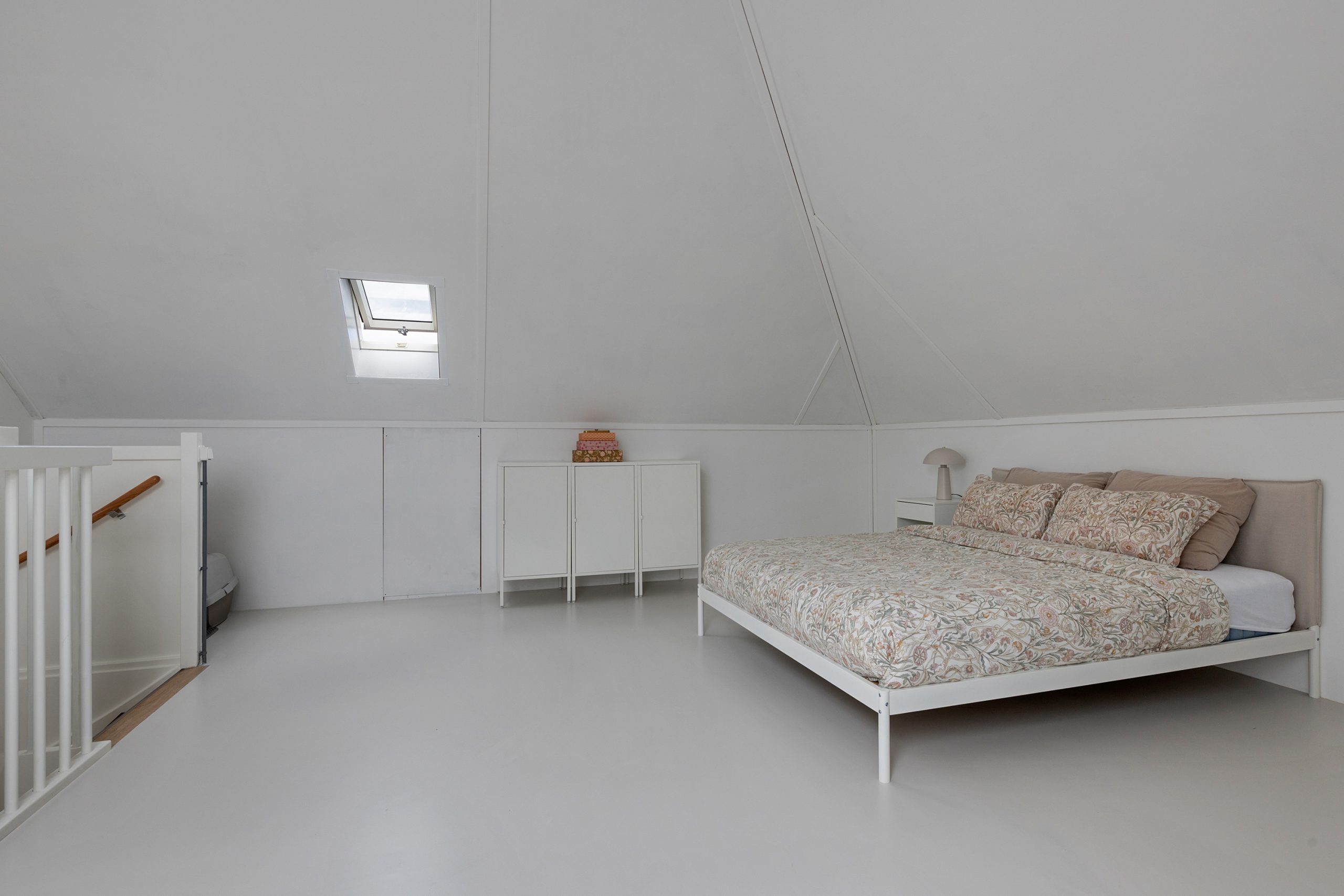 Royale open zolderetage, afgewerkt met een prachtige gietvloer, 2 dakramen en berging. Deze ruimte is geschikt om in te delen met bijvoorbeeld 1 of 2 extra slaap- / werkkamers, tevens bevindt zich hier de wasmachine-aansluiting en de mechanische ventilatie. Het gehele zijdak bestaat uit onopvallende zonnepanelen.