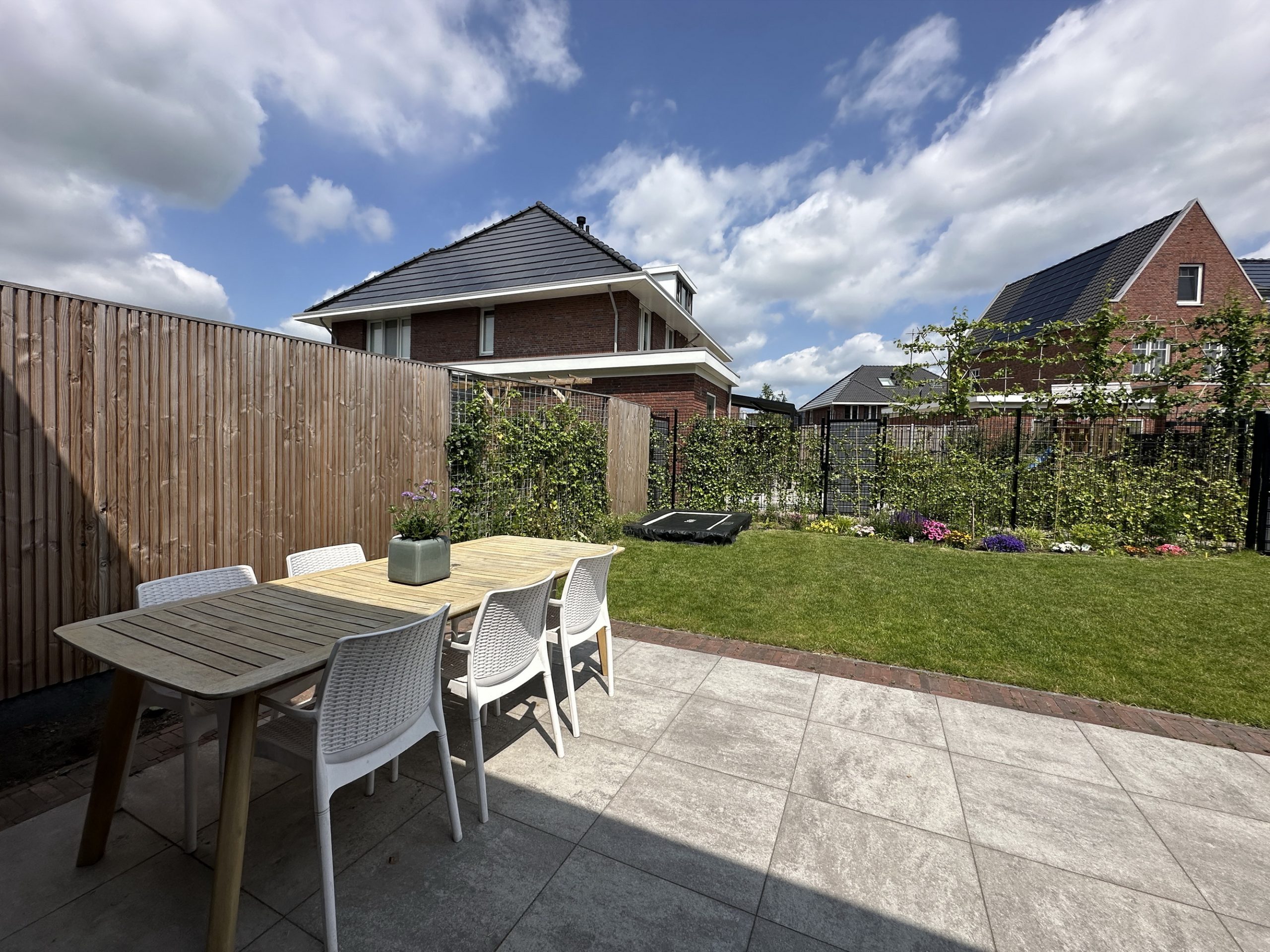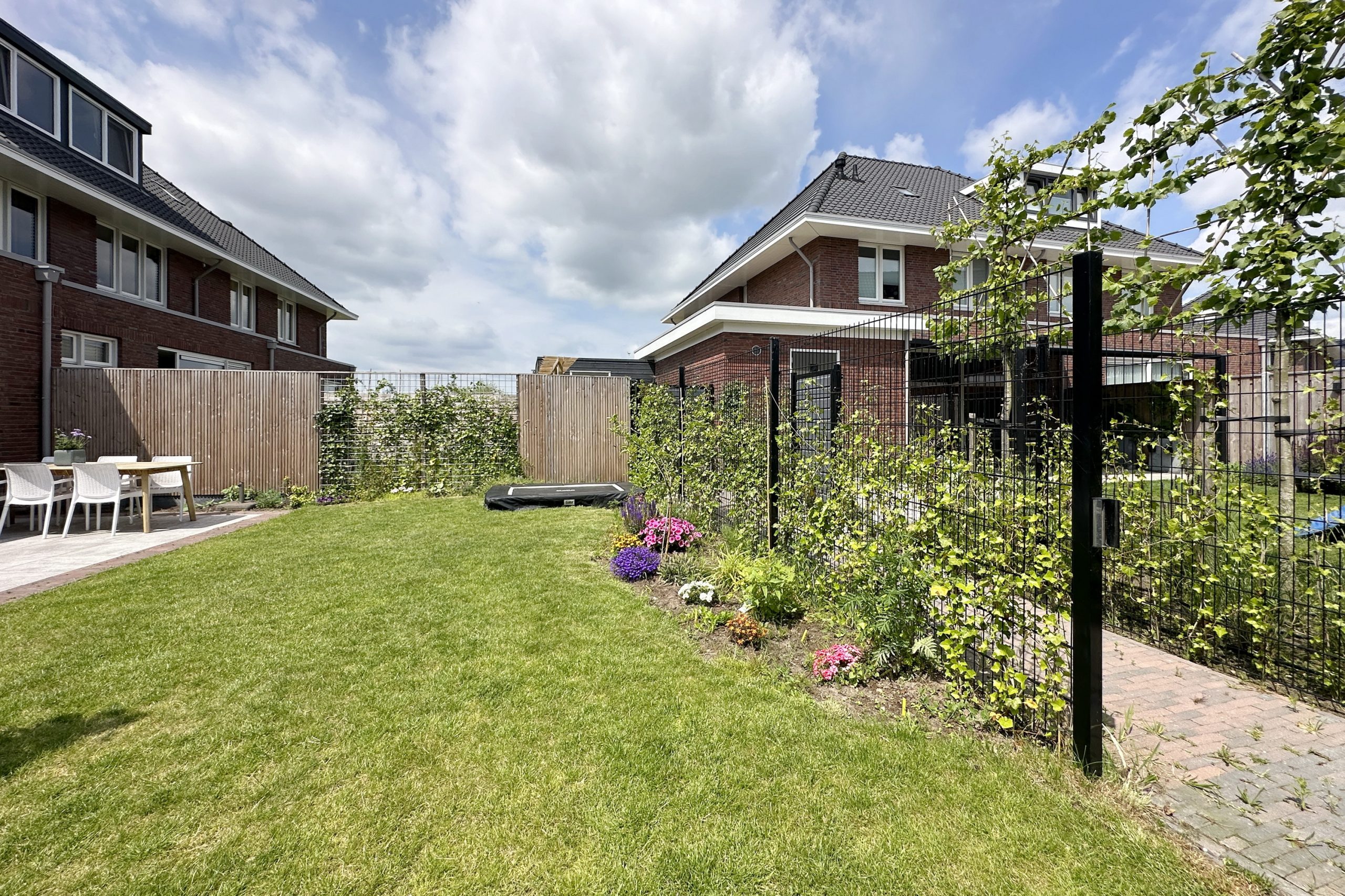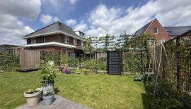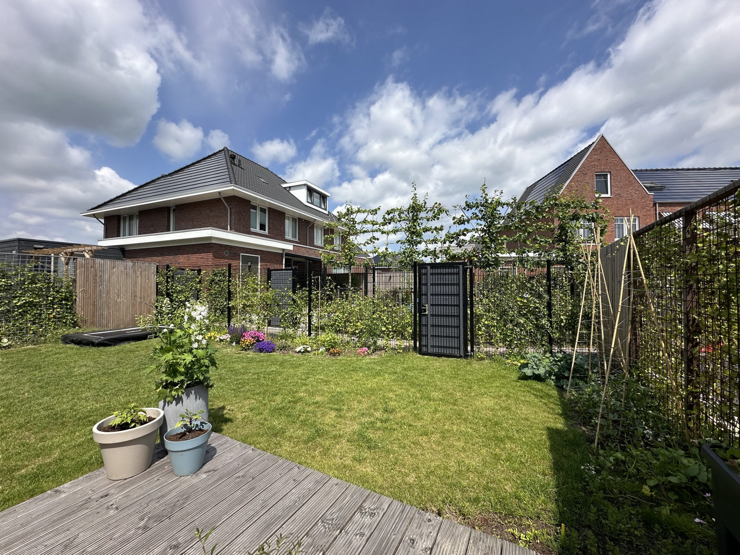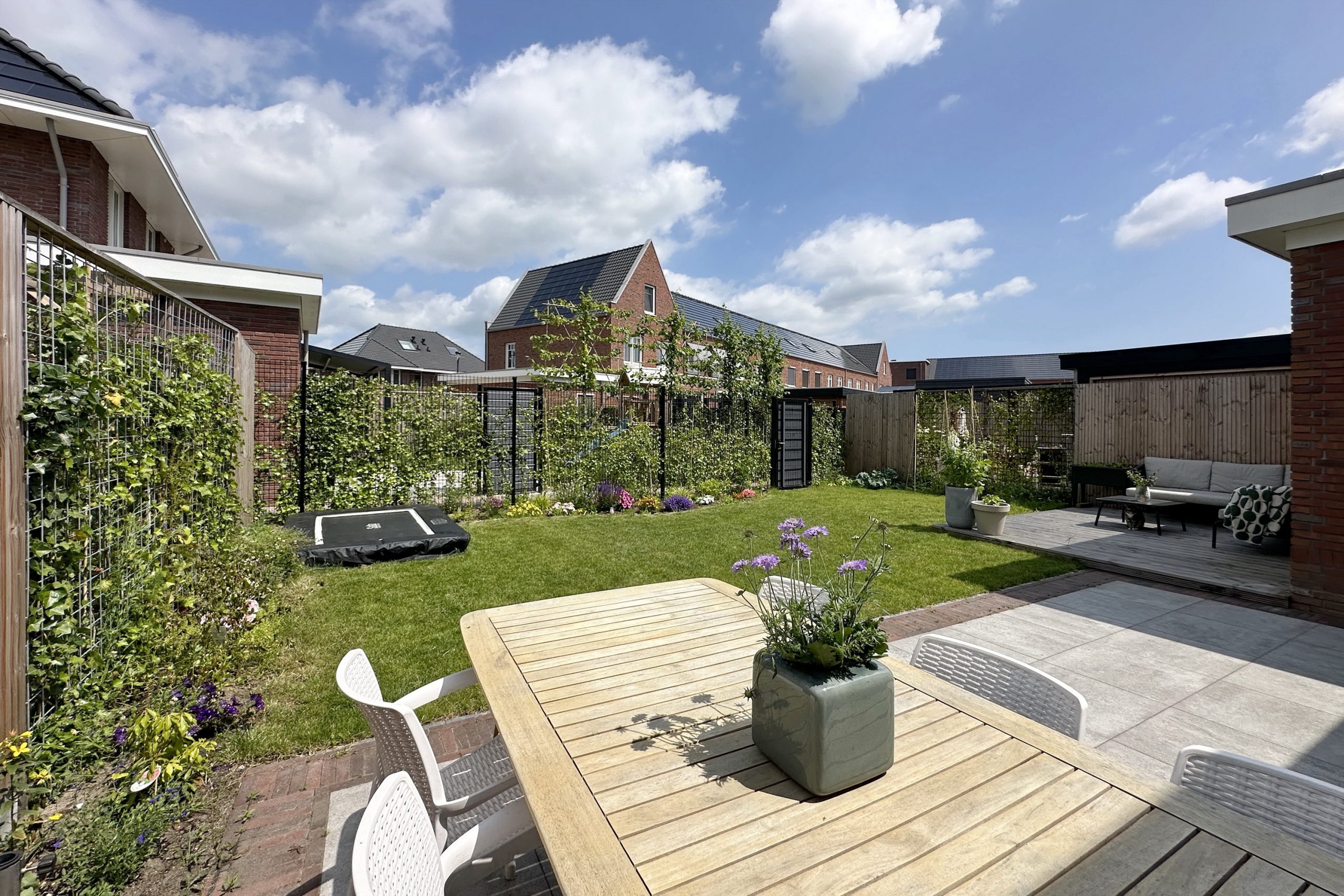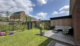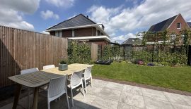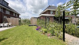 Buiten is het genieten in de strak aangelegde tuin met trampoline, groot gazon, plantenborders en een achterom. Gedurende de dag draait de zon van de ene naar de andere zijde, zodat je van de vroege ochtend tot de late avond van de zon kunt genieten. De aangebouwde stenen garage met zijdeur heeft een hoog dak en is voorzien van een elektrische deur en een ruime oprit.