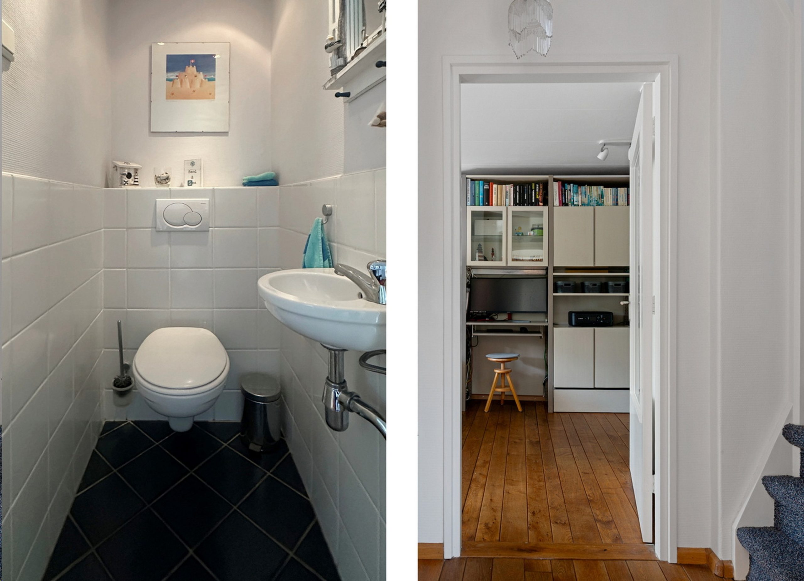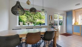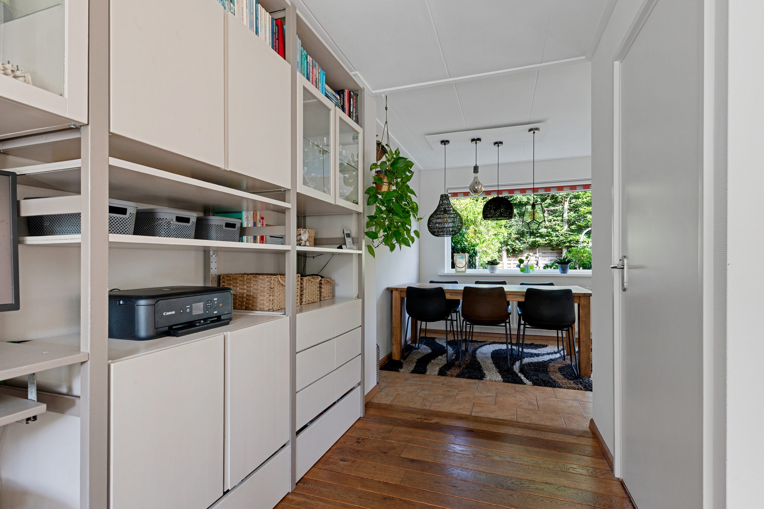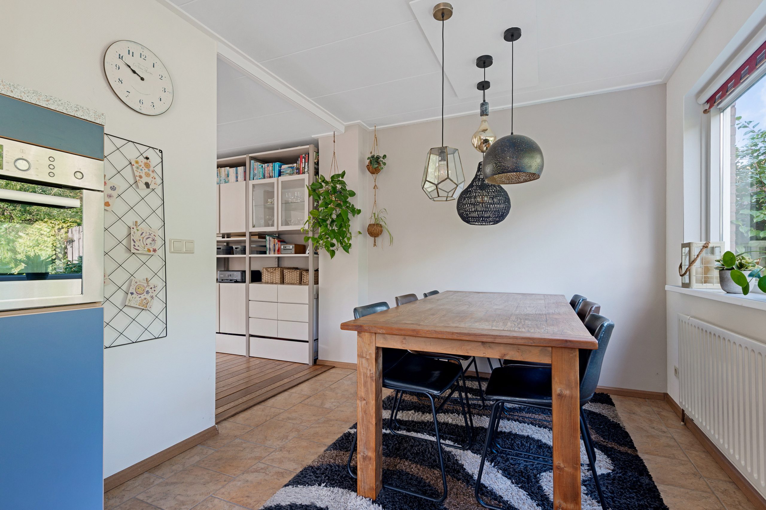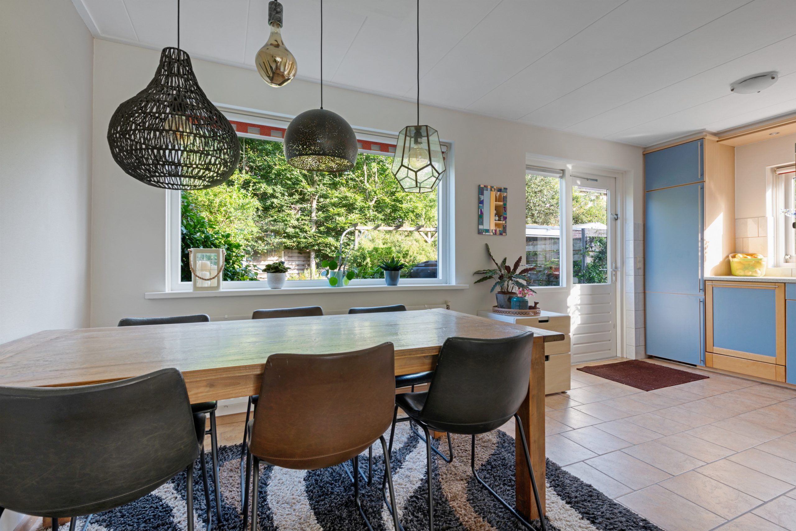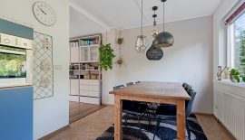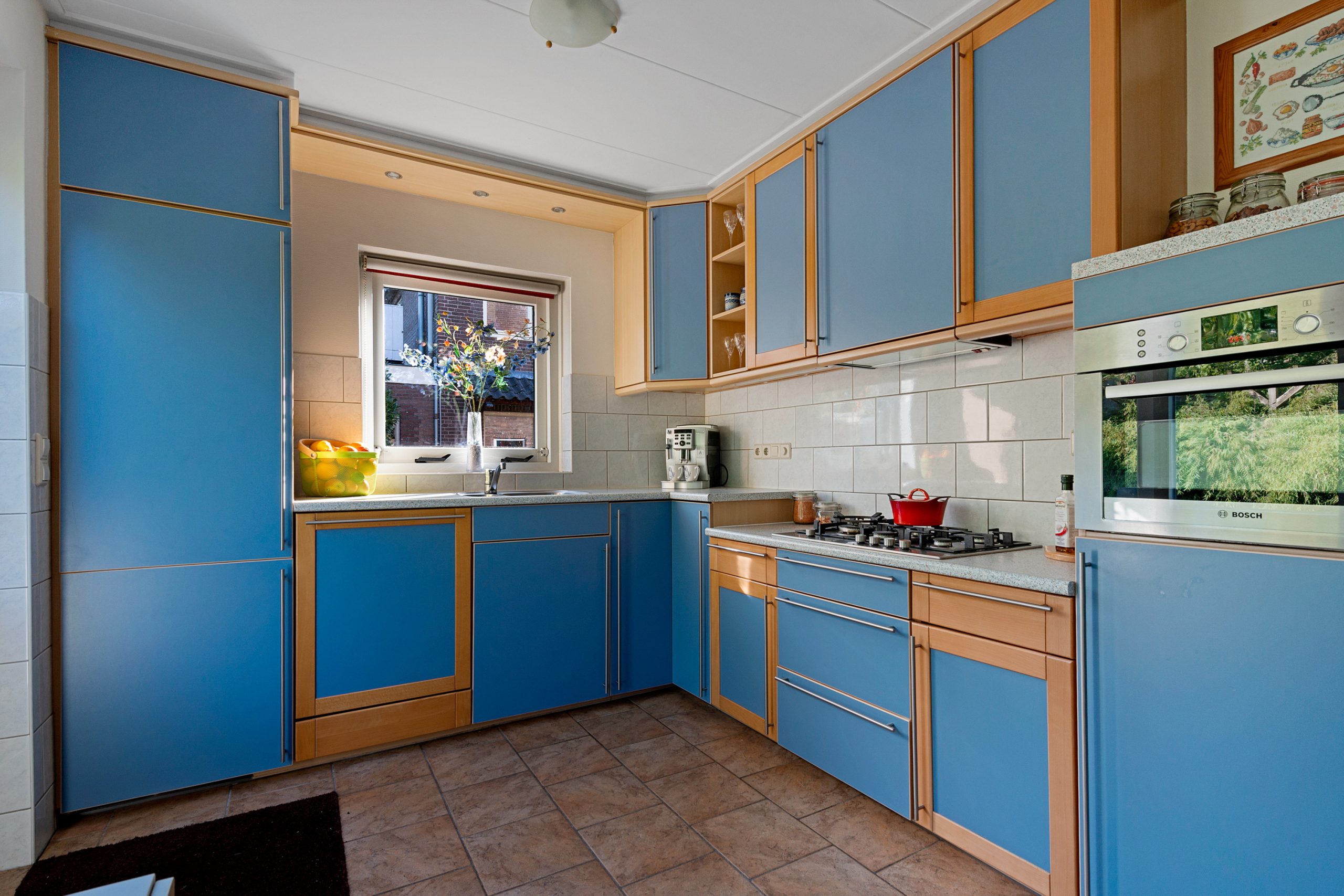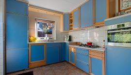 Zij-entree met vestibule, meterkast, hal met hangend toilet en trapopgang. Ruime L-vormige woonkamer van 31 m2 met eiken vloerdelen, kelderkast, zijraam en aan de voorzijde een erker en openslaande tuindeuren naar het zonneterras op het zuid-oosten. Dankzij de vele raampartijen is de woonkamer altijd vrolijk, zonnig en heerlijk licht! Aan de achterzijde bevindt zich een ruime aangebouwde woonkeuken in hoekopstelling, voorzien van plavuizen met vloerverwarming, meerdere ramen en een tuindeur. Hoewel de keuken al wat jaren mee gaat zijn er meerdere apparaten de afgelopen jaren vervangen. Zo zijn de combi-magnetron, vaatwasser, koel-/vrieskast en de 5-pits kookplaat vernieuwd.