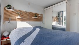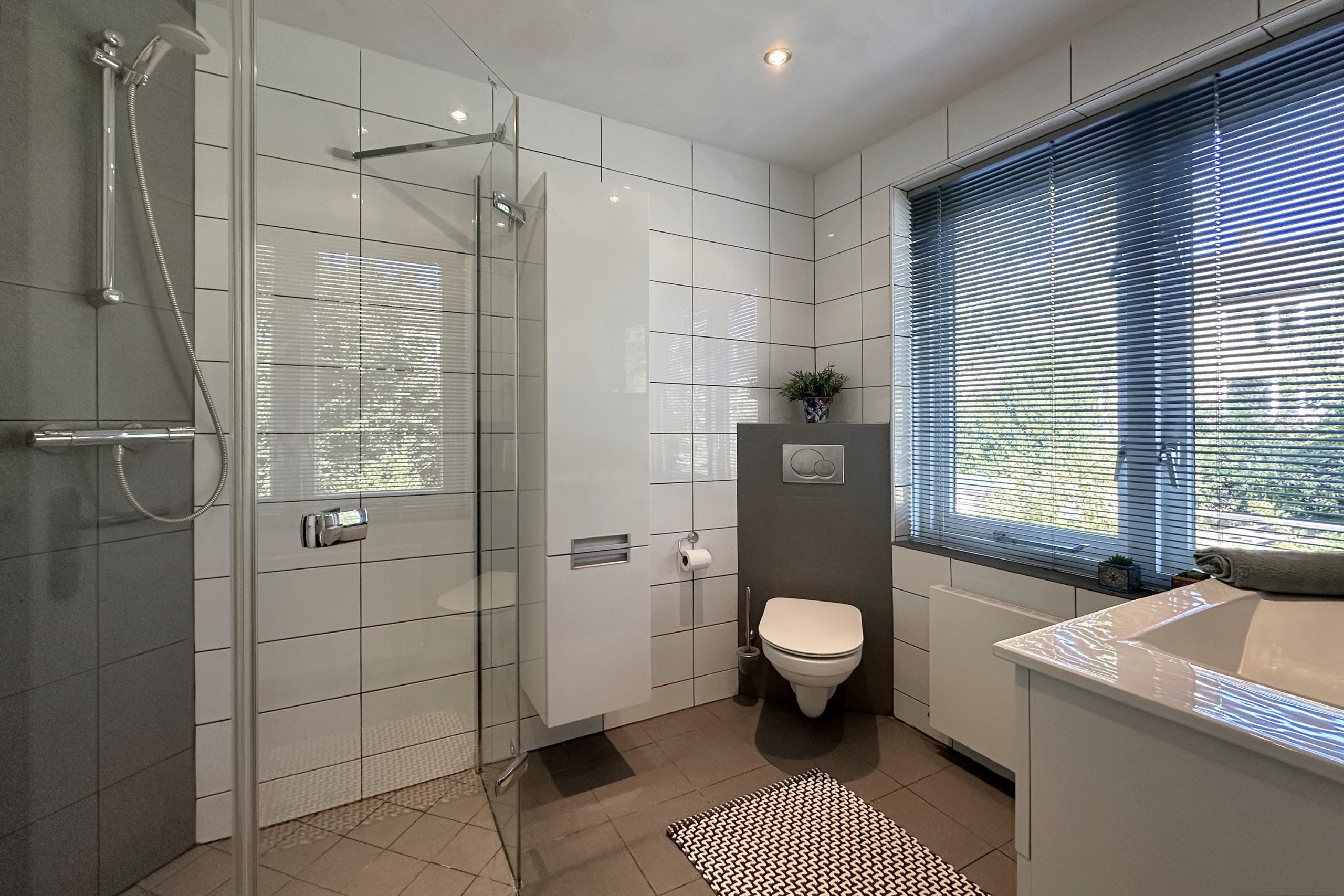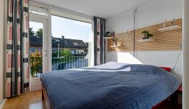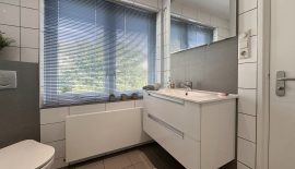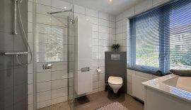 Overloop met daglicht, 2 grote slaapkamers met vaste kasten aan de voorzijde, waarvan 1 met balkon. De 3e slaapkamer ligt aan de zijkant en is ook voorzien van 2 gevelramen en schuifkasten. De moderne badkamer is geplaatst in 2012 en uitgevoerd met een inloopdouche, hangend toilet en wastafelmeubel.