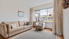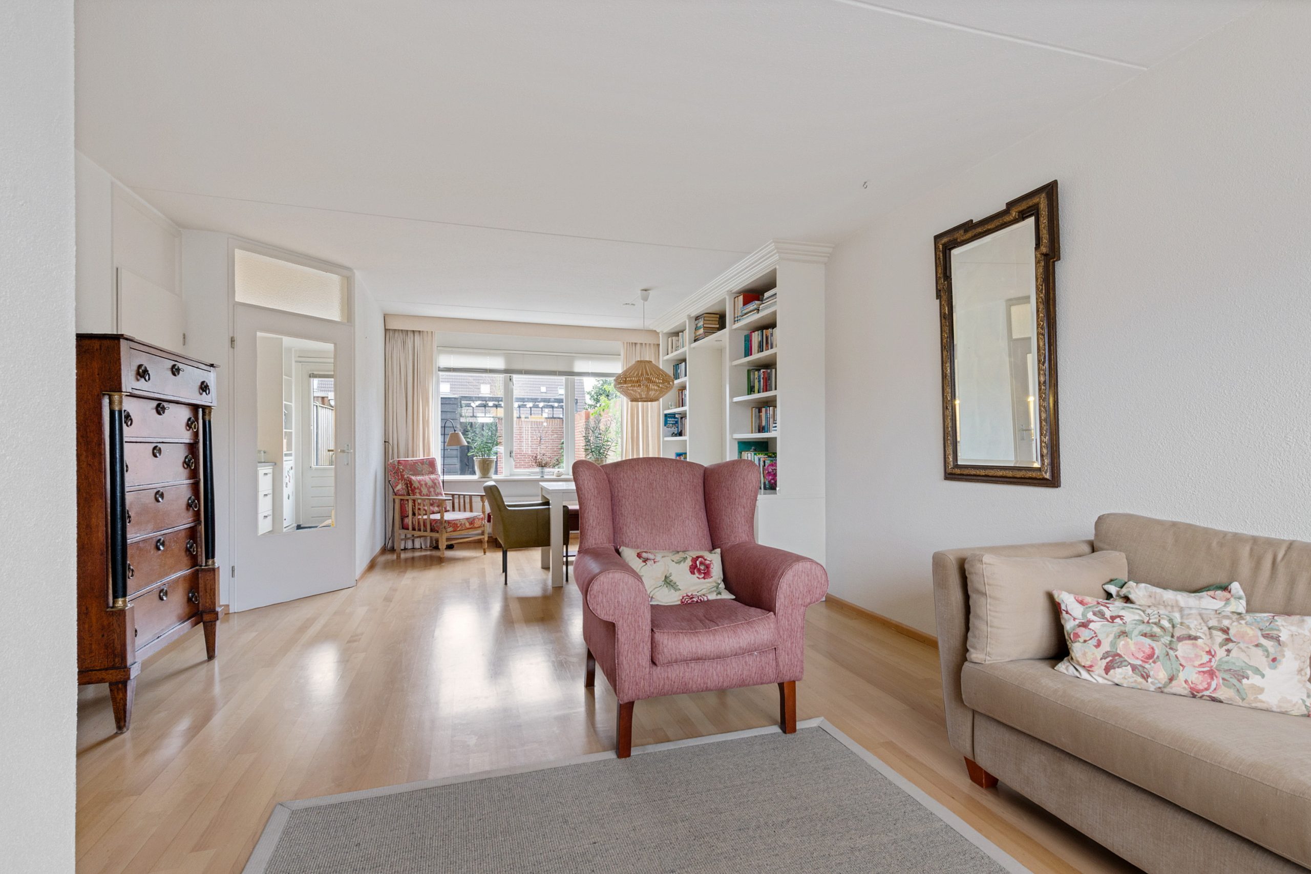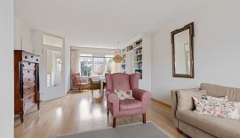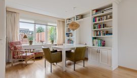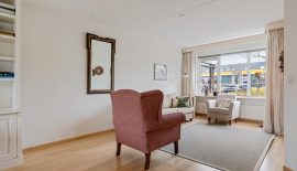Entree, hal, toiletruimte met fonteintje en gevelraampje, meterkast. Royale zonnige woonkamer van 31 m2 met beuken parketvloer en een ruime zithoek met erker op de ochtendzon van waaruit je geniet van de fraai aangelegde voortuin en het groen. Halverwege de kamer bevindt zich een trapkast, aan de tuinzijde is een eethoek geplaatst in combinatie met een vaste wandkast. Door de grote raampartij heb je goed zicht op de nieuw aangelegde achtertuin, waar zomers steeds afwisselend weer andere bomen en planten bloeien en doorlopend kleur geven aan de tuin.