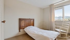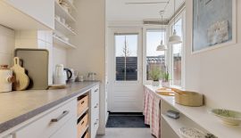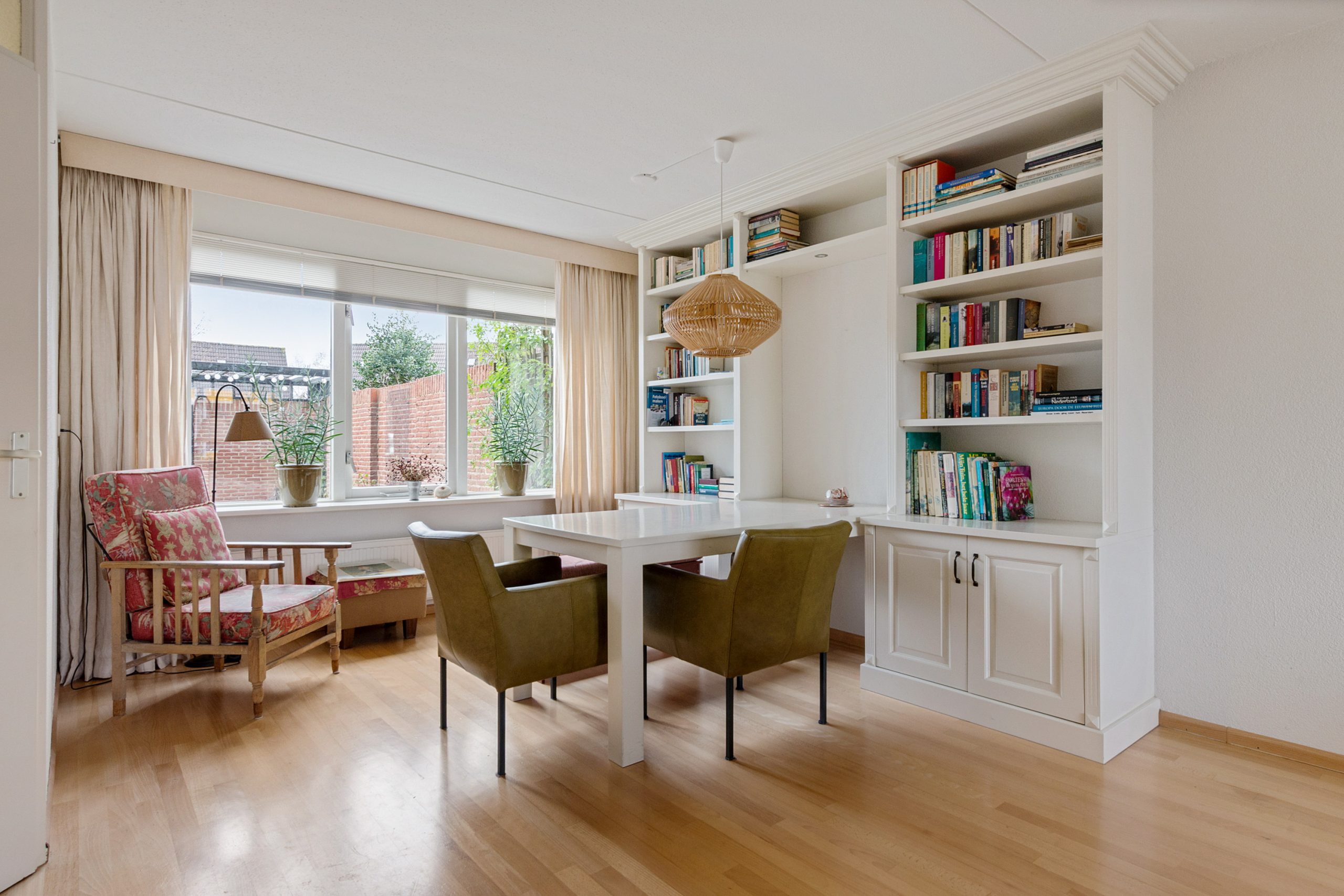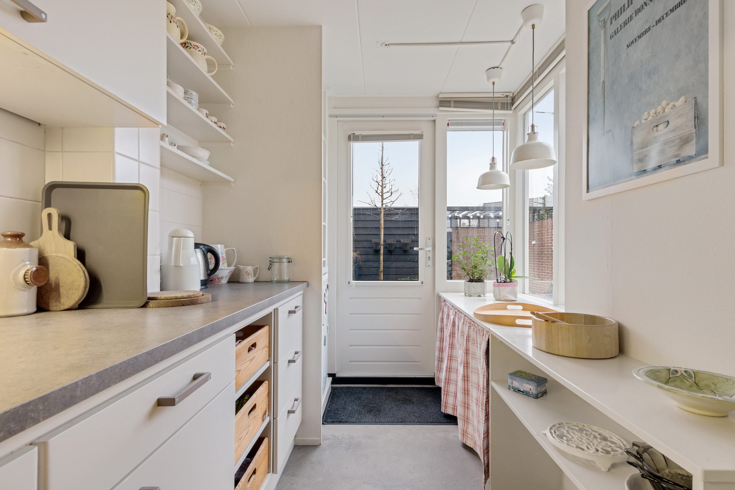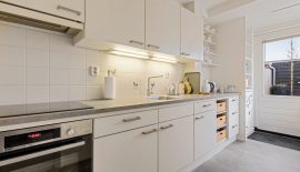 De dichte keuken is extra ruim door de gezellige aanbouw aan de tuinzijde met een groot hoekraam. Het aanrechtblad is enige jaren terug vernieuwd en voorzien van een nieuwe inductiekookplaat. Daarnaast is er een afzuigkap, een oven en een losse koelkast aanwezig. Een prima keuken waarmee je als het nodig is even vooruit kan.