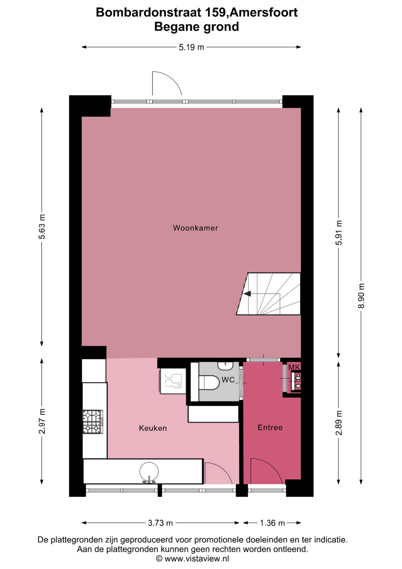 Entree / hal voorzien van meterkast en een hangend toilet met fonteintje. Binnen is het licht en ruim. Zonnige tuingerichte woonkamer met vide en trapopgang is verrassend ruim te noemen en bestaat uit een gezellig zitgedeelte en een eethoek. Een brede glaspui met tuindeur geeft toegang naar het zonneterras; vanuit de achtertuin heb je vrij uitzicht op het achterliggende grasveld. Aan de voorzijde is de half open hoekkeuken gelegen met zowel een extra buitendeur als inbouwapparatuur: koel/vrieskast, 4-pits gaskookplaat, afzuigkap en oven (defect). De gehele begane grond is voorzien van een lichte plavuizen vloer.