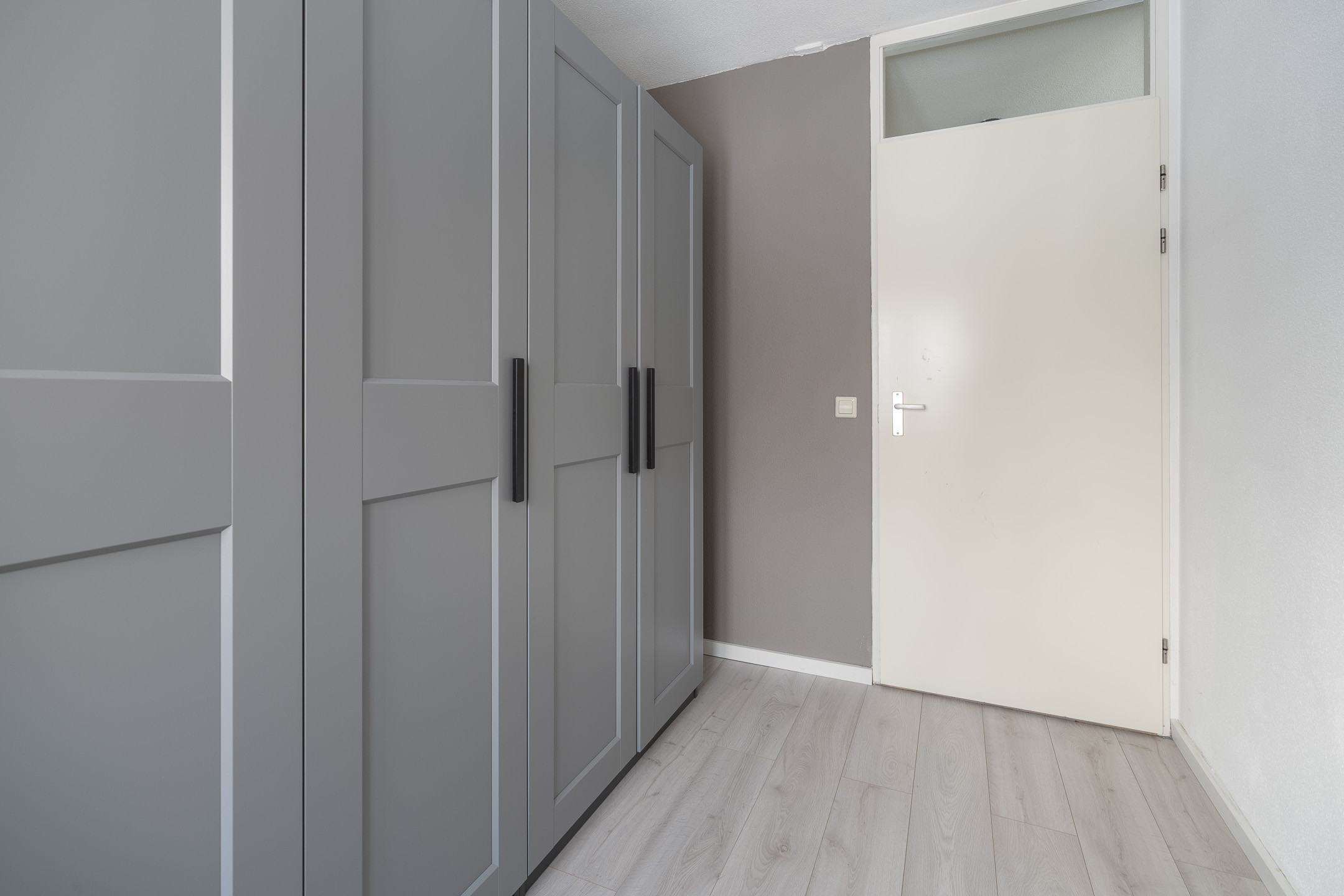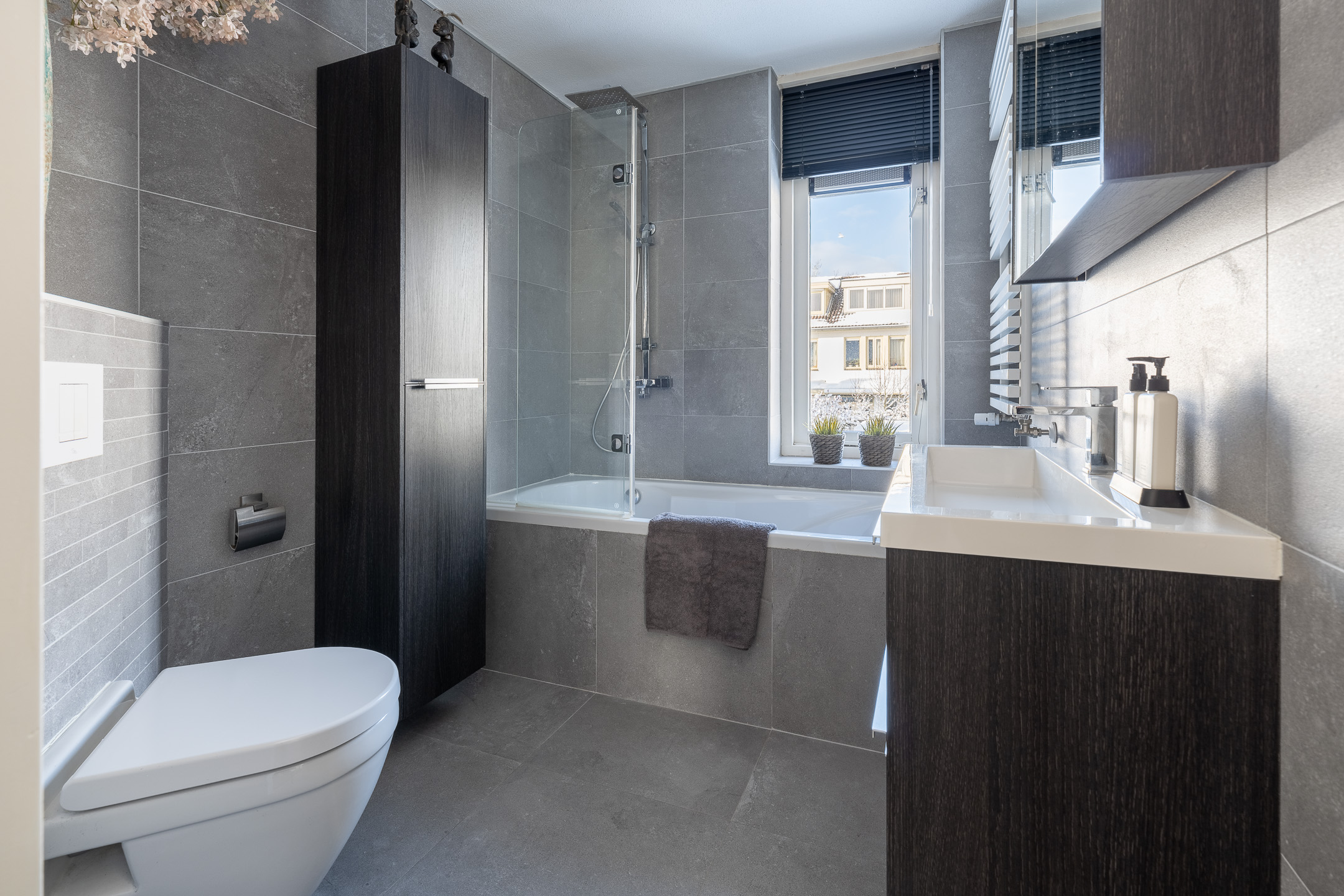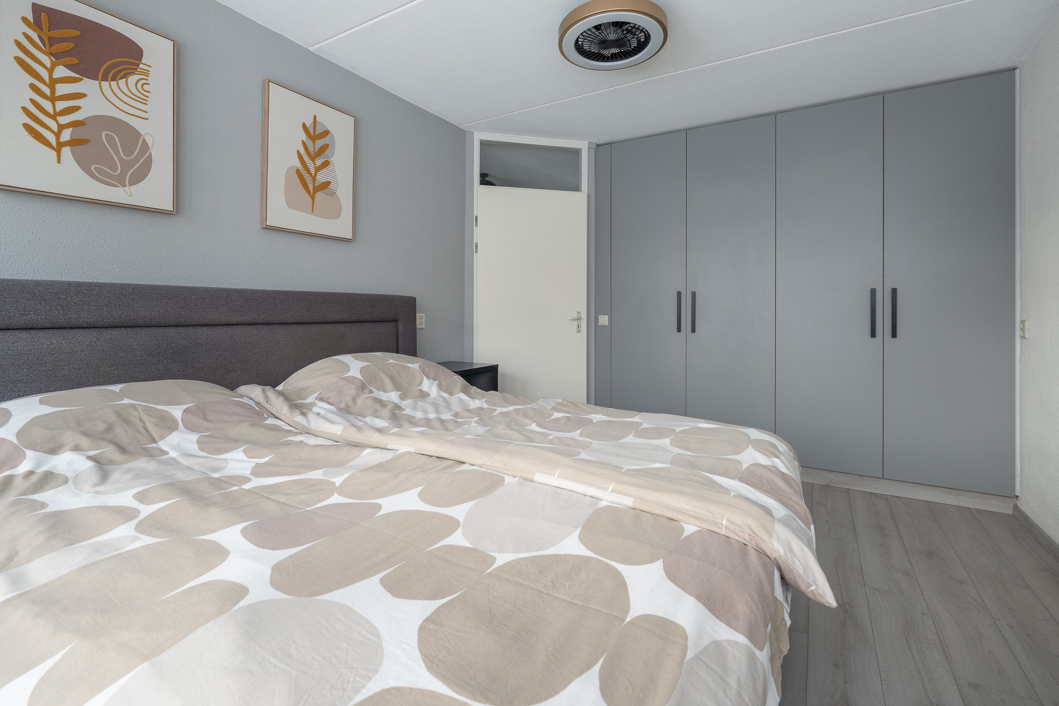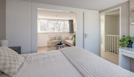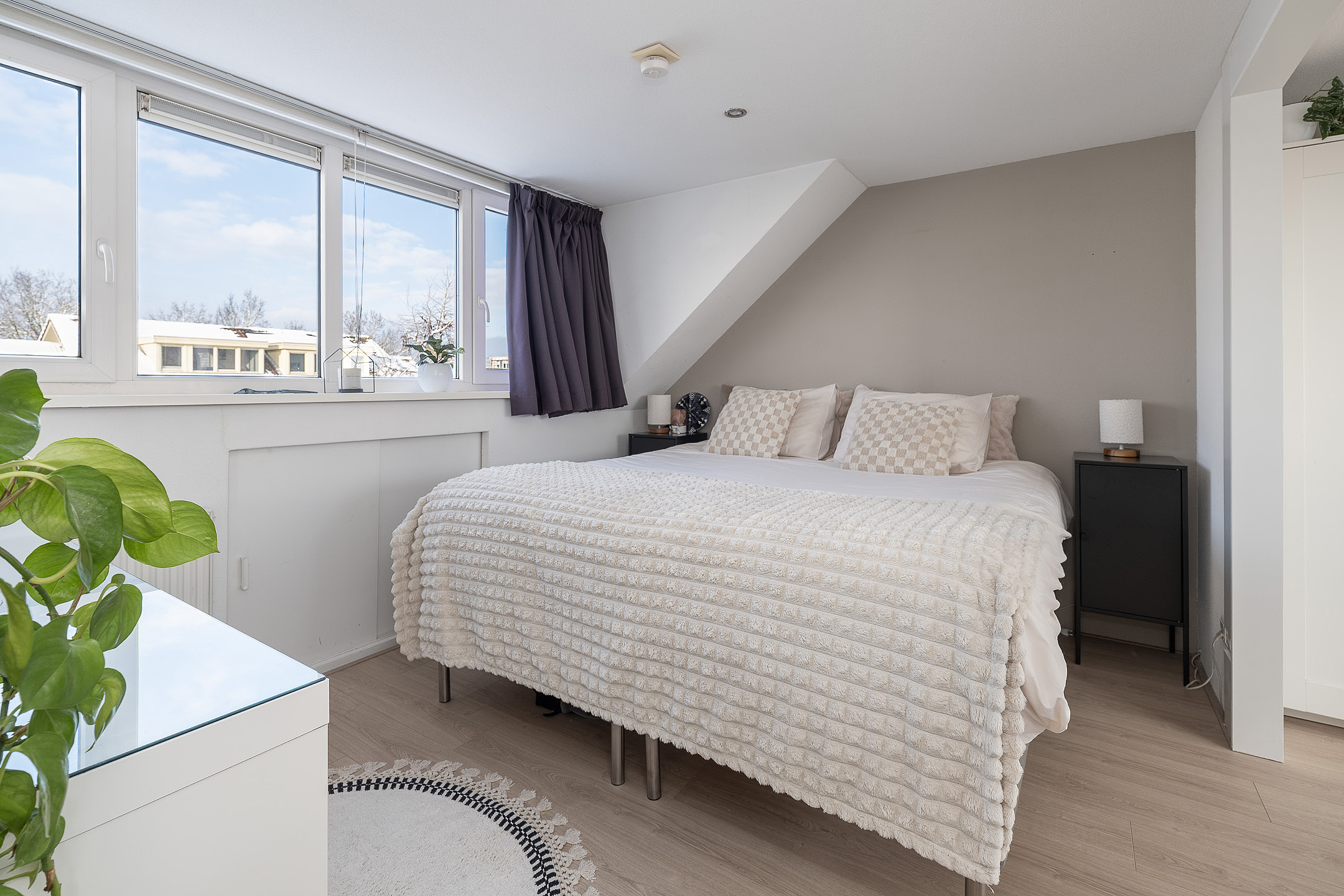 Overloop, 2 grote slaapkamers, waarvan 1 met op maat gemaakte 4-deurs kast en openslaande deuren naar het dakterras op het zuid-oosten. Vanaf hier kijk je prachtig uit over het mooie groene speelveld. De derde slaapkamer ligt aan de achterzijde. Alle kamers zijn voorzien van laminaatvloeren uit 2023! Luxe badkamer (2018) met ligbad, stortdouche, hangend toilet, wastafelmeubel, designradiator en een gevelraam.