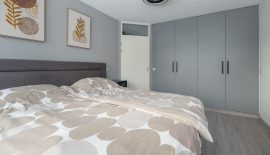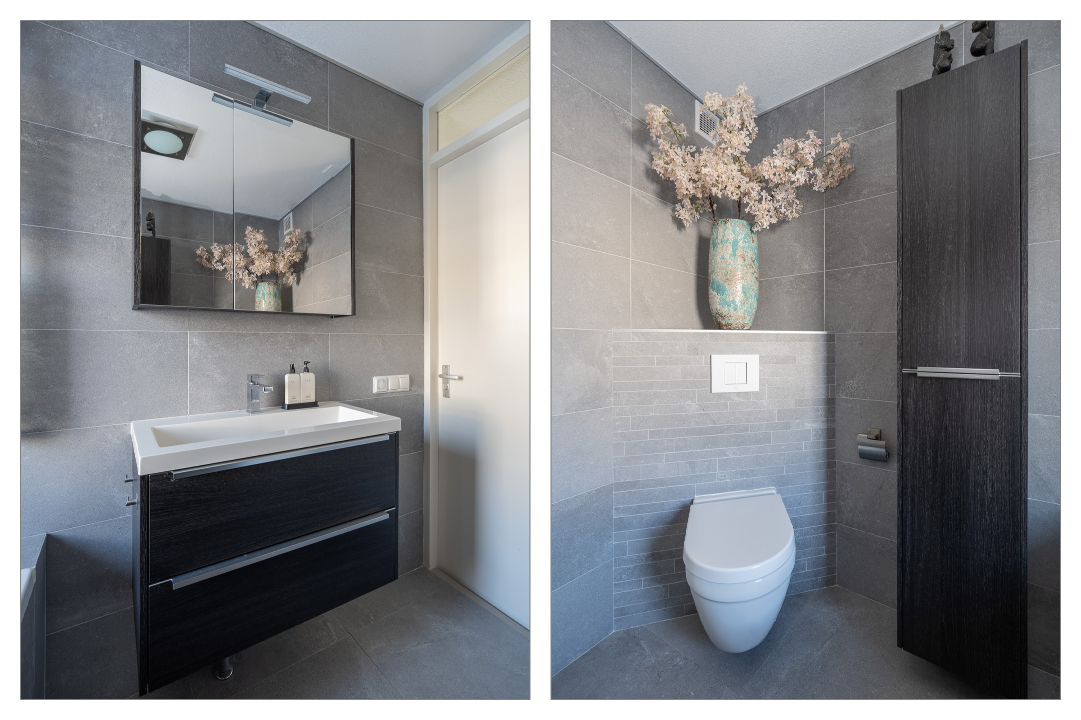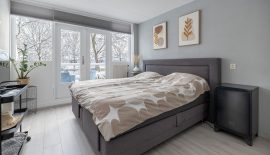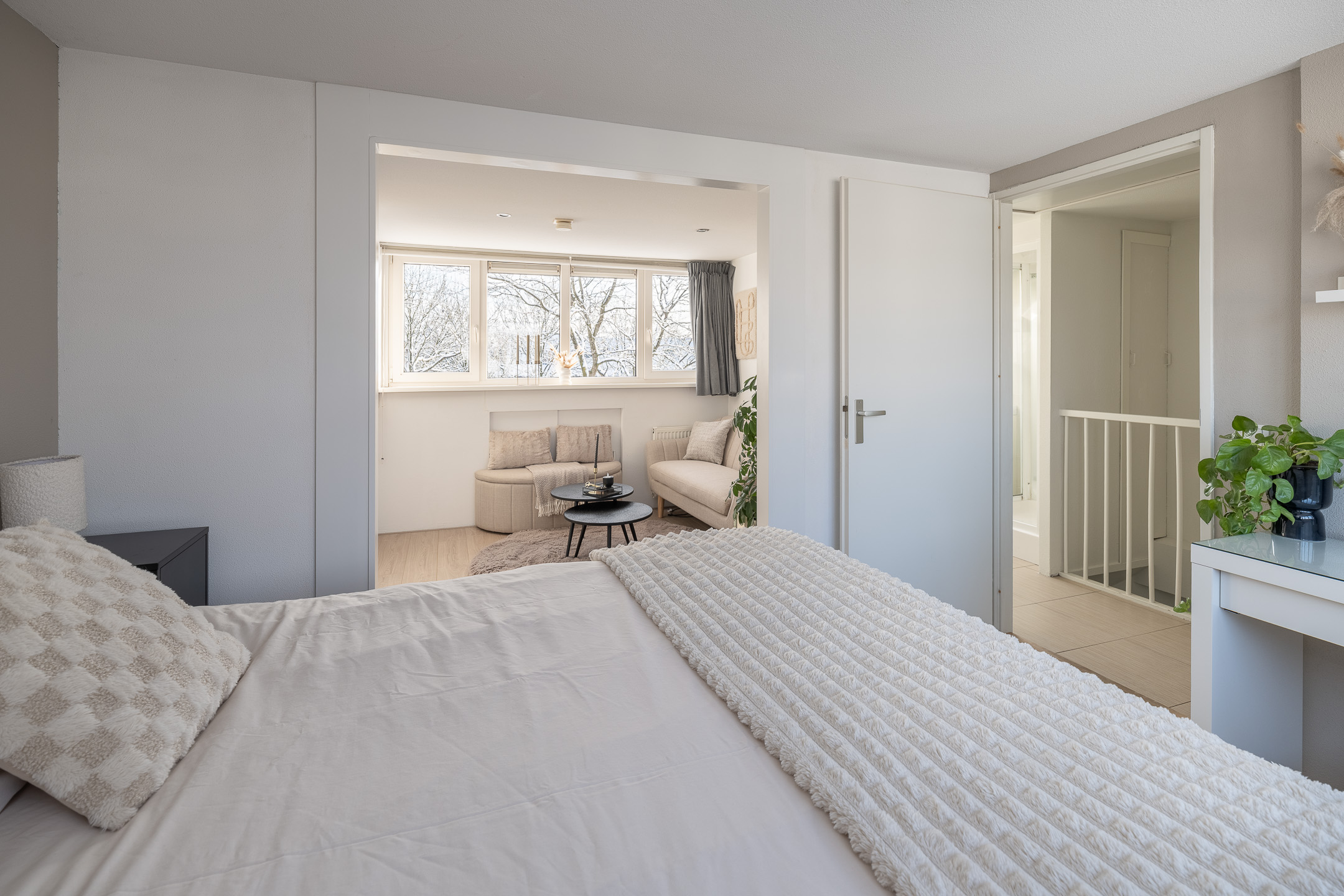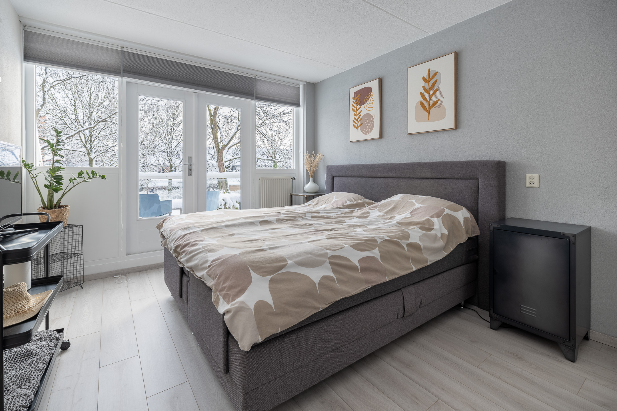 Overloop, 2 grote slaapkamers, waarvan 1 met op maat gemaakte 4-deurs kast en openslaande deuren naar het dakterras op het zuid-oosten. Vanaf hier kijk je prachtig uit over het mooie groene speelveld. De derde slaapkamer ligt aan de achterzijde. Alle kamers zijn voorzien van laminaatvloeren uit 2023! Luxe badkamer (2018) met ligbad, stortdouche, hangend toilet, wastafelmeubel, designradiator en een gevelraam.
