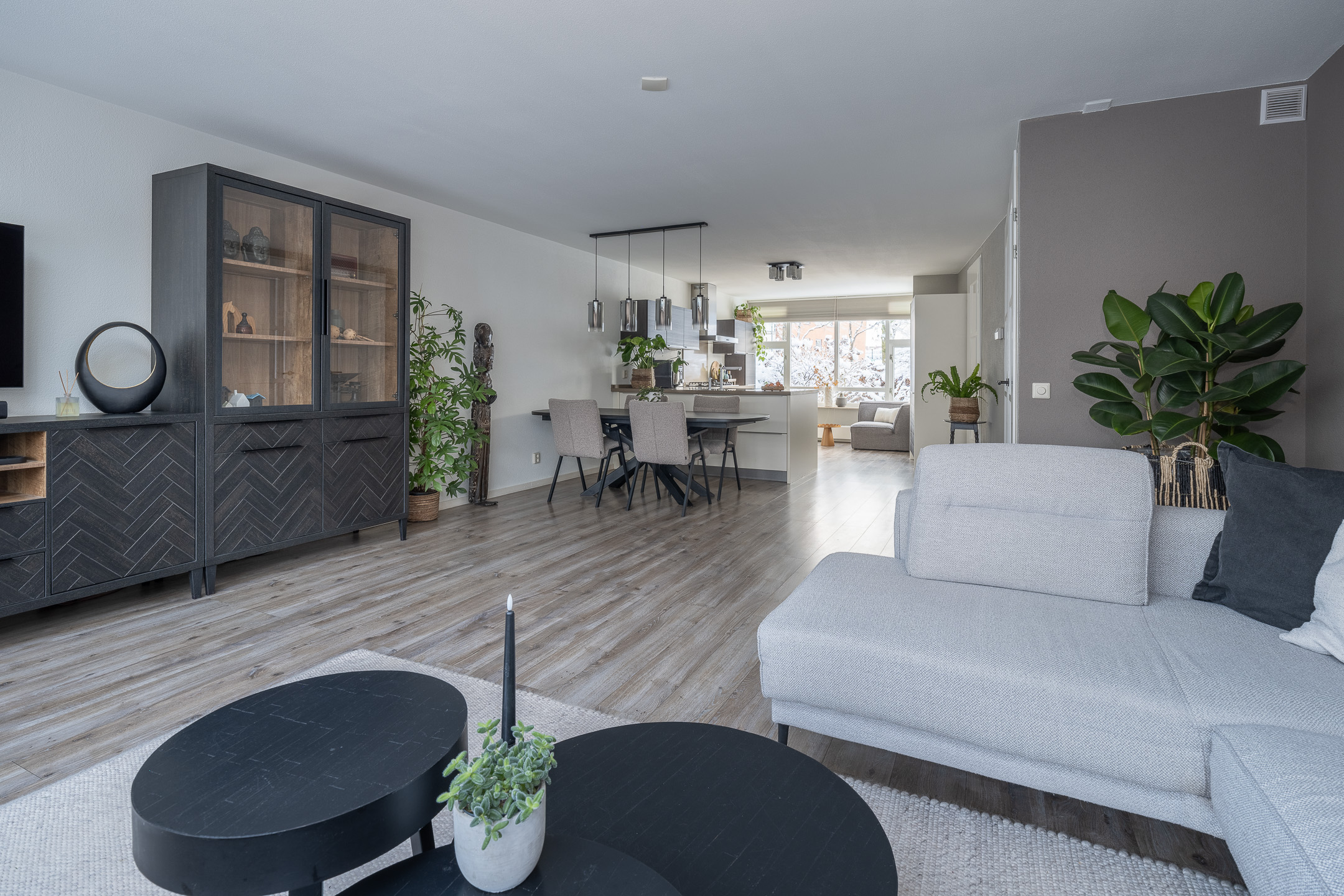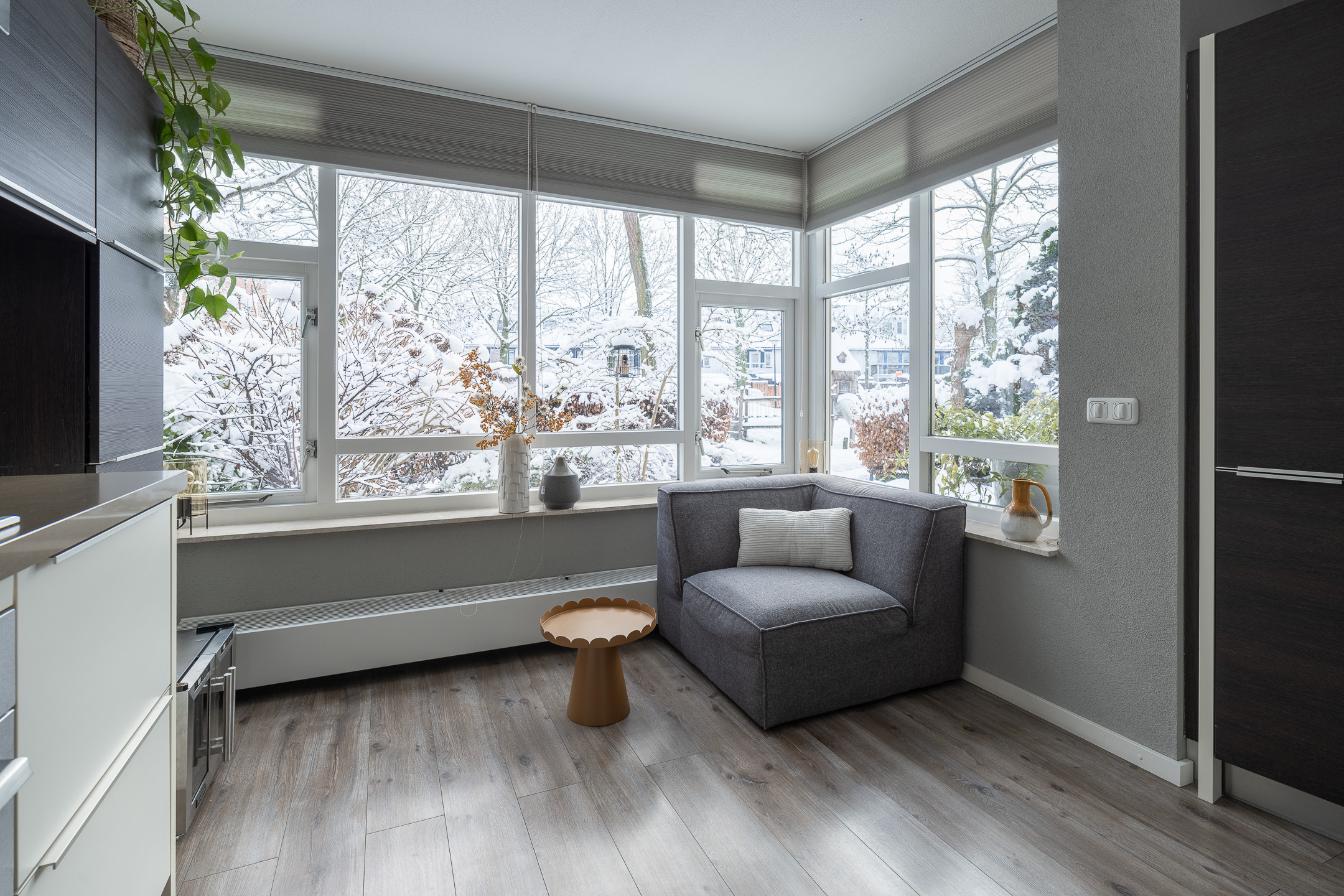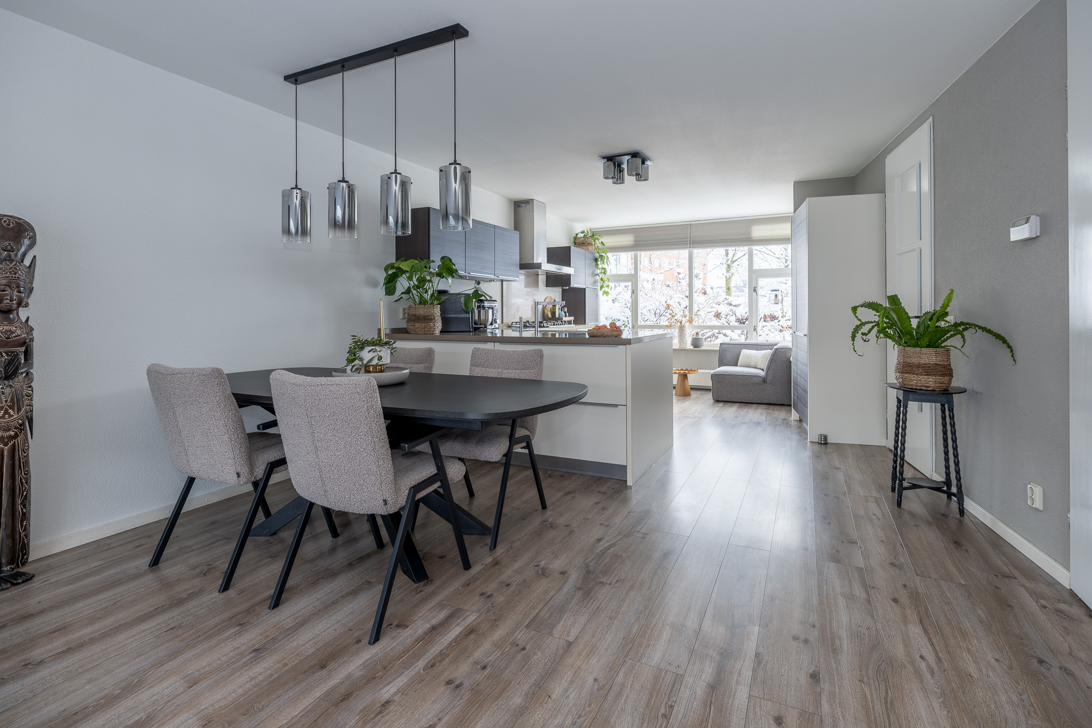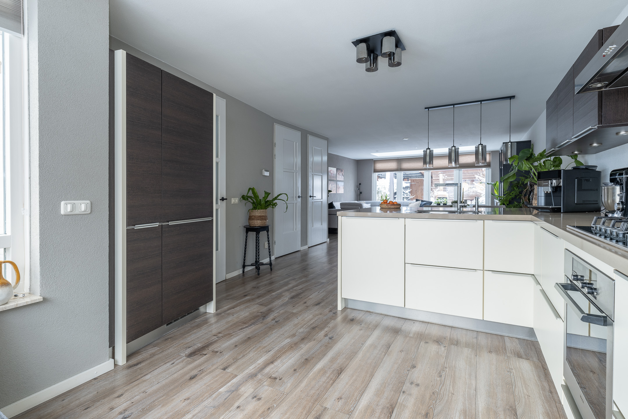 Entree, hal met uitgebreide meterkast en luxe hangend toilet. Riante living (met ankerloze woningscheidende spouwmuren), bestaande uit een fraaie zithoek in de uitgebouwde woonkamer (2011) met lichtstraat, trapkast en een tuindeur naar het zonneterras. Aan de voorzijde bevindt zich een riante open hoekkeuken (2011) met schiereiland, veel kastruimte, complete inbouwapparatuur (o.a. een grote koelkast) en een apothekerskast. Dankzij de aangebouwde serre is de keuken heerlijk ruim en zonnig en biedt de mogelijkheid voor een extra zitje of een ontbijttafel. De begane grond is voorzien van nieuwe binnendeuren, een nieuwe tuindeur en een laminaatvloer.