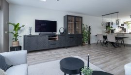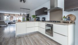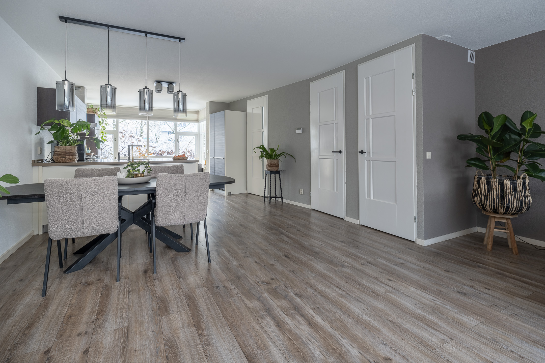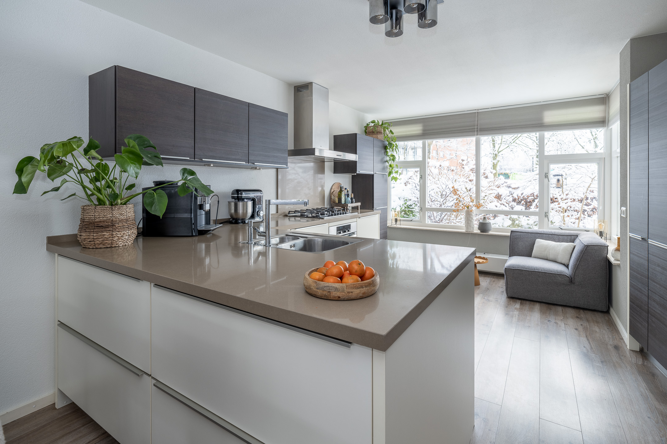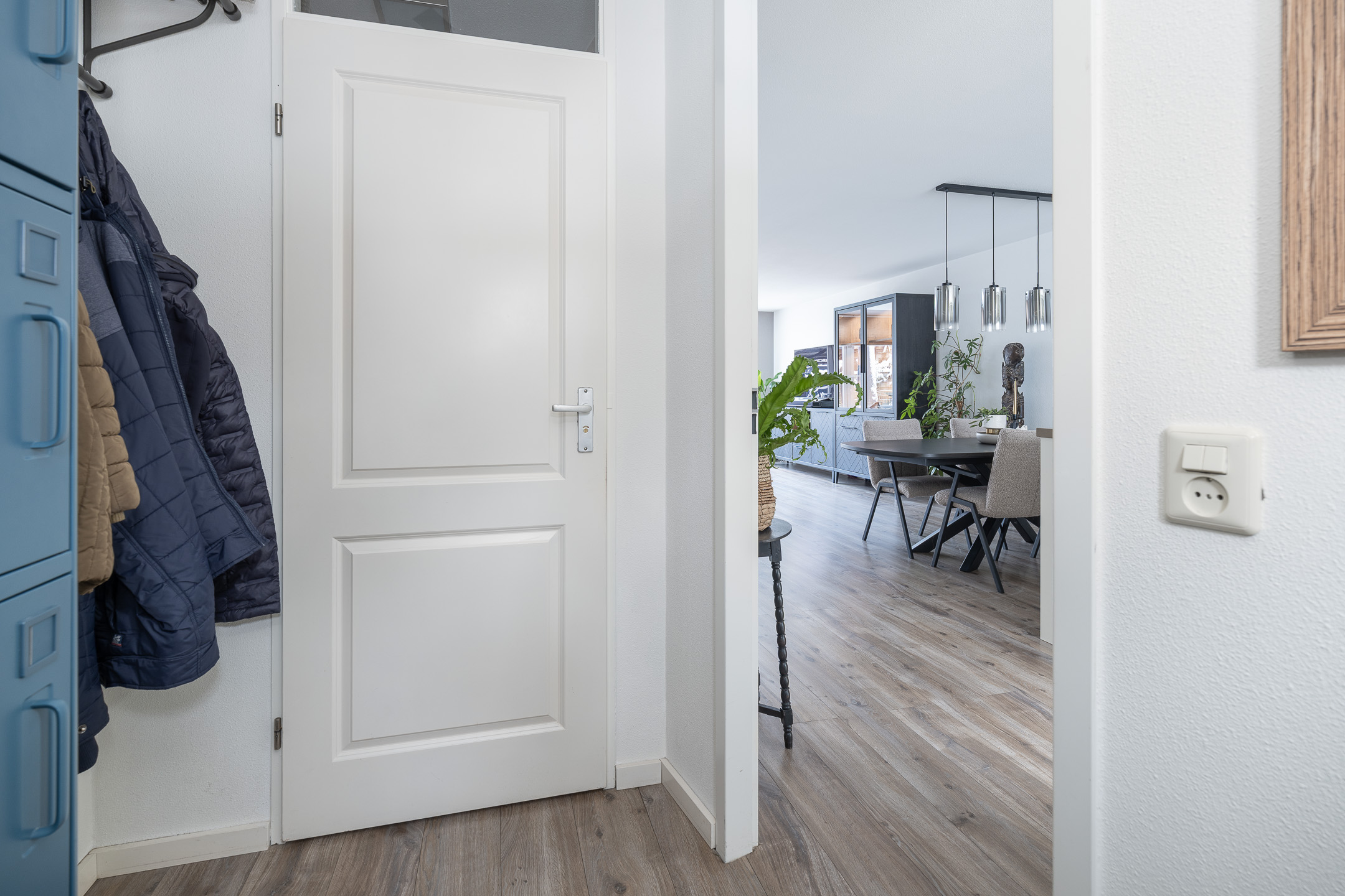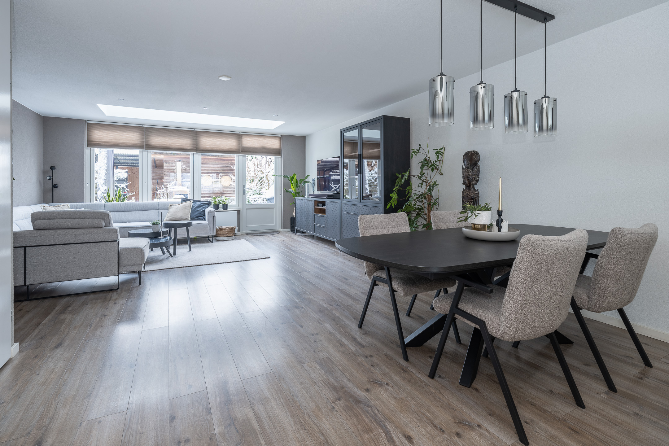 Entree, hal met uitgebreide meterkast en luxe hangend toilet. Riante living (met ankerloze woningscheidende spouwmuren), bestaande uit een fraaie zithoek in de uitgebouwde woonkamer (2011) met lichtstraat, trapkast en een tuindeur naar het zonneterras. Aan de voorzijde bevindt zich een riante open hoekkeuken (2011) met schiereiland, veel kastruimte, complete inbouwapparatuur (o.a. een grote koelkast) en een apothekerskast. Dankzij de aangebouwde serre is de keuken heerlijk ruim en zonnig en biedt de mogelijkheid voor een extra zitje of een ontbijttafel. De begane grond is voorzien van nieuwe binnendeuren, een nieuwe tuindeur en een laminaatvloer.