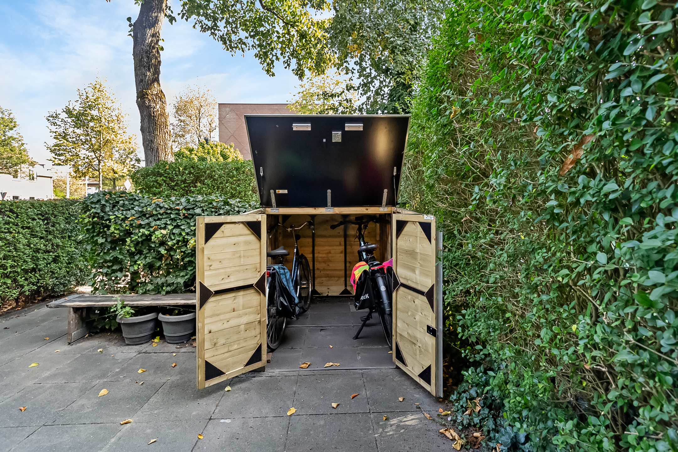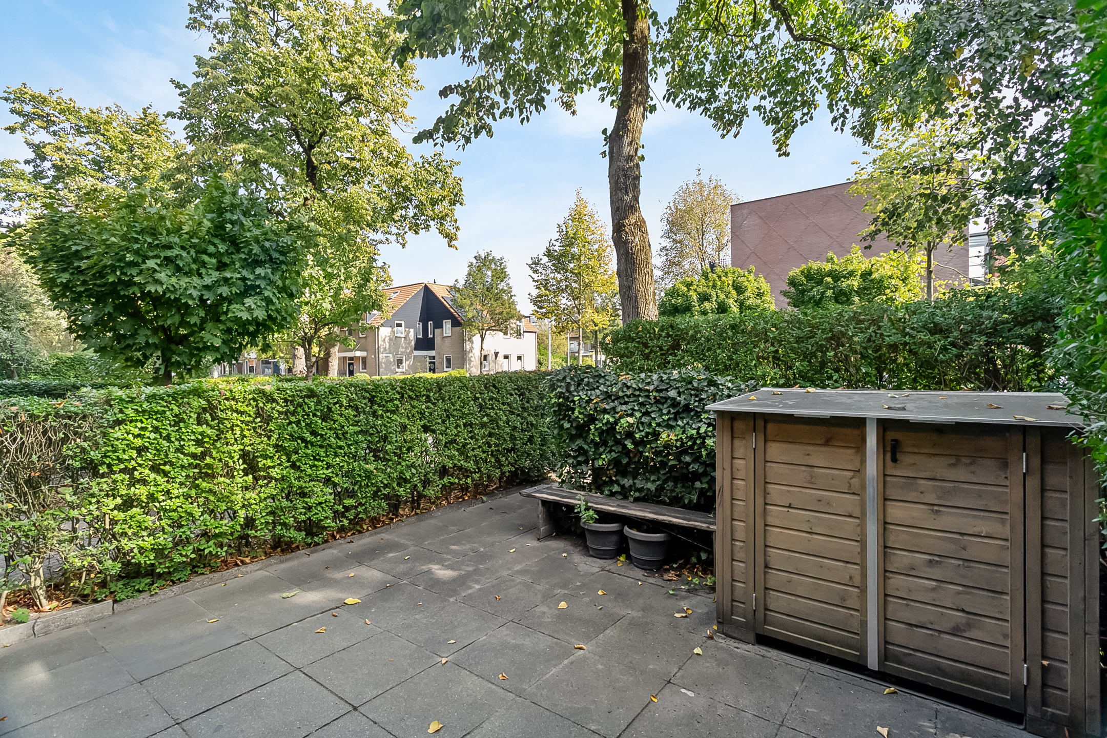 Verzorgde voortuin gelegen op het oosten met veel groen en een fietsenberging (geschikt voor 3 fietsen) voorzien van elektra en verlichting. In de voortuin kun je de dag heerlijk starten op je bankje in de ochtendzon.