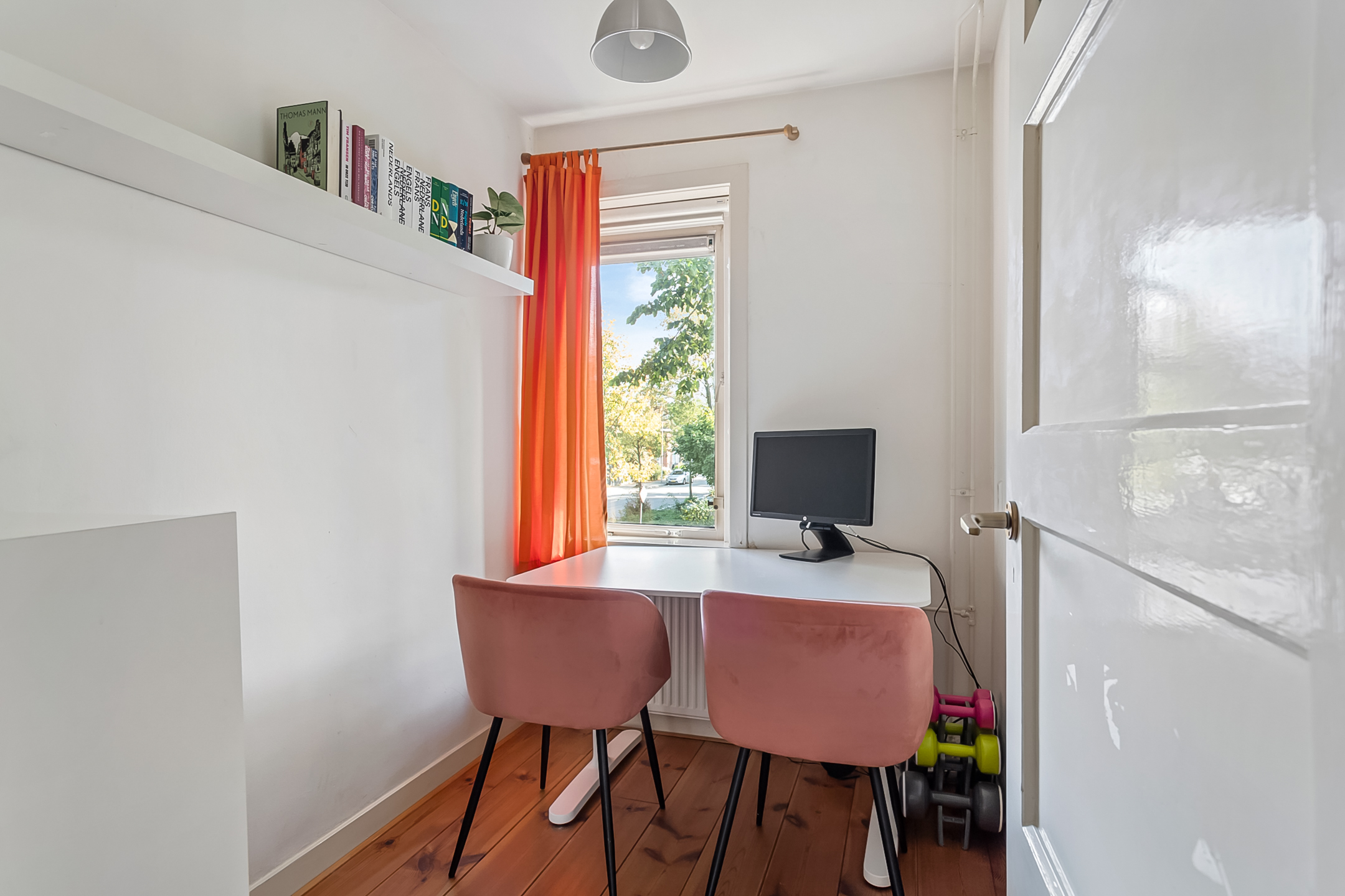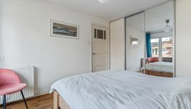 Overloop met trapopgang naar de zolderverdieping. Originele paneeldeuren. Nette toiletruimte. Nette badkamer met inloopdouche, wastafel en handdoekradiator. Ruime slaapkamer aan de achterzijde met vaste kastenwand en openslaande deuren naar het balkon over de gehele breedte van de woning. Ruime slaapkamer aan de voorzijde. Zijkamer in gebruik als werkkamer.