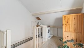 Ruime voorzolder met veel bergruimte achter knieschotten en aansluitingen voor wasmachine. Slaapkamer met dakraam en bergruimte.