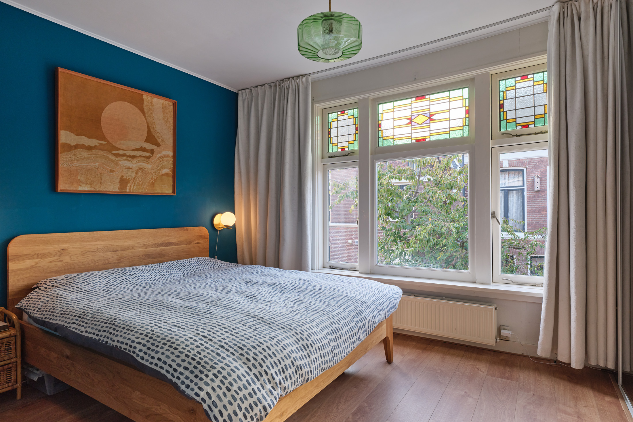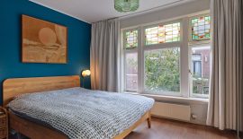 Overloop met trapkast. Royale en sfeervolle slaapkamer aan de voorzijde met glas-in-loodramen en kastenwand. Moderne badkamer met vloerverwarming, inloopdouche, wastafelmeubel en tweede toilet. Tweede slaapkamer aan de achterzijde met kast.