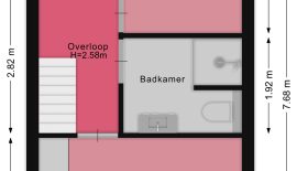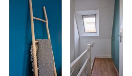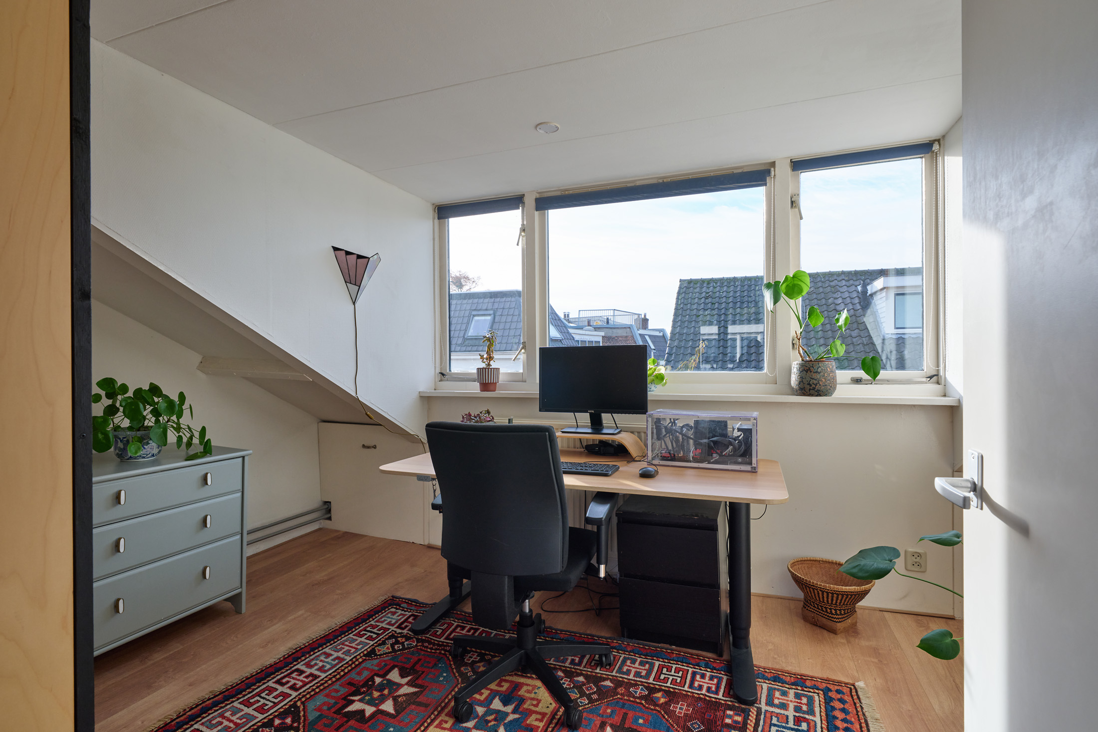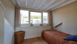 Overloop. Slaapkamer aan de achterzijde met dakkapel, bergruimte achter de knieschotten en wasmachineaansluiting. Slaap-/werkkamer aan de voorzijde met dakkapel en bergruimte achter de knieschotten.