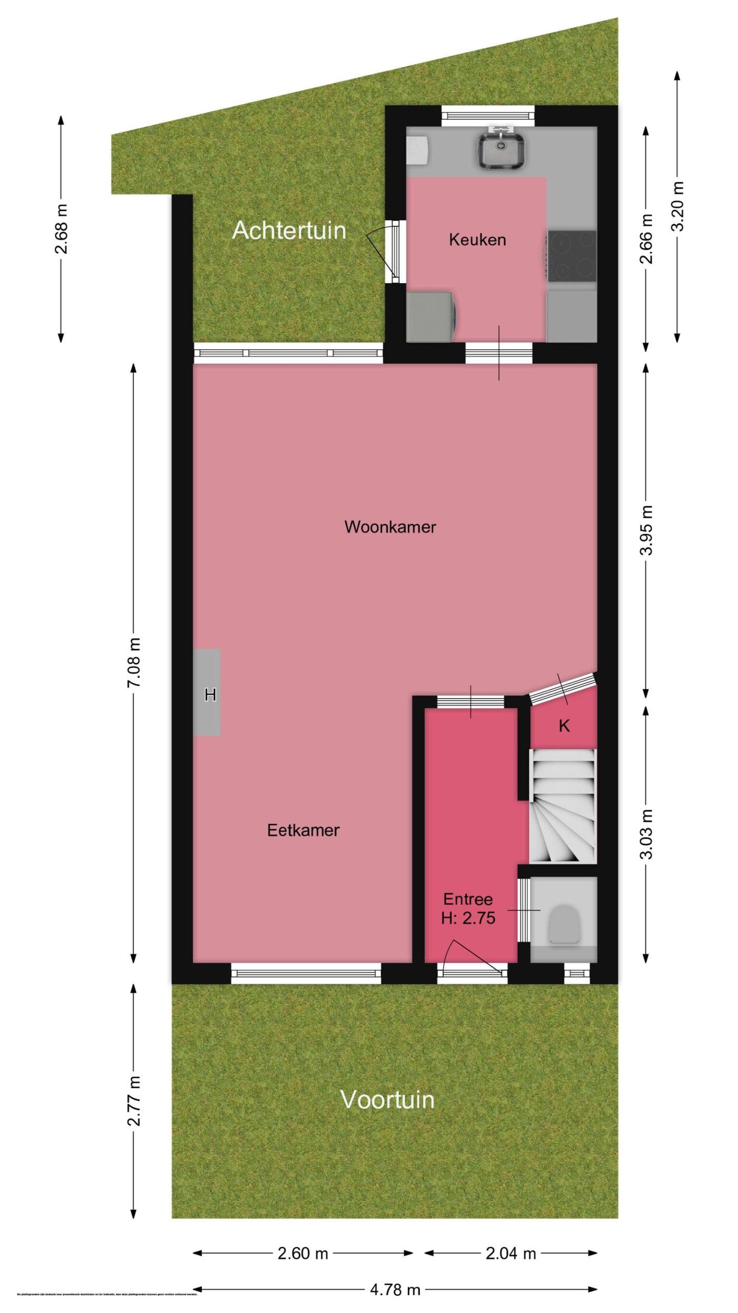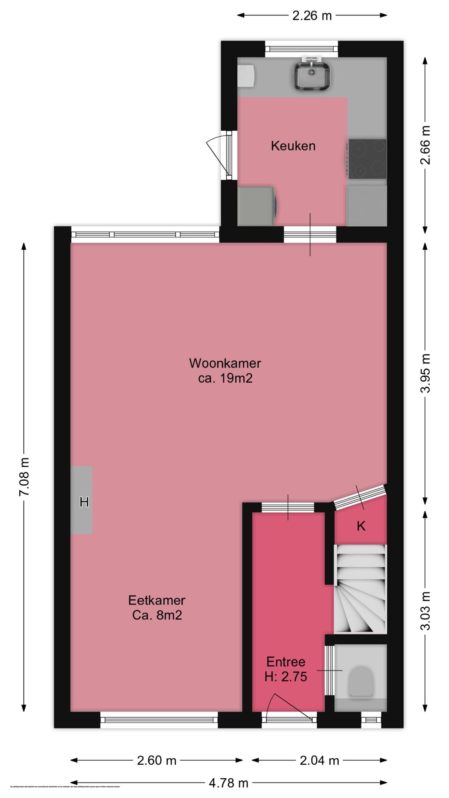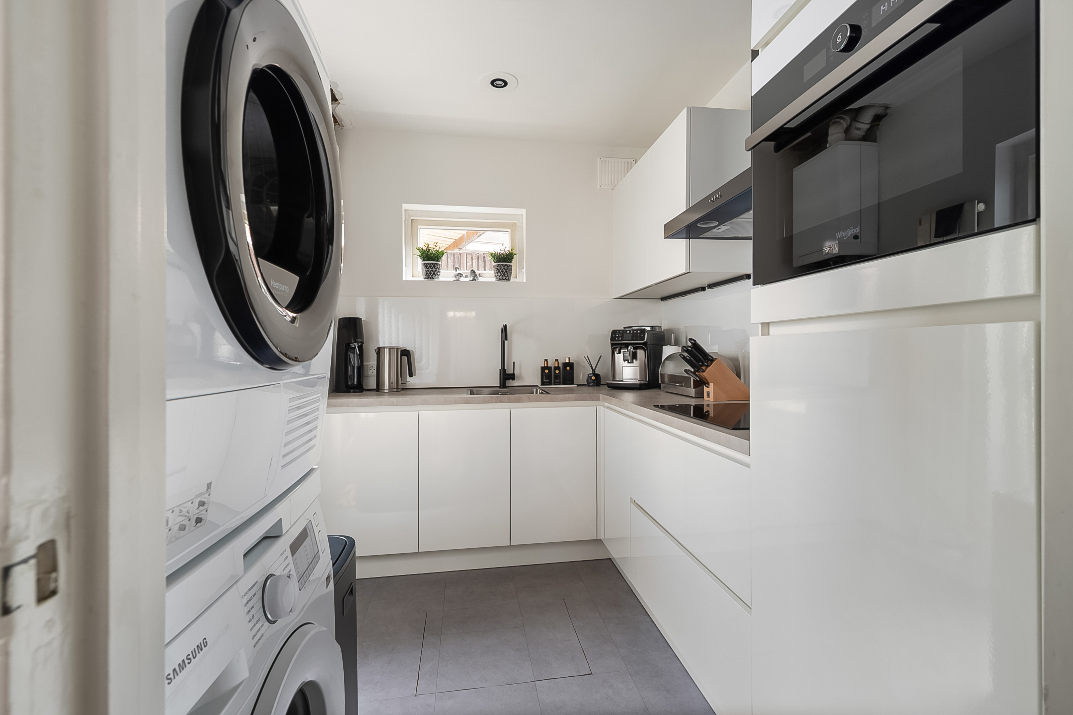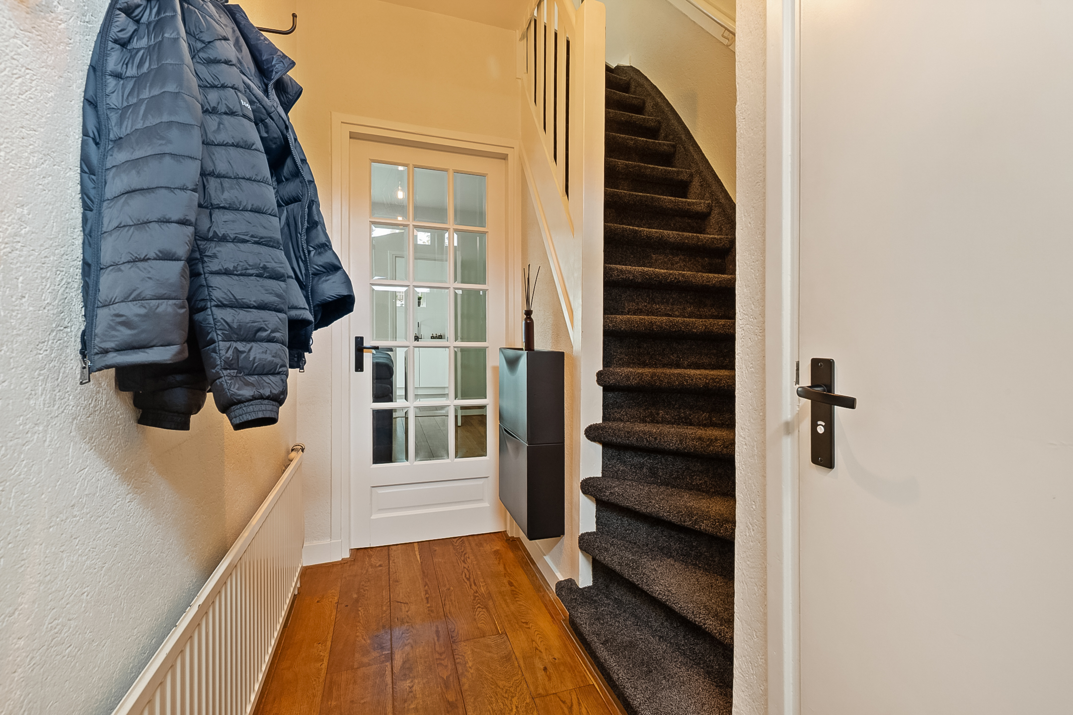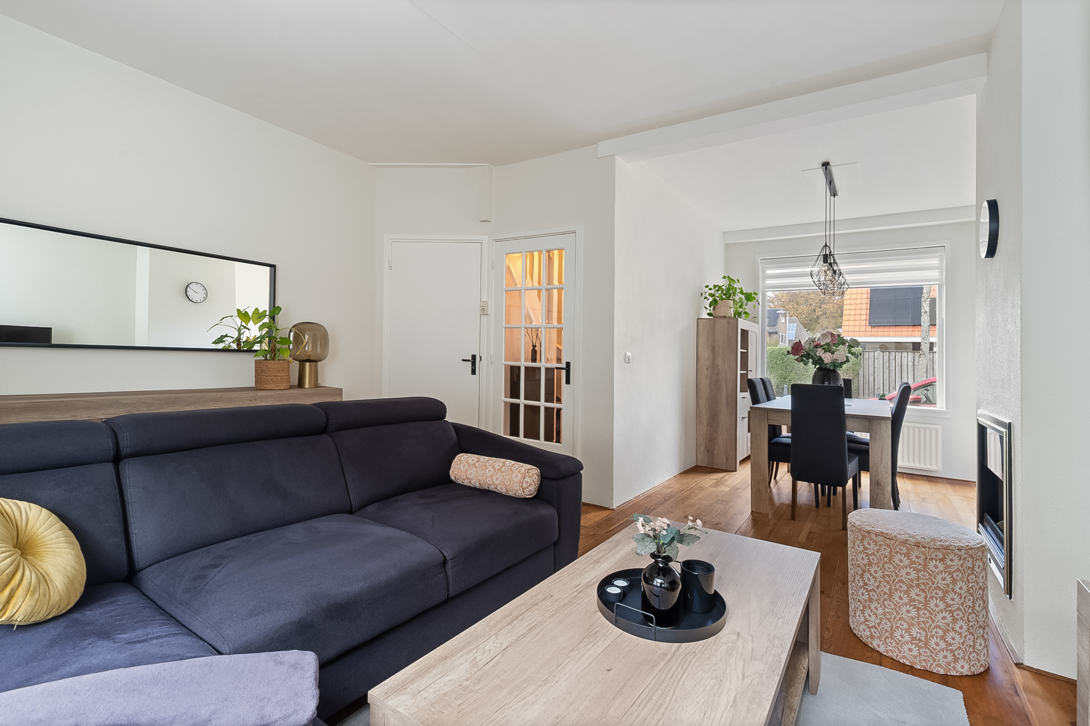 Begane grond: entree/gang, met trapopgang naar de verdieping en toegang tot het toilet, ruime en heerlijk lichte L-vormige woon-/eetkamer van ca. 27 m2 met trapkast en een sfeervolle gashaard, moderne complete keuken (2021) met inbouwapparatuur, aansluitingen voor wasapparatuur, een deur naar de achterpatio en een vloerluik naar de kelder.