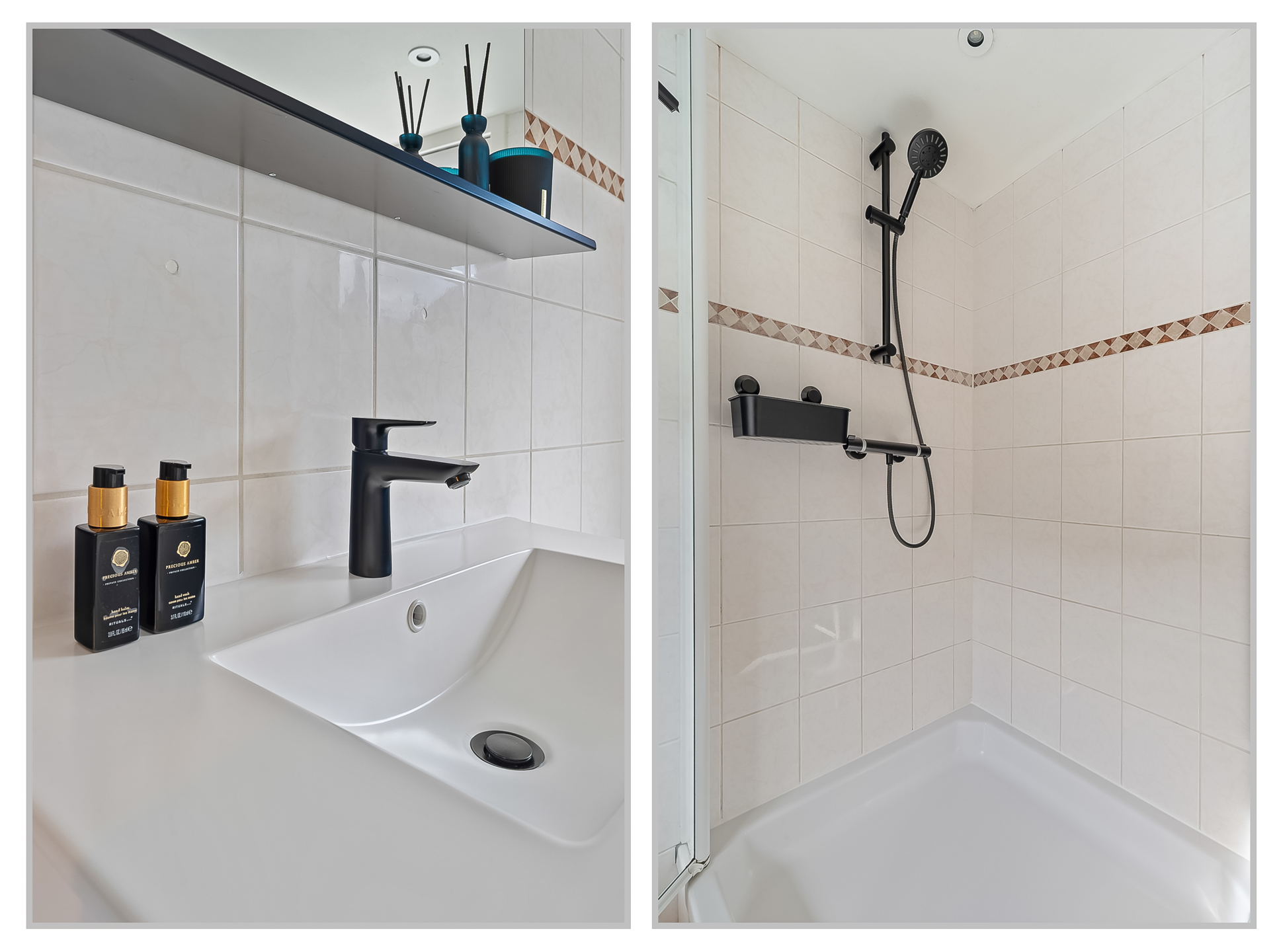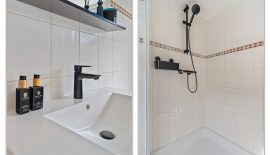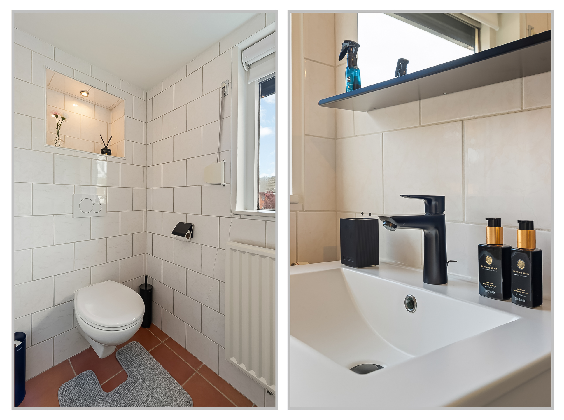 Eerste verdieping: ruime overloop, ruime hoofdslaapkamer aan de achterzijde met een vaste kast, 2e slaapkamer, een aparte toiletruimte en een nette badkamer met een ligbad, douchecabine en een wastafelmeubel.