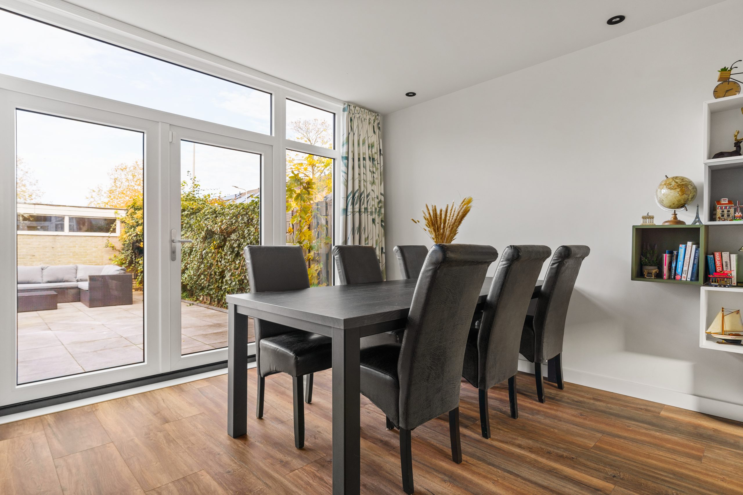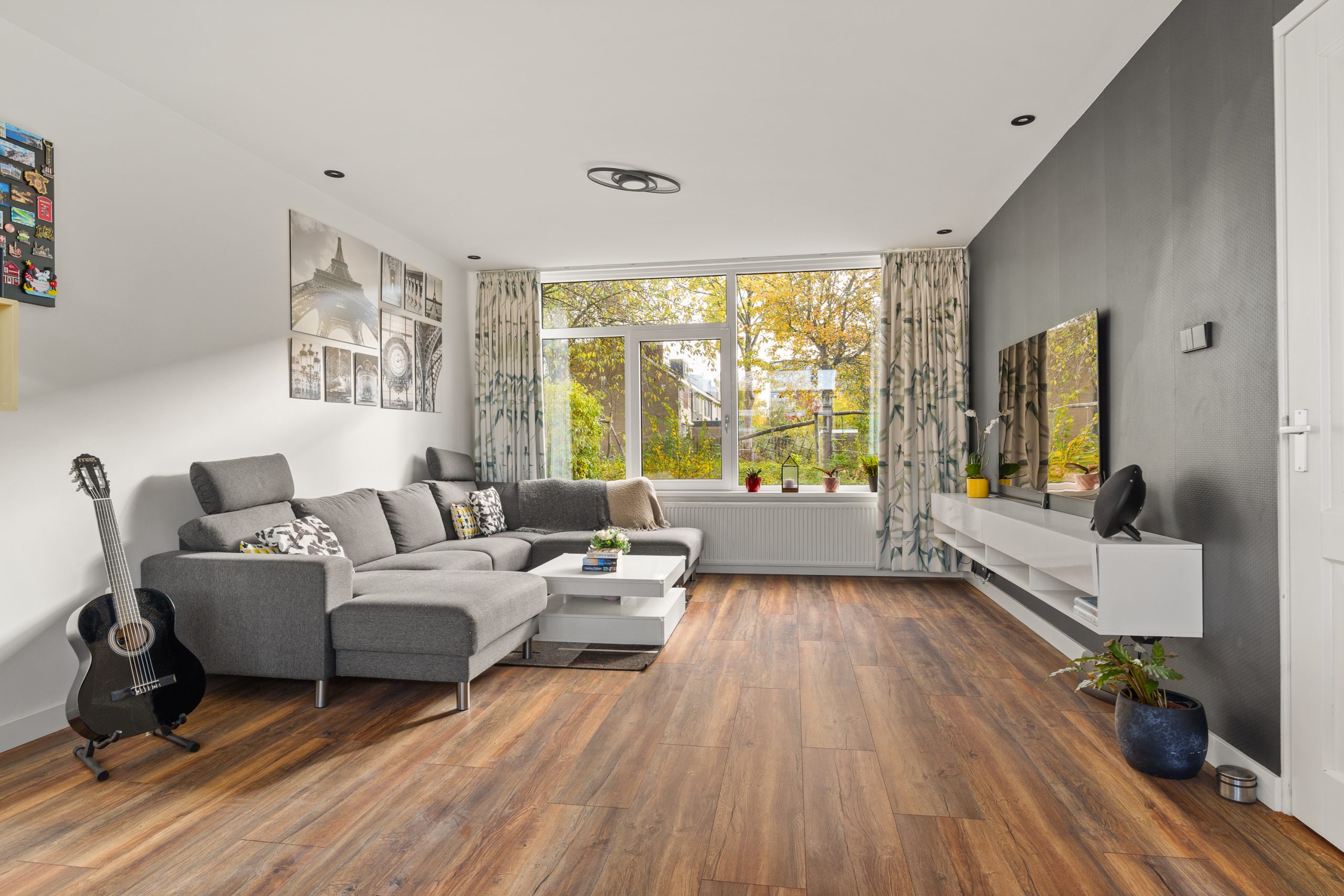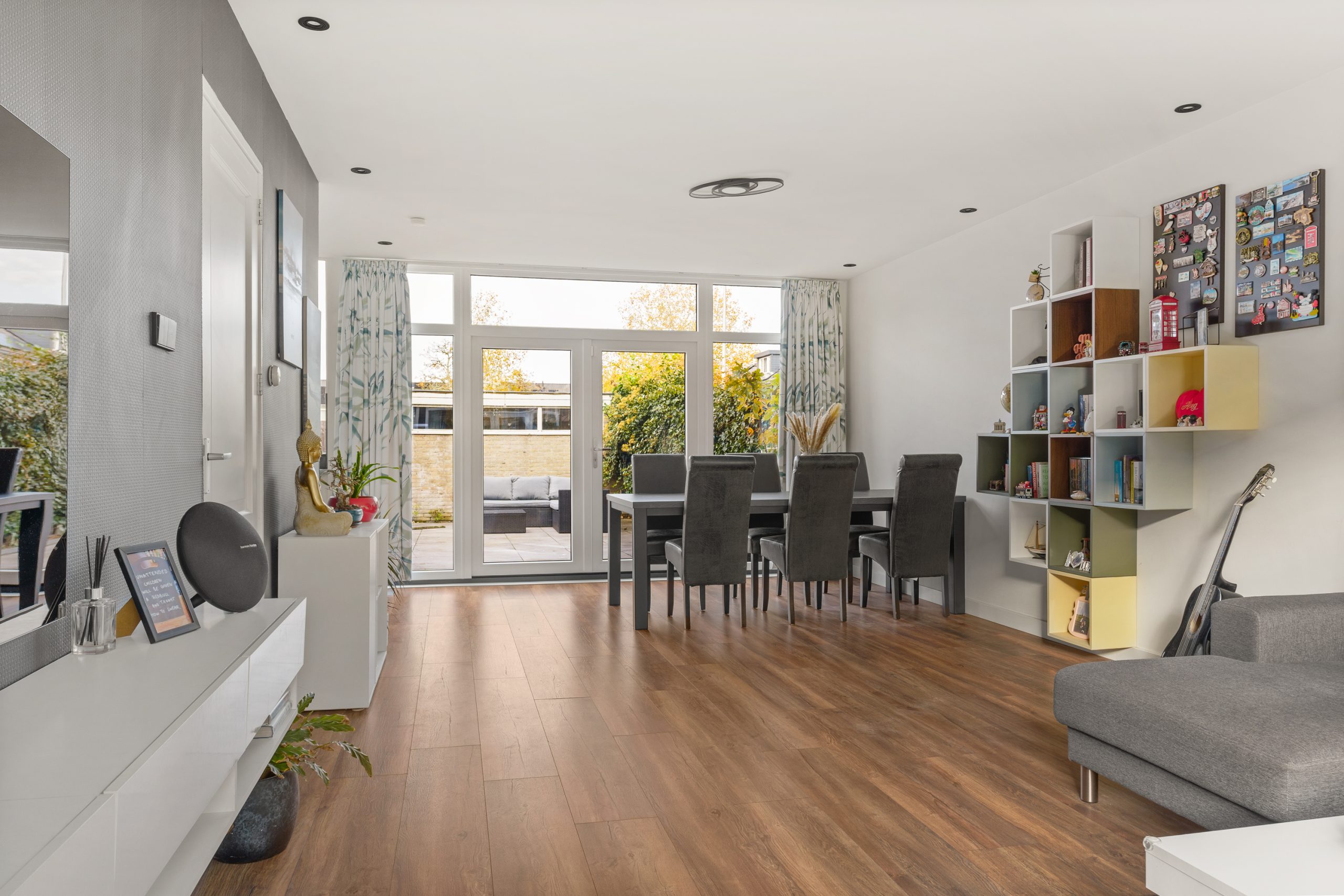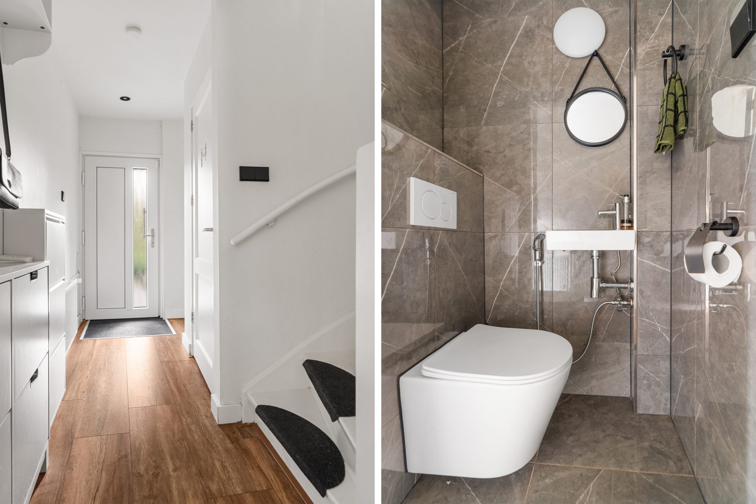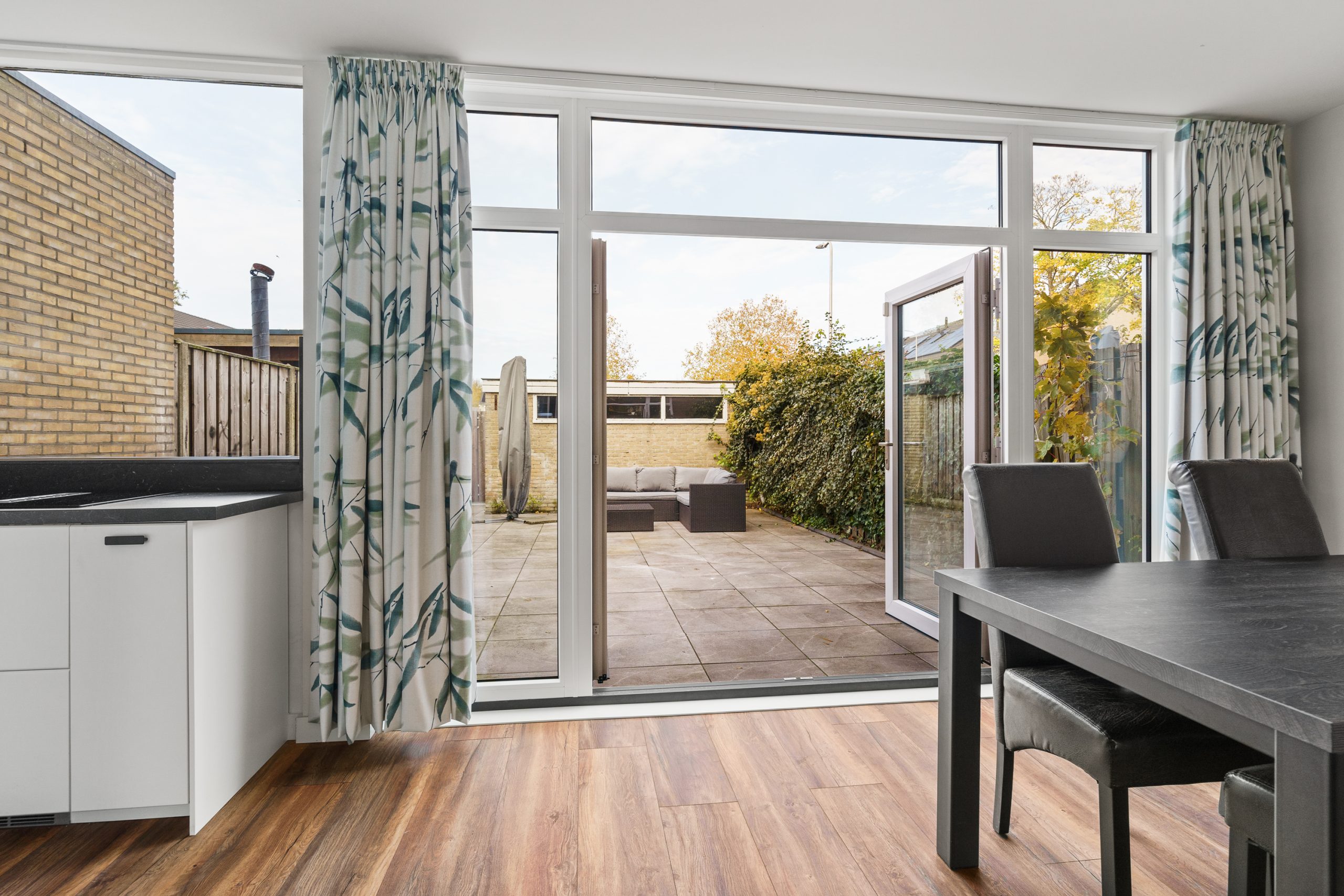 Entree met luifel, hal met 3 nieuwe binnendeuren, meterkast, trapopgang met trapkast en een luxe hangend toilet met fonteintje. De ruime doorzon-woonkamer heeft strakke stucwanden, stucplafonds en vrij uitzicht op het groen aan de voorzijde en een brede glaspui met openslaande tuindeuren naar het terras aan de achterzijde. Mensen met groene vingers zullen weinig moeite hebben om wat groen aan de tuin toe te voegen, simpel door het verwijderen van een paar tegels. Aan de tuinzijde bevindt zich ook een moderne open hoekkeuken (2023) met veel kastruimte, complete inbouwapparatuur en een kastenwand. Boven het aanrecht bevindt zich een heerlijk groot raam voor daglicht.