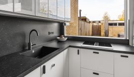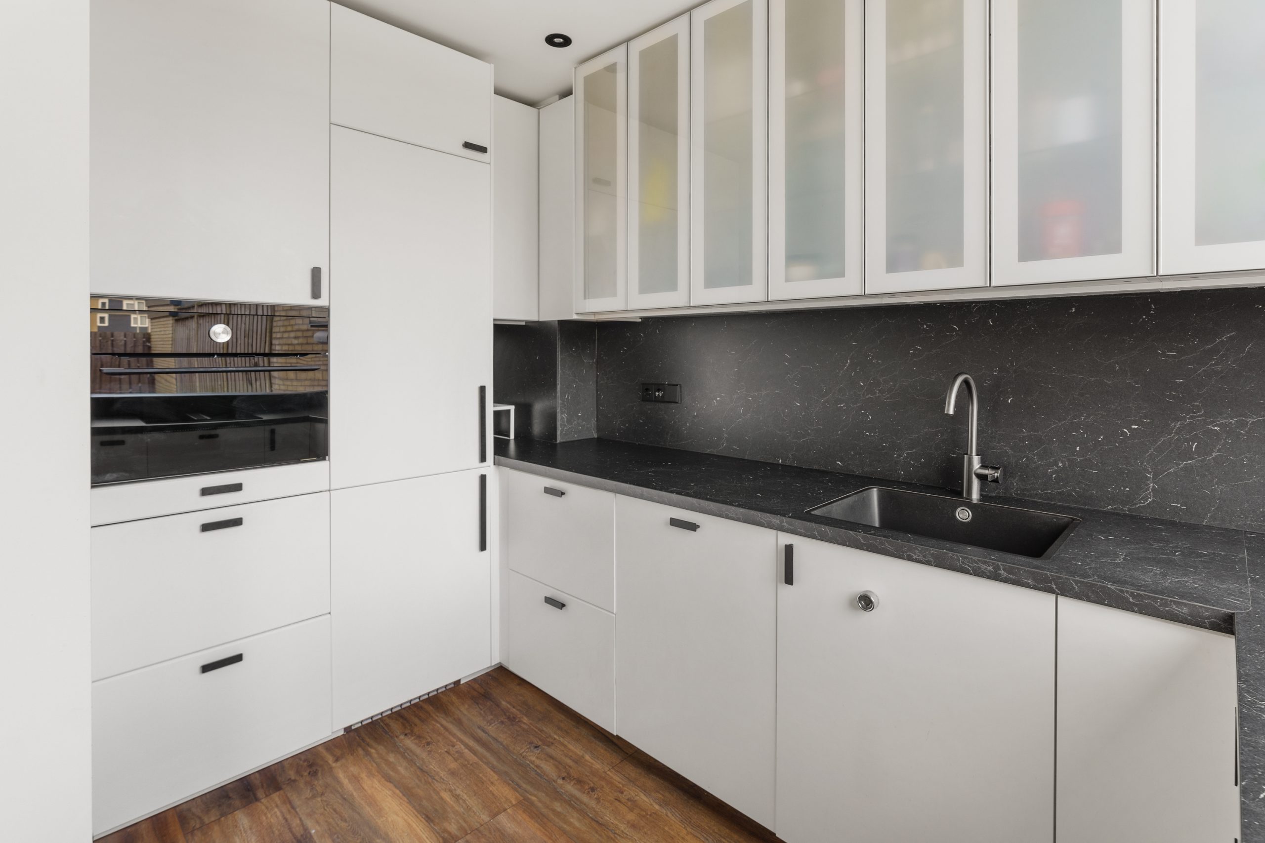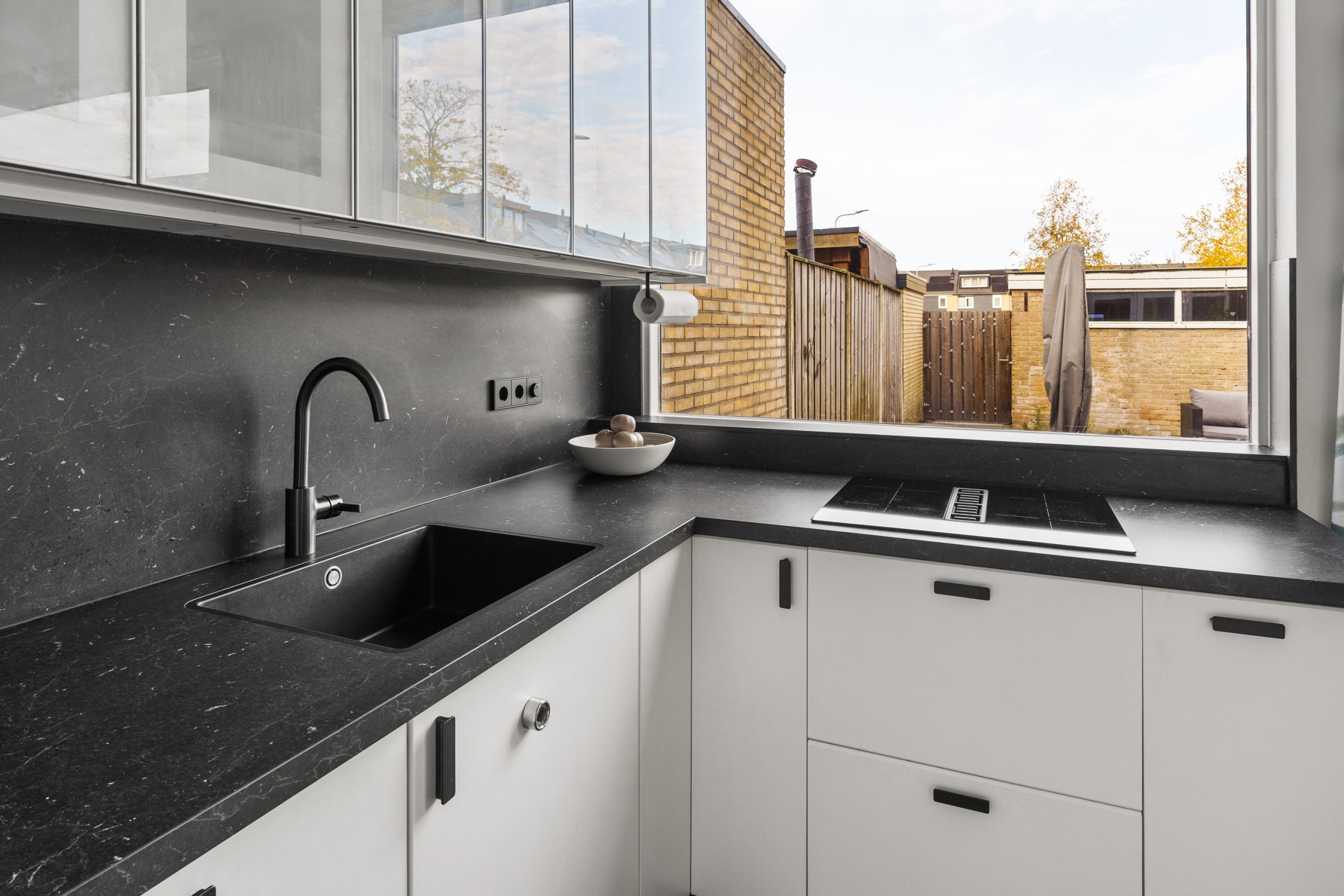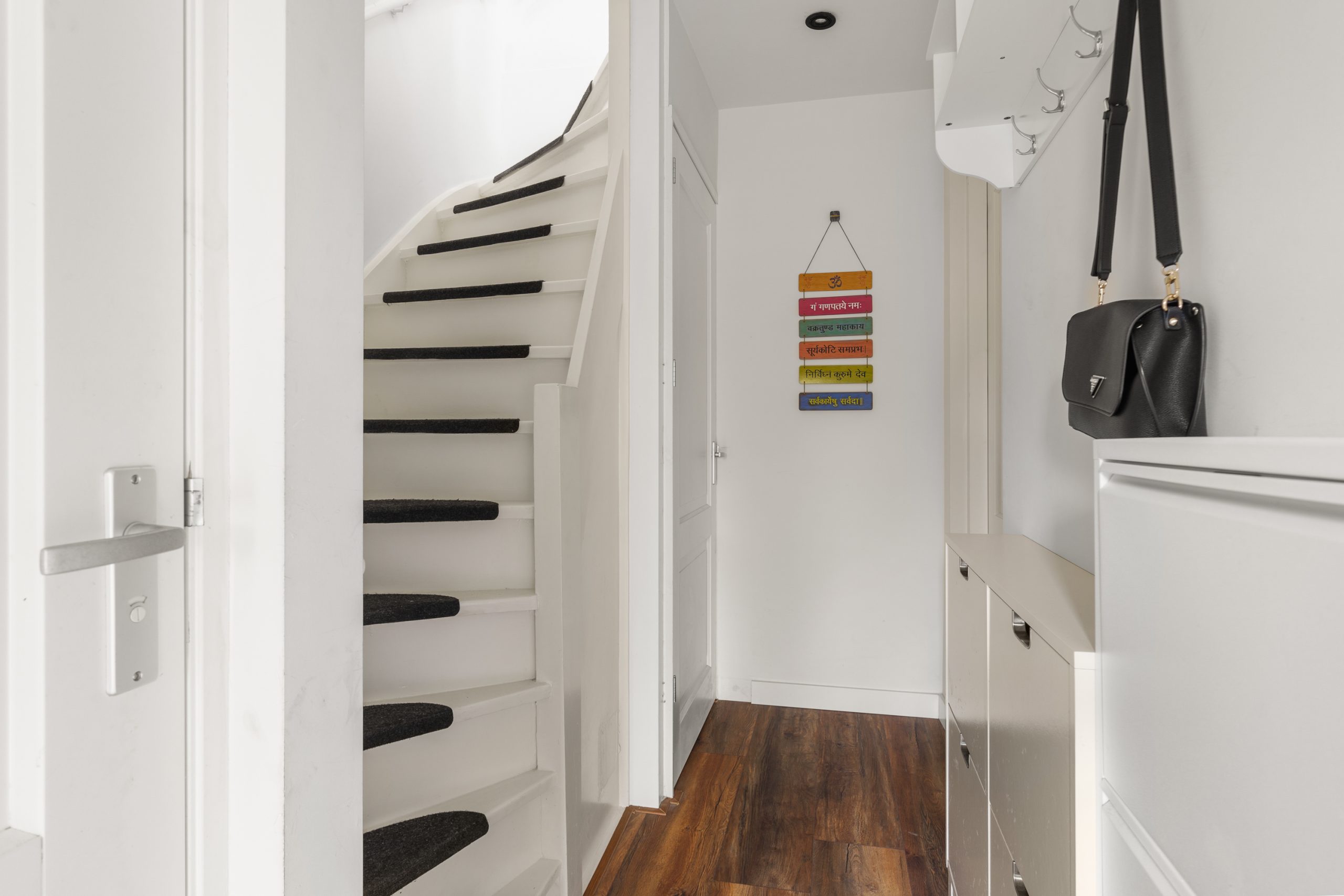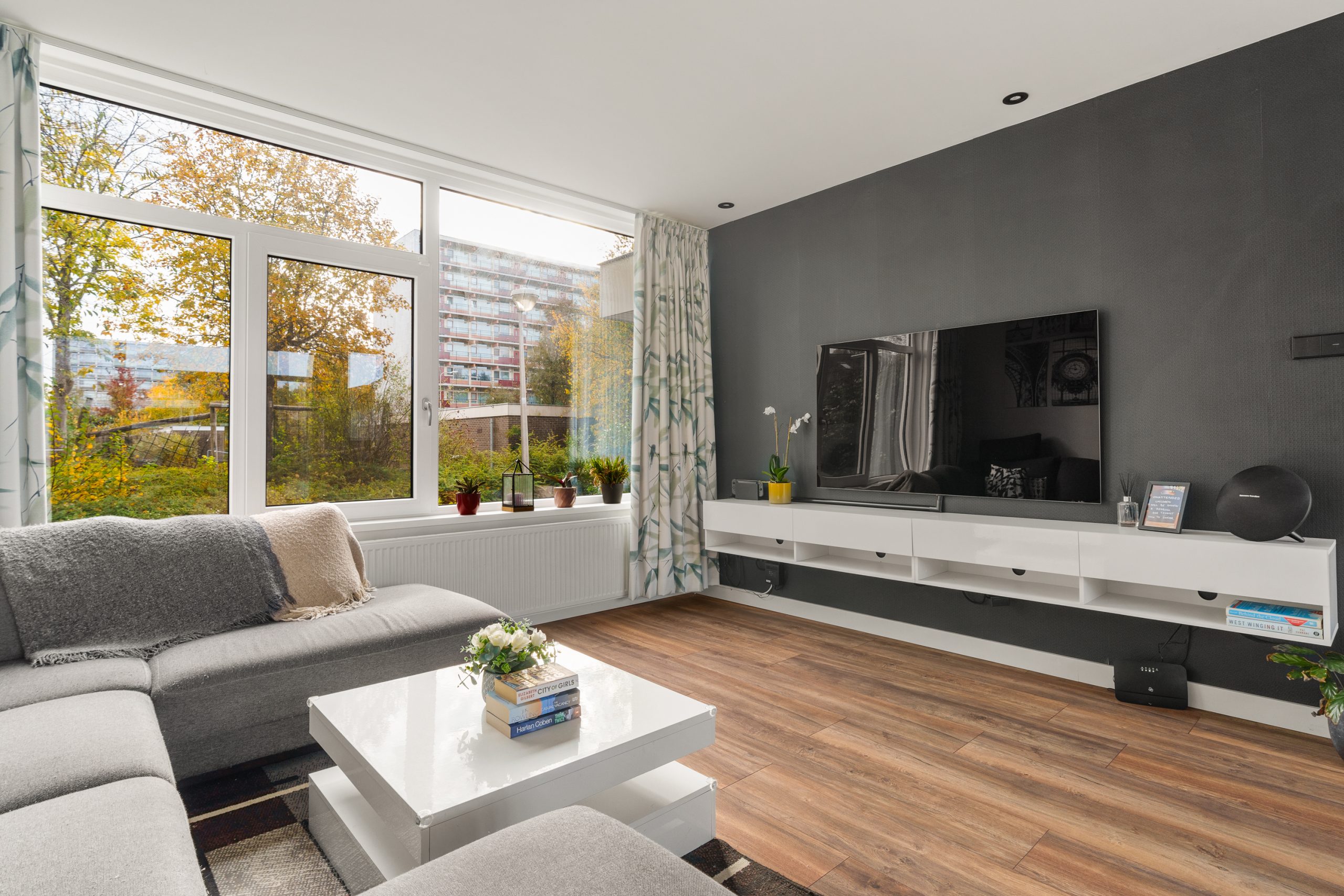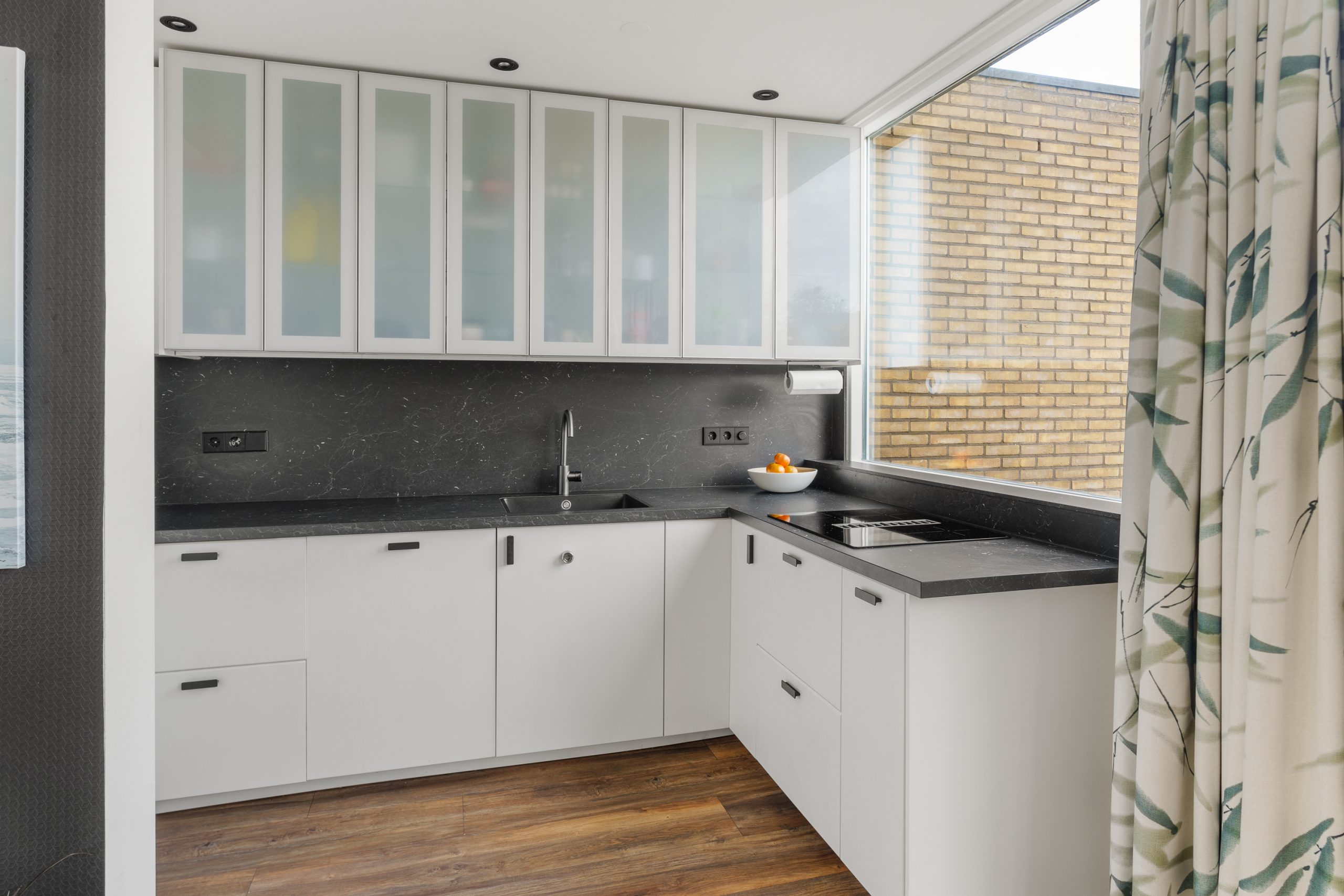 Entree met luifel, hal met 3 nieuwe binnendeuren, meterkast, trapopgang met trapkast en een luxe hangend toilet met fonteintje. De ruime doorzon-woonkamer heeft strakke stucwanden, stucplafonds en vrij uitzicht op het groen aan de voorzijde en een brede glaspui met openslaande tuindeuren naar het terras aan de achterzijde. Mensen met groene vingers zullen weinig moeite hebben om wat groen aan de tuin toe te voegen, simpel door het verwijderen van een paar tegels. Aan de tuinzijde bevindt zich ook een moderne open hoekkeuken (2023) met veel kastruimte, complete inbouwapparatuur en een kastenwand. Boven het aanrecht bevindt zich een heerlijk groot raam voor daglicht.