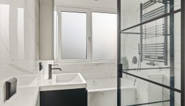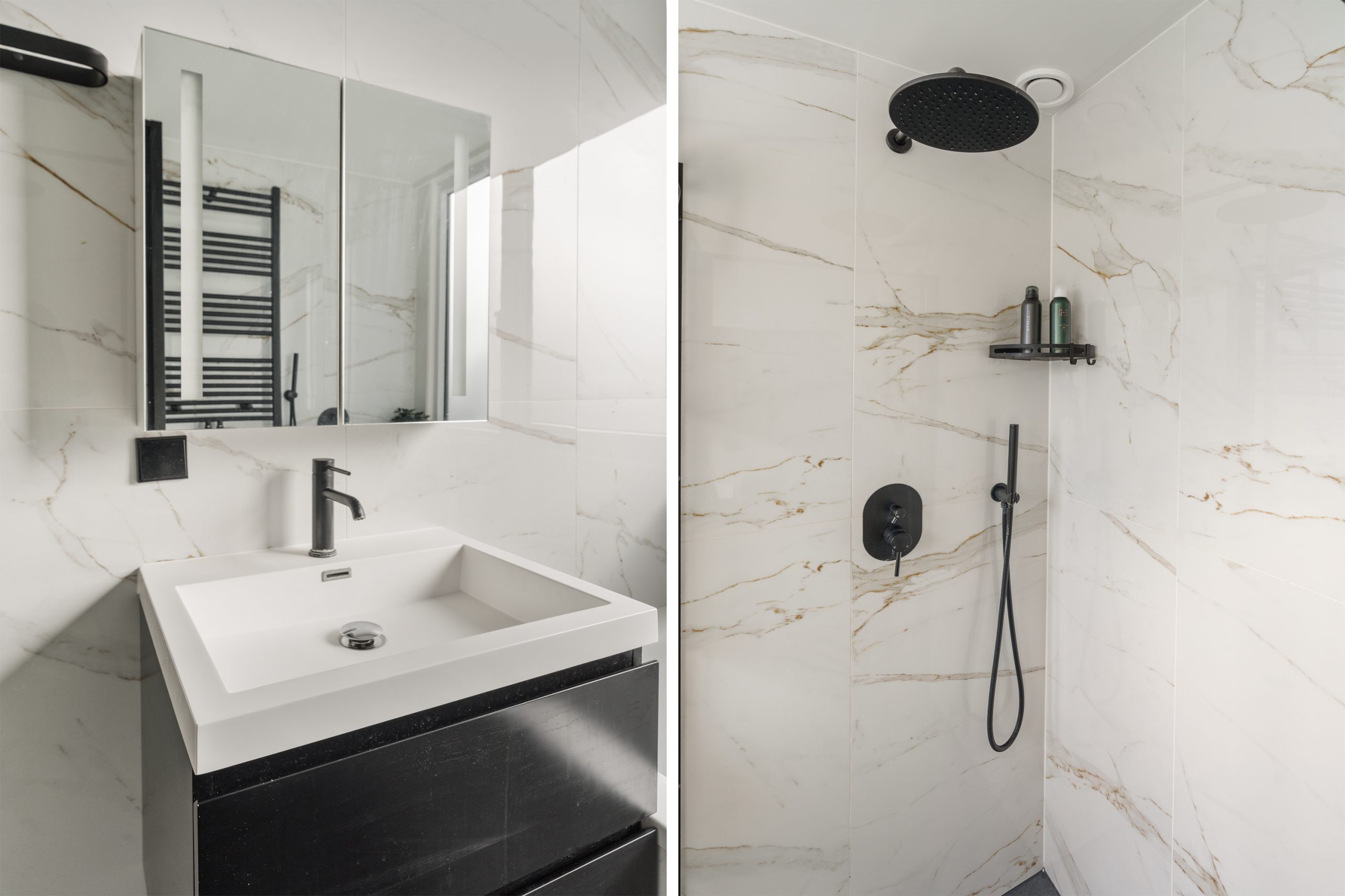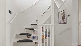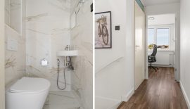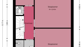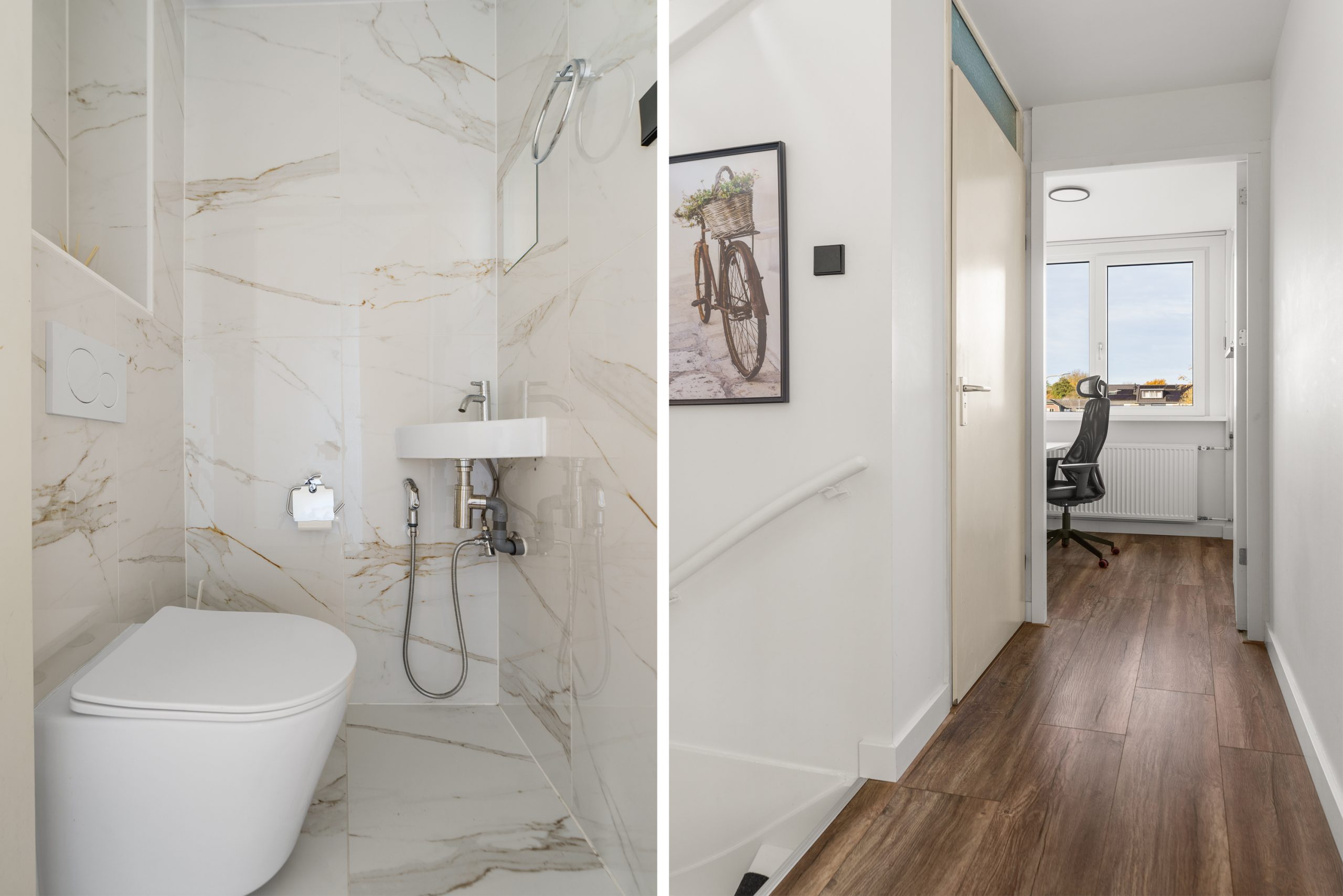 Overloop met separaat hangend toilet en toegang tot een drietal ruime slaapkamers. De nieuwe kunststof ramen met HR++ glas zorgen daarbij voor een hoog wooncomfort. De luxe badkamer is voorzien van ligbad, douchecabine met regendouche, wastafelmeubel, designradiator en een gevelraam. De gehele etage is voorzien van nieuwe stucwanden en -plafonds.