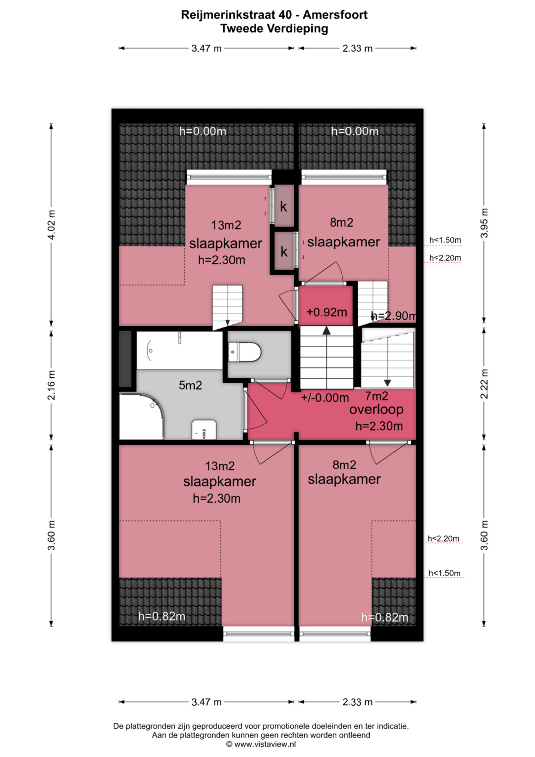 Ruime hoofdslaapkamer voorzien van schuifkastenwand met wastafel; 2e slaapkamer, voorzien van nieuw laminaat. Een klein trapje voert naar 3e en 4e slaapkamer, beide met een dakkapel voorzien van nieuwe kunststof kozijnen met HR++ glas. Daar tegenover ligt een nette badkamer met ligbad, douchecabine en wastafel met daarnaast een separaat toilet.