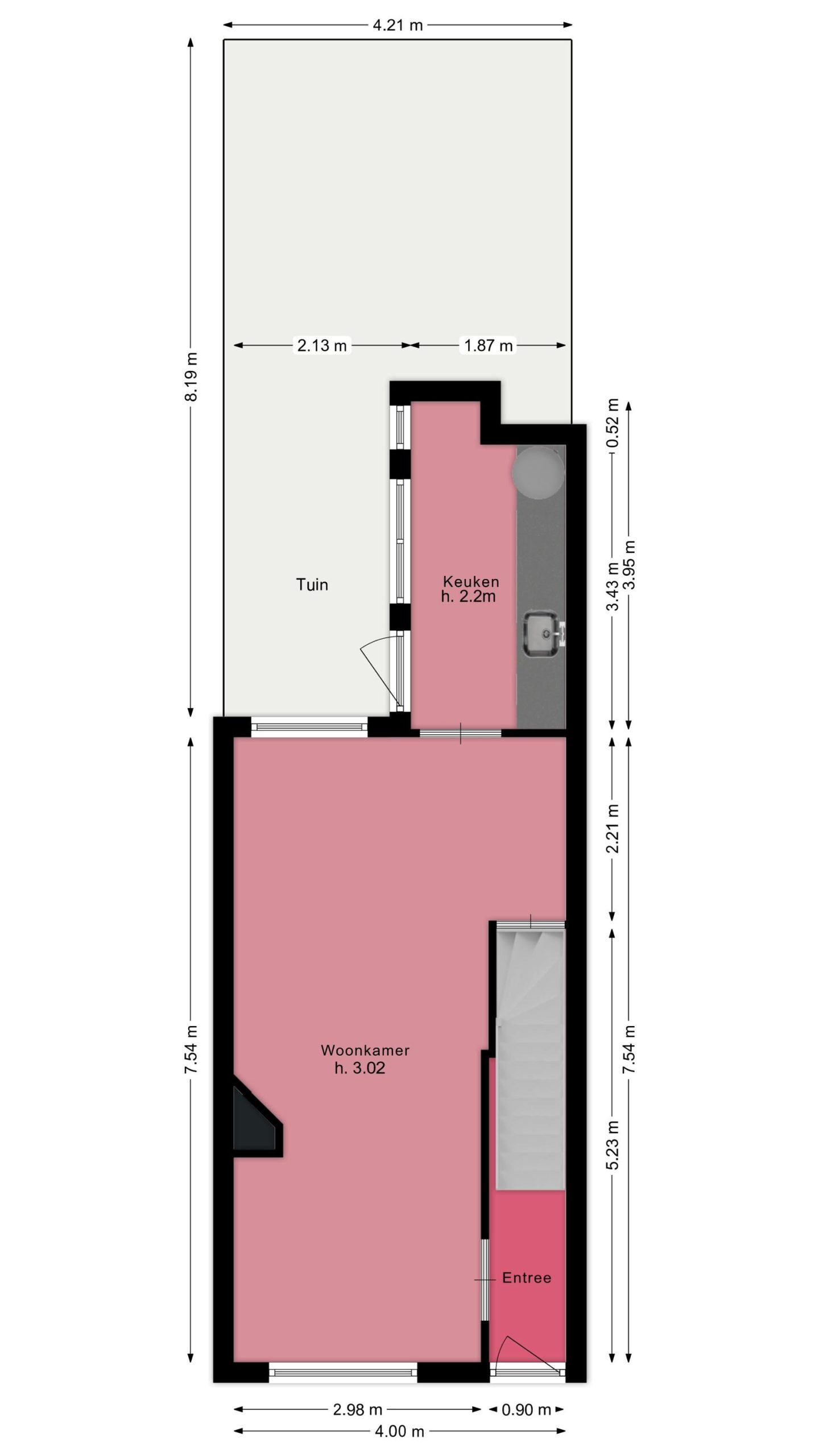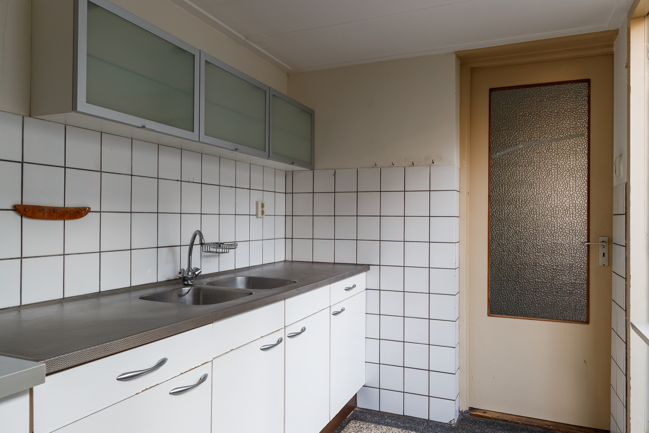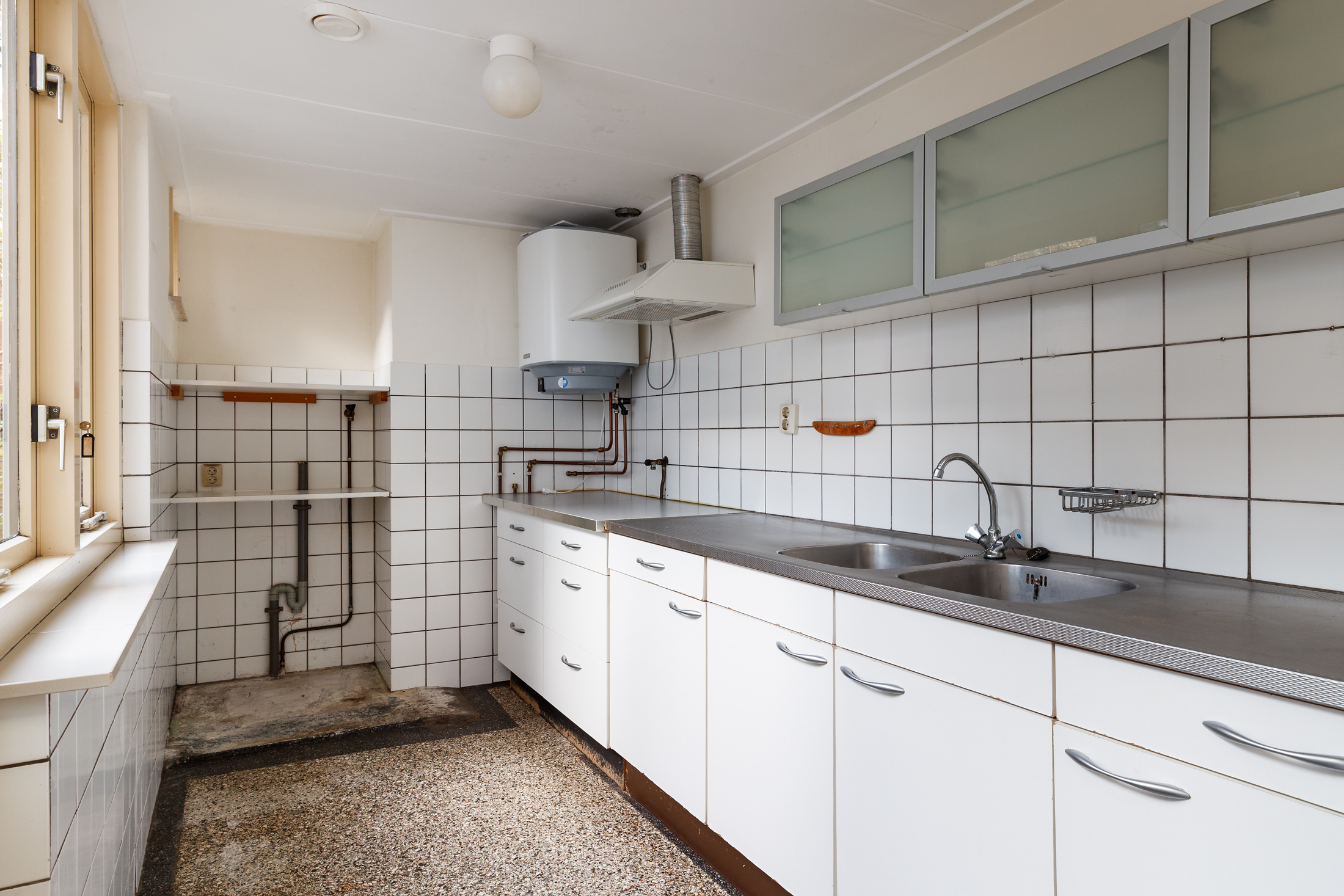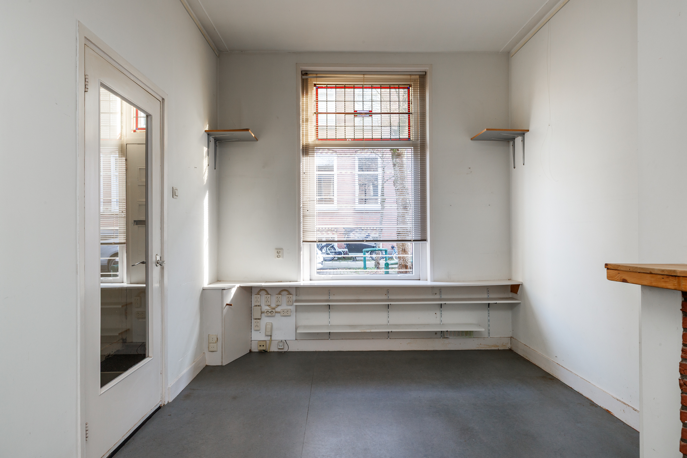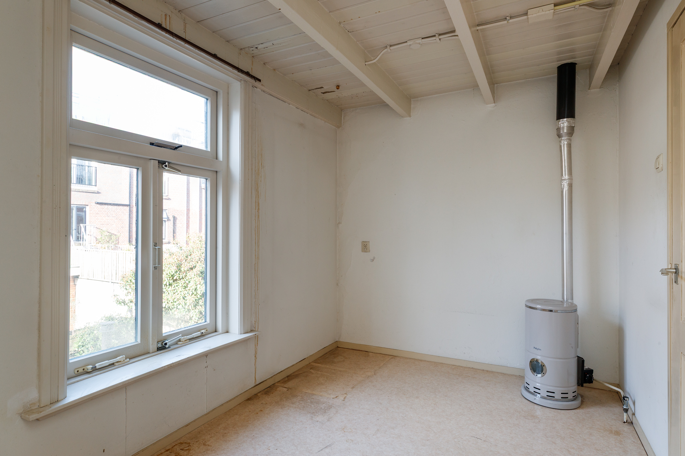 Entree/hal met glas-in-loodraam en trapopgang naar de eerste verdieping. Ruime woonkamer met hoog plafond, glas-in-loodraam, schouw en trapkast. In de uitbouw aan de achterzijde vind je de keuken, die voorzien is van een mooie granitovloer en licht is door de grote raampartij. Daarnaast vind je de elektrische boiler in de keuken en bereik je via de keukendeur de achtertuin.