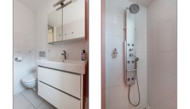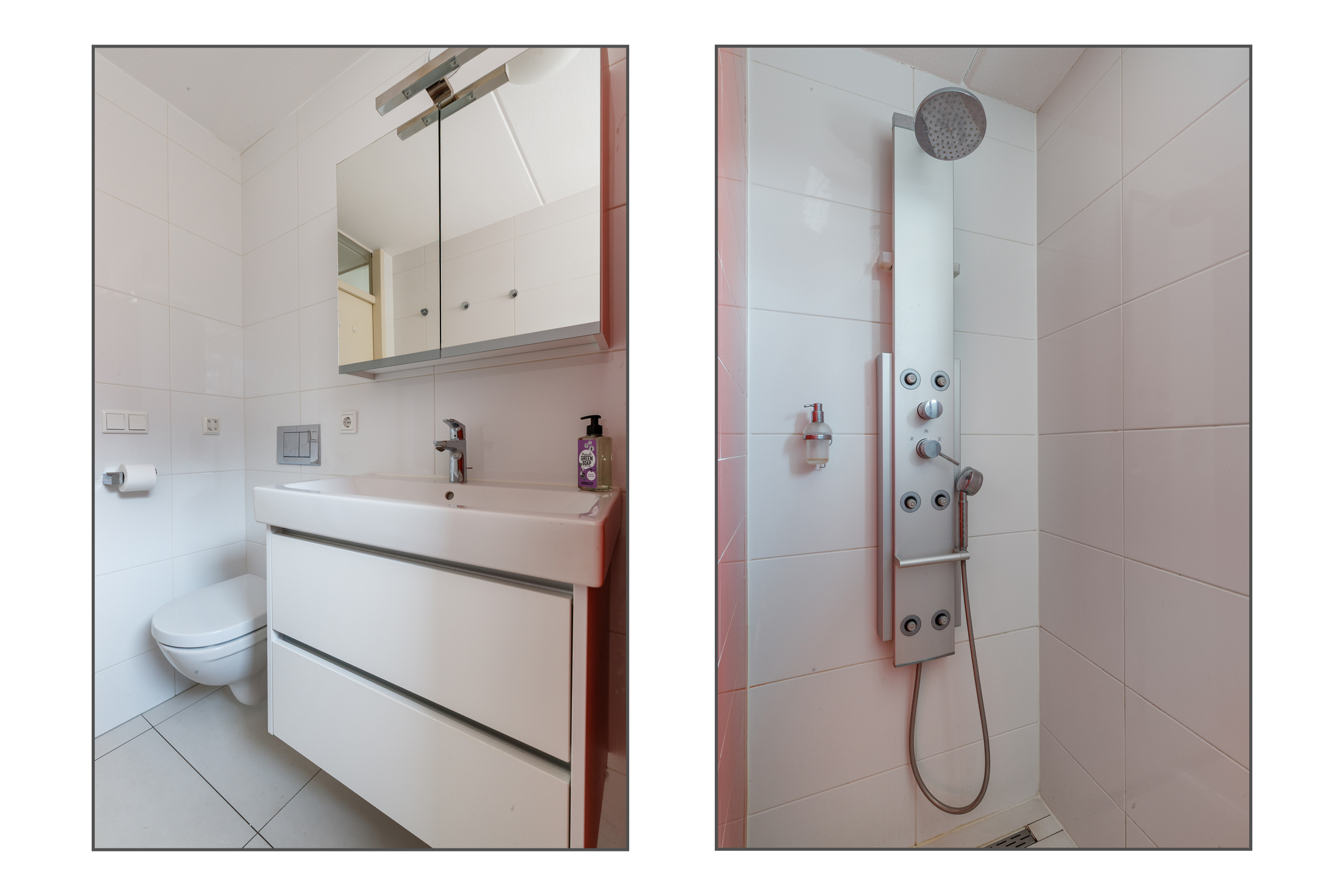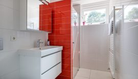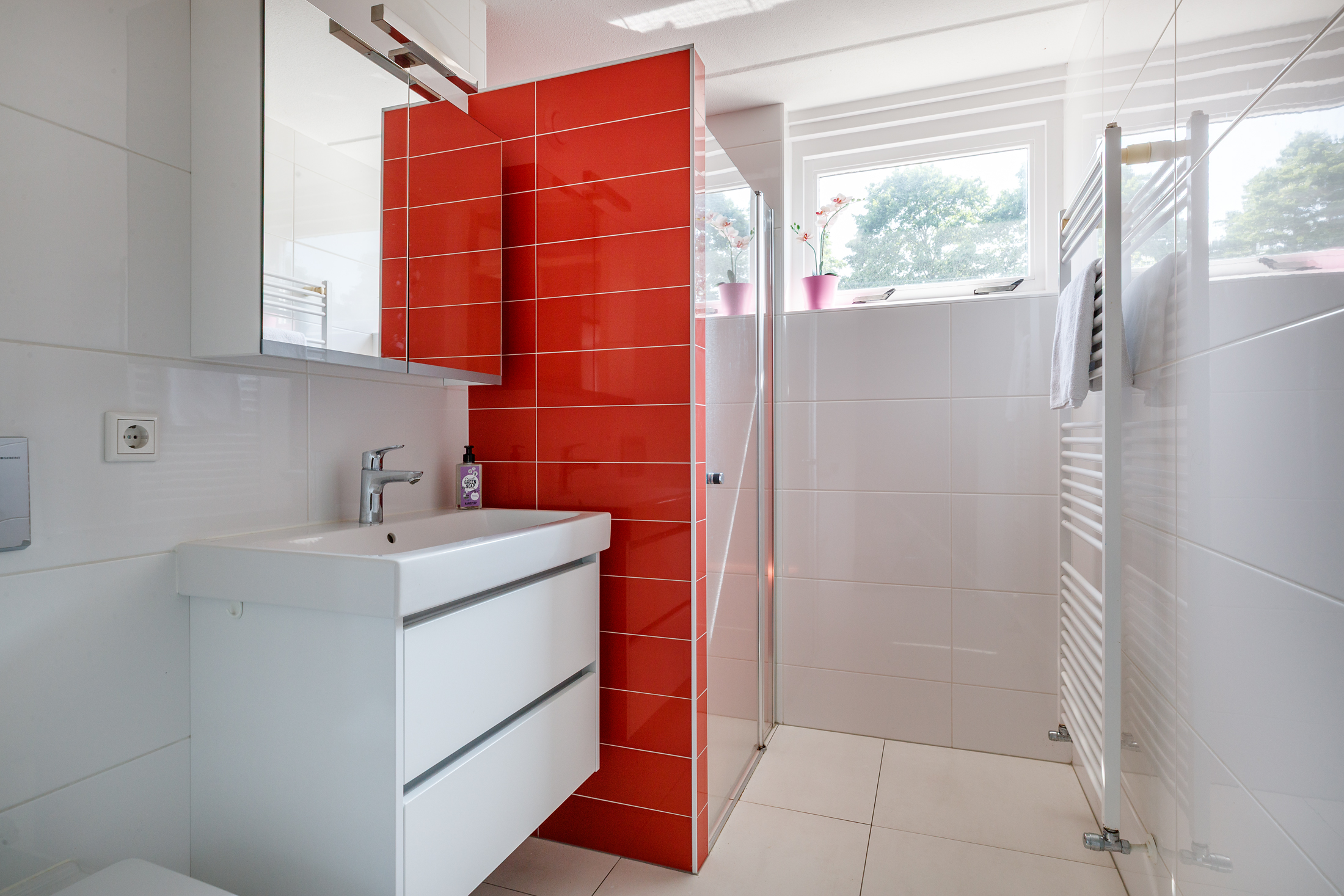 Overloop. Drie slaapkamers. Moderne badkamer met tweede toilet, wastafelmeubel, handdoekradiator en inloopdouche.