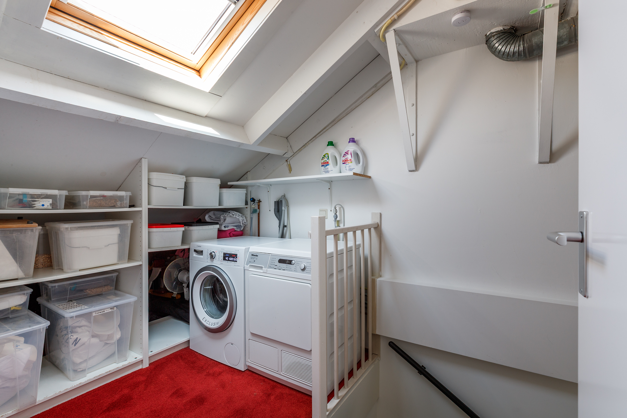 Overloop met aansluitingen voor wasmachine en droger en bergruimte. Ruime en lichte slaapkamer met vaste kastenwand en 2 dakramen.